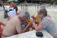 Strand war so lang und gross dass wir unsere einige Palmen und Schatten entscheiden könnten. Wir hatten für uns Tische und Strandstühlen. Ab und zu kam „Super-Koko", der auf eine Palm für uns sogar kletterte um für uns ein Koko drunten zu holen und es öffnete. Wir hatten Bedienung am Strand, die die frische Fische uns zeigten um zu entscheiden welche wir später zum Essen wollten. Es war unvergesslich. Benjamin kauft auch einen Gummiball und wir spielten auch Wasser-Volleyball. Nach dem Essen überraschte uns Stefan mit 3 Eimer, mit dem er ein leckeres Sangria mit frischen Früchten machten. Und nun kam das ersten von 2 Wettbewerbe. Wir teilten uns in 3 Gruppe und jeder mit einem Sangria Eimer. Die erste Gruppe den Eimer Sangria auszutrinkt, gewinnt. Wir haben uns kapputt gelacht da die Gruppe mit Werner und wenige Teilnehmer gewann;) Zweite Wettbewerb war die typische Lauf mit einem Ei auf einem Löffel im Mund. Die einheimeische haben Sie mit uns richtig amusiert.