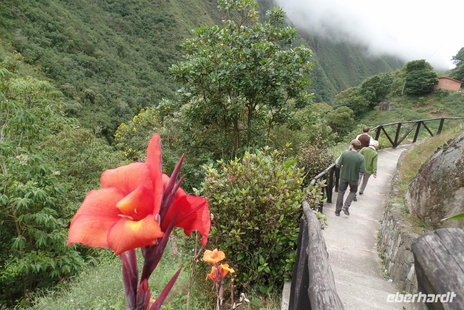 Pflichtstopp des Tages hier oben ist die Lagune von Mucubají. Von hier aus unternahmen 2 von uns einen etwas abenteuerlichen Ausritt mit kleinen Andenpferden. Über Stock und Stein führen uns die Pferde bergauf und -ab bis zur Lagune. Die Pferde sind temperamentvoll, aber artig. Die weniger Abenteuerlustigen spazierten den gleichen Wanderweg entlang auf den eigenen Füßen bis zu einem Aussichtspunkt auf eine wegen Nebel unsichtbare Lagune und haben genug Zeit, die Flora der Umgebung zu bestaunen. Da die Reitstrecke kürzer war, kamen die 2 Pferdreiterinnerin den Wanderern auf halber Strecke entgegen. Anschließend stärken wir uns beim Mittagessen in einem kleinen Restaurant. Wir tranken noch einen Kaffee und bummelten noch die Souvenirs-Laden, bevor wir die restliche Strecke bis Santo Domingo zurücklegen.