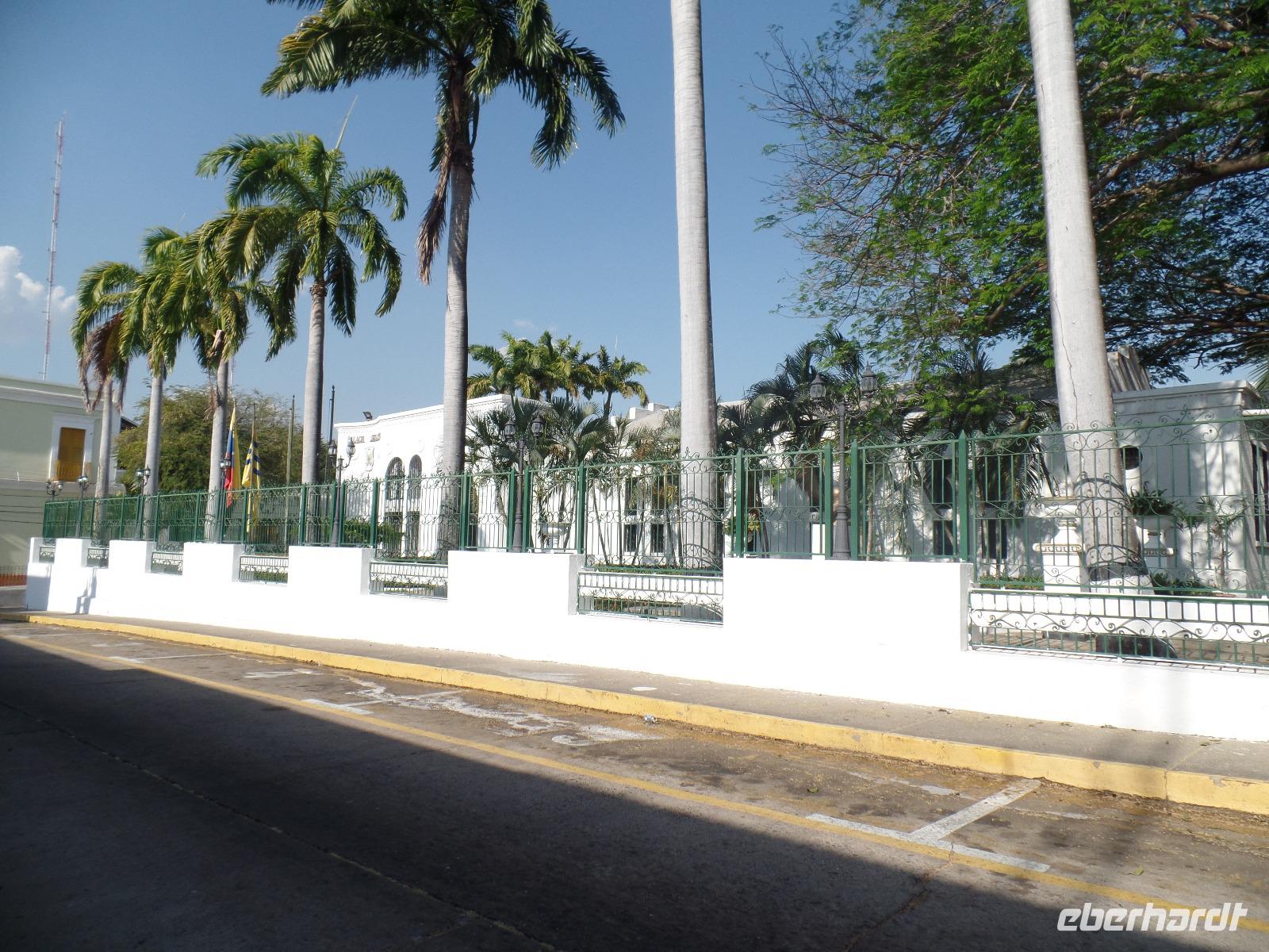 Am Nachmittag begrüßen wir Claudine, die uns die Stadt während einer Führung näher bringen möchte. In zwei Jeeps fahren wir zum höchsten Punkt der Stadt und steigen am Square Mirandar aus. Hier erzählt uns Claudine die Geschichte der Stadt, die eng mit Herrn Mirandar verbunden ist. Auch die Bedeutung der venezulanischen Flagge vergießt sie nicht. Von dem Platz hier oben können wir auch einen Blick auf den Botanschen Garten erhaschen. Nun laufen wir gemeinsam die Straße hinab und schauen uns farbenprächtige Herrenhäuser und Regierungsgebäude von außen an. In eines der Regierungsgebäude dürfen wir sogar in die Eingangshalle hinein, wo Claudine noch ein wenig mehr zur Stadtgeschichte und zum gemeinsam geplanten Staat Südameria sowie deren Symbolik erzählt. Der Square Bolivar ist ein wenig anders als der in anderen Städten, den hier sind zusätzlich zur Büste Denkmäler zu den einzelnen Staaten aufgebaut, die mit zum gemeinsamen Staat gehören sollten. Als wir uns um den Square genauer umblicken, sehen wir erneut, wie sehr Hugo Chavez auch drei Jahre nach seinem Tod noch verehrt wird. Naja.....wir gehen nun noch in die Kirche und schauen uns diese an. Claudine erzählt uns noch die dazugehörige Geschichte zur Eislady, die eng mit der Geschichte von Rom zusammenhängt. Wir enden den Rundgang am Hafen und besteigen ein Boot, mit dem wir auf dem Orinoco bis zur alten Brücke fahren. Wir unterqueren diese und auch hier läßt uns Claudine an ihrem Wissen teilhaben. Wir sehen der untergehende Sonne von der Dachterrasse aus zu und genießen zum Abschluss des Tages unser Abendessen im hoteleigenen Restaurant.