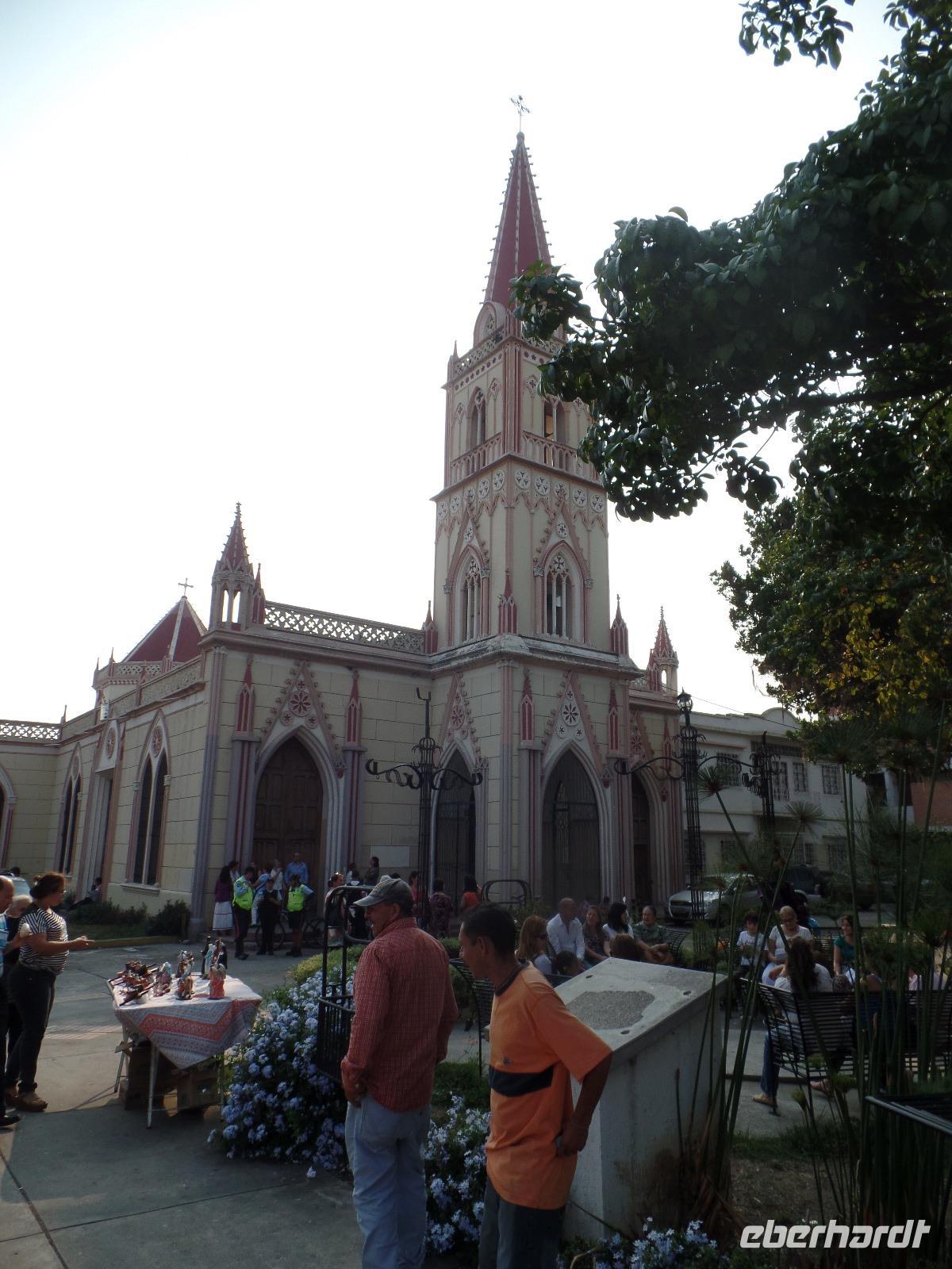 Nachdem wir unsere Koffer im Bus verstaut haben, fährt uns Lucio erneut in die Innenstadt von Merida, wo wir den hiesigen Markt besuchen. Besonders das Erdgeschoss ist propevoll und wir fragen uns, wer all den Klimbim, der hier angeboten wird, kauft? In einem Teil des Marktes werden dann aber auch Lebensmittel wie Obst, Gemüse und Gewürze verkauft. Es ist zum Teil schon recht interessant, wie sich hier das Leben so abspielt. Bevor wir die Stadt verlassen, halten wir noch an einer Kirche, in der wir das Ende der Karfreitags-Messe miterleben dürfen. Danach geht es weiter in die Anden und wir schlengeln uns mit zahlreichen venezolanischen Oster-Touristen den Pass hinauf. Hinter jeder Kurve eröffnet sich uns ein neuer wunderschöner Blick und wir passieren viele kleine Ortschaften. In einer davon halten wir, um uns die besonders Steinkirche von Herrn Sanchez anzuschauen. Diese wurde aus vielen kleinen Steinen errichtet, die hunderte von Kilometern mit Maultieren über die Anden hierher gebracht wurden. Herr Sanchez und seine Lebensgefährten wurden schließlich in ihrer Kirche beerdigt. Daneben befindet sich ihr Wohnhaus, das wir uns auch anschauen dürfen. Nach unserer Mittagspause erreichen wir den höchsten Punkt für den heutigen Tag: wir befinden uns 4.220 Meter über den Meeresspiegel. Da muss natürlich ein Fotoshooting stattfinden. Nachdem alle Fotos im Kasten sind, fahren wir ein Stück zurück, bevor wir dann in Richtung Santo Domingo abbiegen. Wir halten an einer Lagune und spazieren bis zum Aussichtspunkt, von dem wir diese wunderschön sehen und fotografieren können. Die Landschaft erinnert uns ein wenig an Zuhause, an den Schwarzwald. Am späten Nachmittag erreichen wir unser Hotel „la Trucha Azul", was übersetzt „Blaue Forelle" bedeutet. Und genau diese bekommen wir zum Abendessen auch serviert. Sehr lecker....