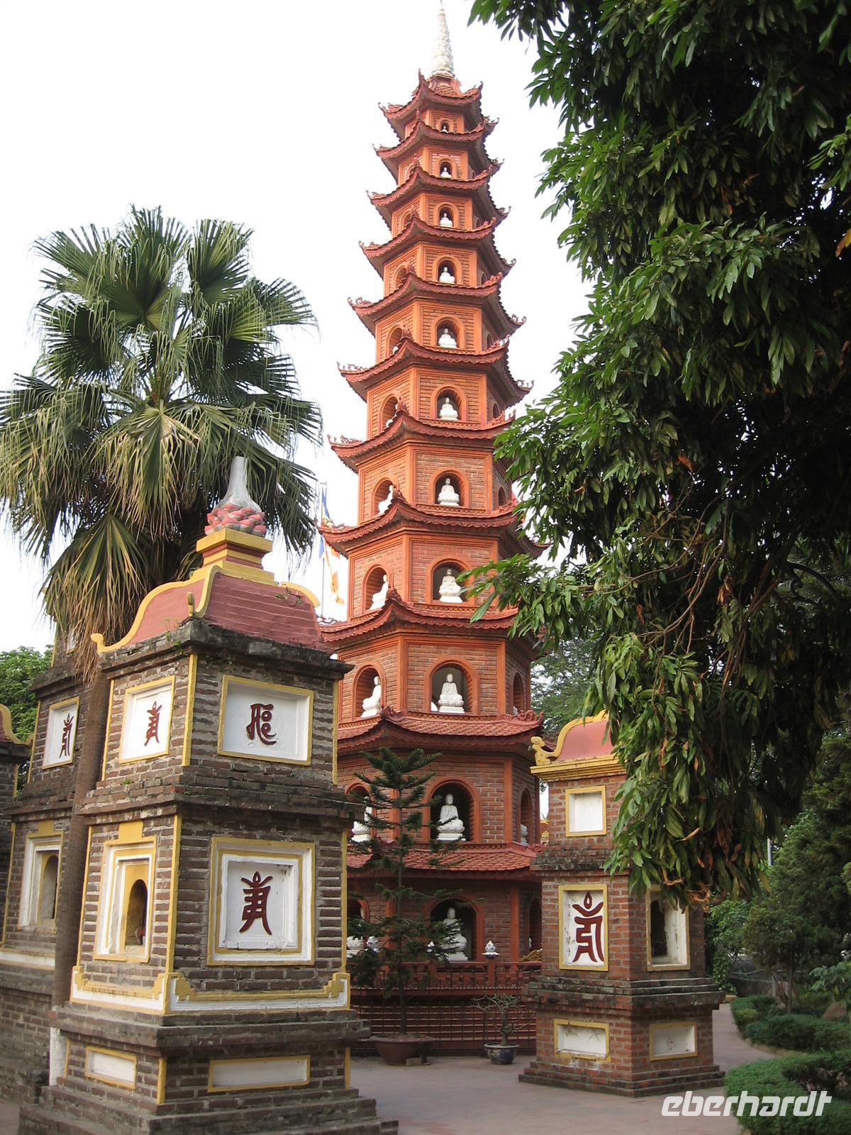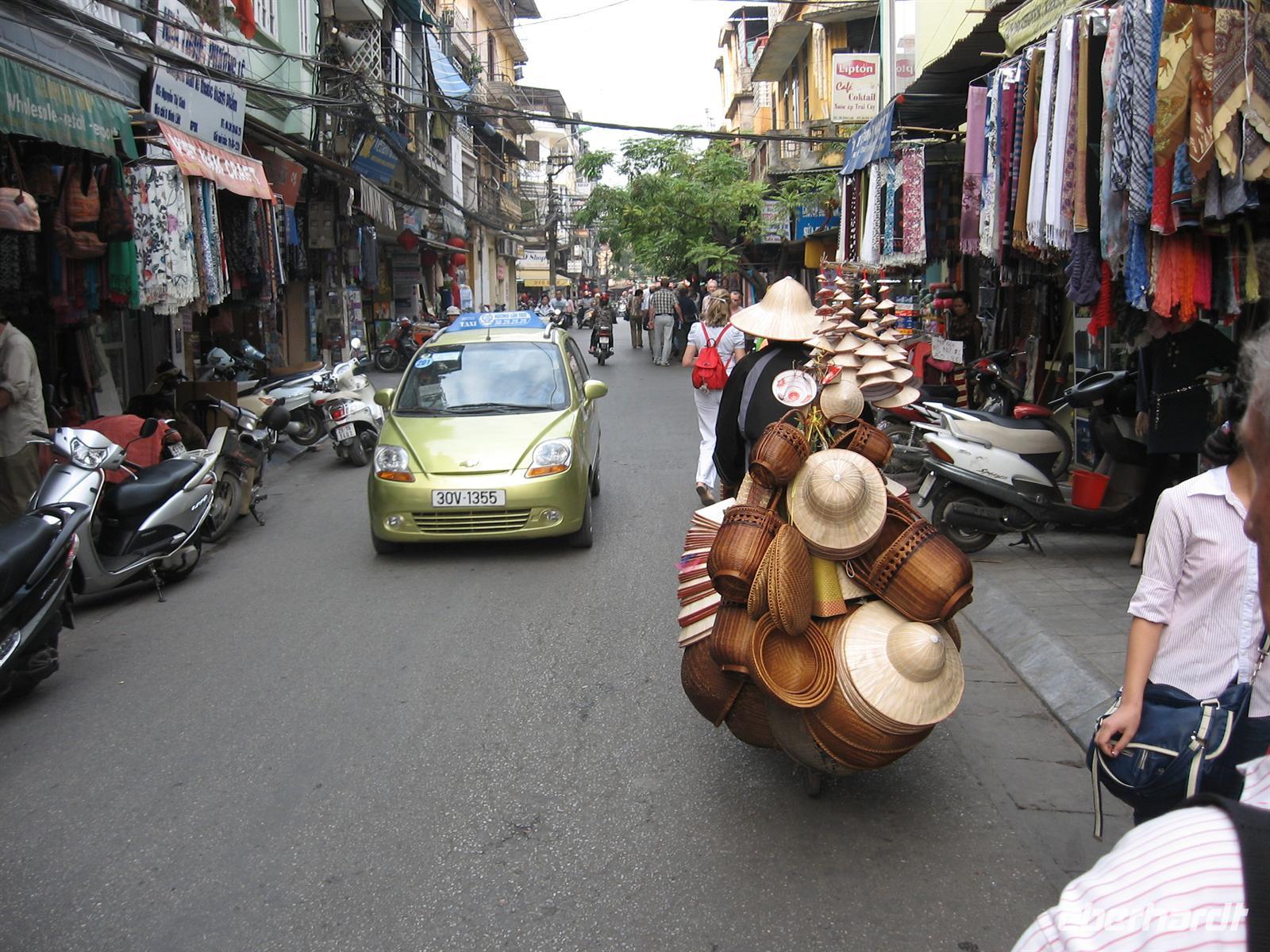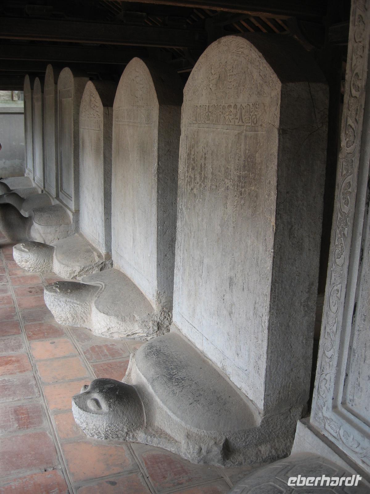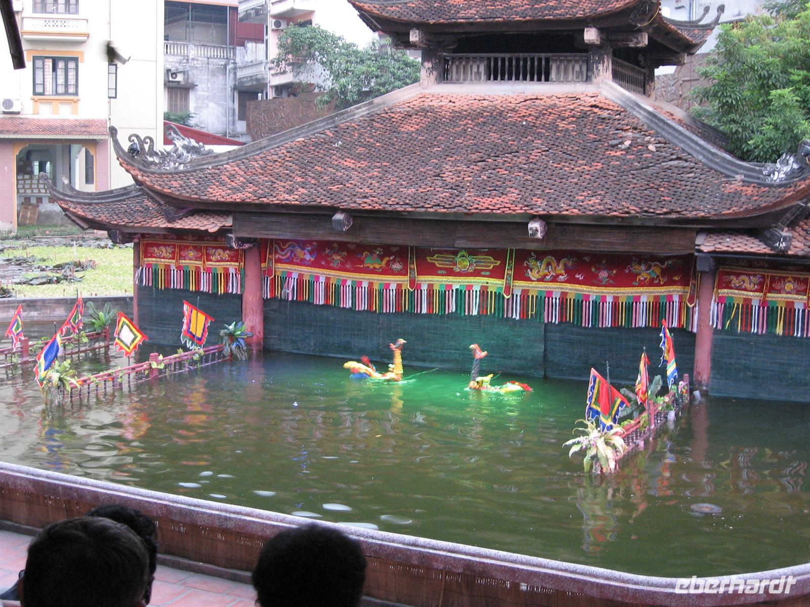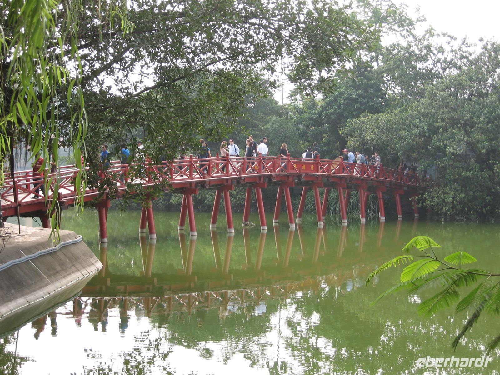 welcher ein Konfuzianisches Heiligtum ist und die erste Universität Vietnams war. Am heutigen Tag waren sehr viele junge Männer und Frauen hier. Anlass war wohl der Auftakt des letzten Studienjahres. Interessant ist unter anderem der Stelenhof. Hier finden sich zu beiden Seiten steinerne Schildkröten, die steinerne Stelen tragen. Sie sind sehr wertvoll, denn hier findet man in Stelen die Namen der Absolventen aus dem Jahr 1036. Als sich ein Gast auf einer der Schildkröten nieder setzt wird er von einem Aufseher sofort zu recht gewiesen. Auf etwas Heiliges darf man sich nicht setzen. In Vietnam unterscheidet man zwischen Tempel und Pagode. Im Tempel werden berühmte Personen verehrt, so gibt es im Land auch Ho Chi Minh Tempel und eine Pagode ist immer ein buddhistisches Heiligtum. Vom Literaturtempel fahren wir ein Stück mit dem Bus, dann warten schon Fahrradrikschas auf uns. Die Rikscha stammt aus Japan, wenn auch ihr Erfinder ein Europäer war. Der Name kommt aus dem japanischen und setzt sich wie folgt zusammen: , jin = Mensch, riki = Kraft, sha = Wagen. Die Fahrt durch die belebten Straßen ist ein Abenteuer und manchmal möchte man die Luft anhalten, wenn von links und rechts die Mopeds heran sausen. Unsere Fahrt endet an einem kleinen Restaurant, wo wir uns eine typische Nudelsuppe zum Mittagessen gönnen. Mit oder ohne Fleisch kostet die Suppe ein wenig mehr wie einen Euro. In einem Kaffee probieren wir dann noch typischen Kaffee, allerdings sind die Bedienkräfte mit der Menge an bestellten Kaffee doch etwas überfordert. Am Hoan Kiem See besuchen wir dann den Jadeberg-Tempel, welcher aus dem 14. Jh. stammt. Gewidmet ist er vier Persönlichkeiten, dem General Tran Hung Dao, dem Gott der Literatur Van Xuong, dem Physiker La To und dem Krieger Quan Vu. Um zum Tempel im See zu gelangen geht man über die The-Huc-Brücke, welche wegen ihres romantischen Aussehens auch „Ort wo sich die Morgensonne ausruht“ genannt wird. Zu Fuß geht es dann durch die Gassen der Altstadt mit ihren zahlreichen Geschäften. Eigentlich handelt jeder Bewohner mit etwas oder er ist Handwerker und hat eine Werkstatt gleich im Haus. Die Häuser sind immer sehr schmal gehalten, dafür aber nach hinten sehr tief. Die Steuern wurden früher nach der Größe der Ladenfront berechnet und so konnte man gut Steuern sparen. Es wird alles gehandelt, es gibt nichts was es nicht gibt. Am Westsee besichtigen wir die Tran-Quoc-Pagode, welche ihren Ursprung bereits im 6. Jh. hat. Hier ist vor allem der Stupa-Garten und der elfstöckige Pagodenturm beeindruckend. Zum Abschluss des Tages besuchen wir noch ein Wasserpuppentheater. Diese alte vietnamesische Tradition hat sich bis in unsere heutigen Tage erhalten. Mit farbenfrohen Puppen und Figuren, welche wie aus dem Nichts aus dem Wasser auftauchen, werden Szenen aus dem vietnamesischen Alltag dargestellt. Zu Abend essen wir im Restaurant Koto. Diese Gaststätte wurde von einem australischen Hilfsprojekt gegründet und ermöglicht sehr armen Kindern eine Ausbildung in der Gastronomie. Das Essen schmeckt wieder fabelhaft. Zum Nachtisch gibt es außer Obst auch noch eine Geburtstagstorte, denn Frau Steger feiert heute ihren großen Tag.