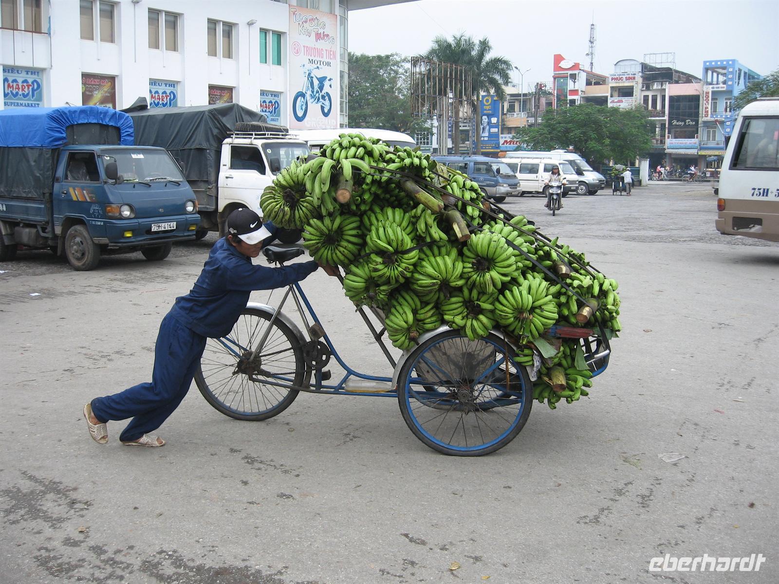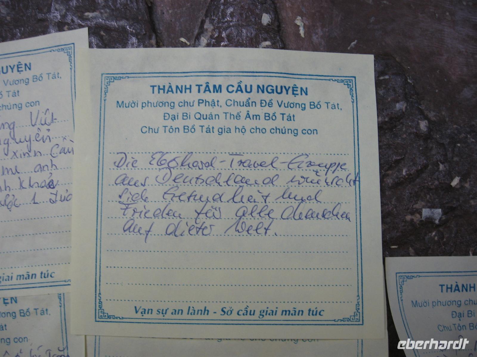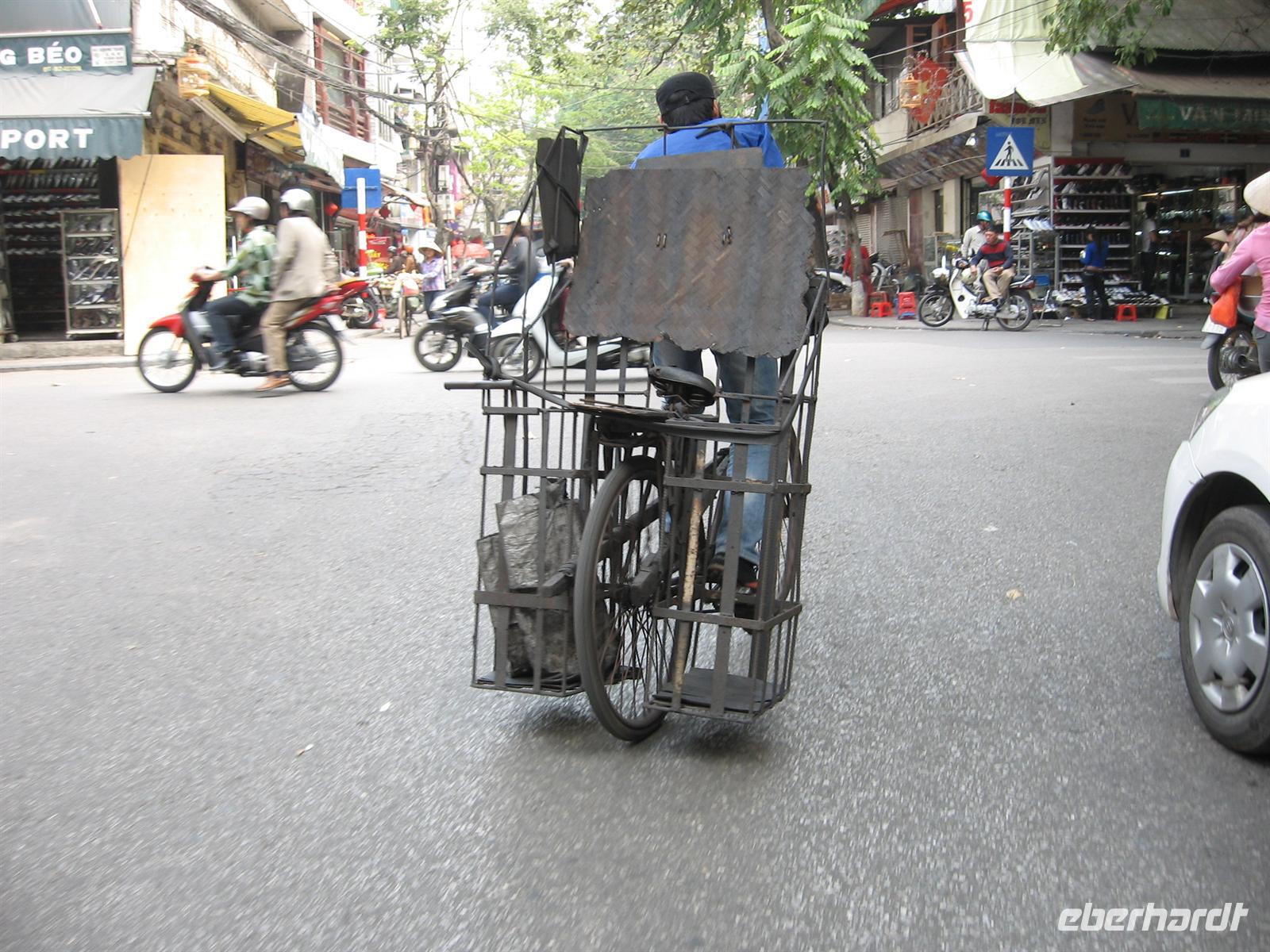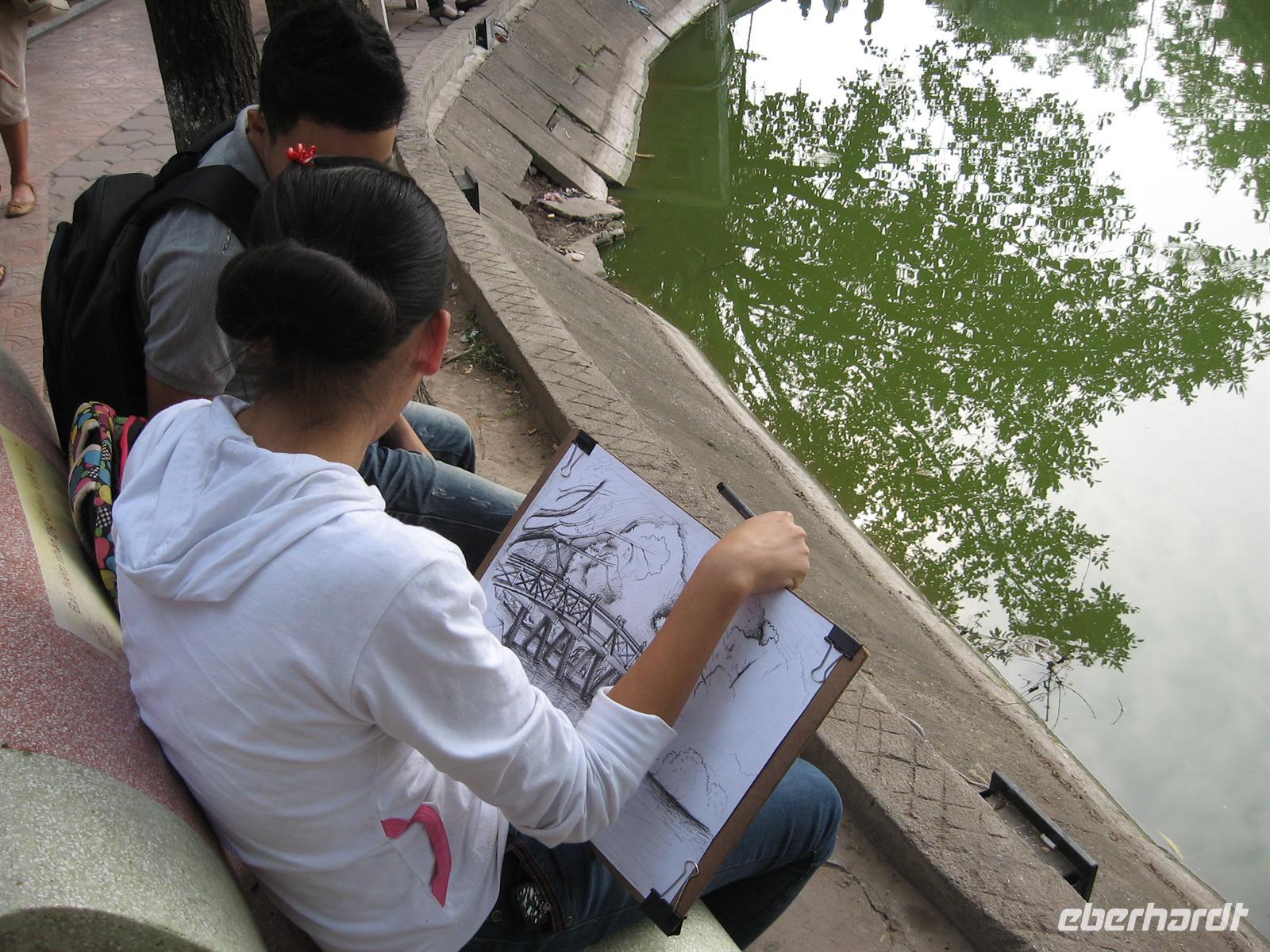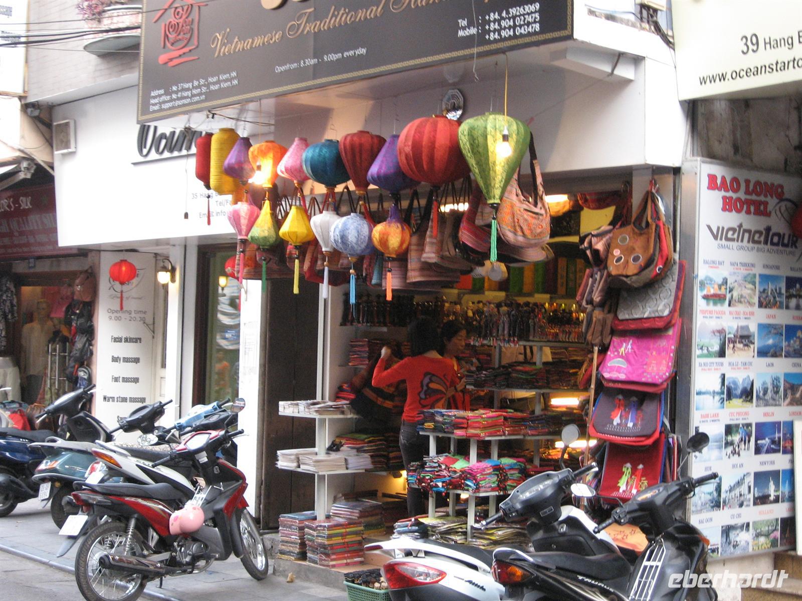 welcher ein Konfuzianisches Heiligtum ist und die erste Universität Vietnams war. Am heutigen Tag waren sehr viele junge Männer und Frauen hier. Anlass war wohl der Auftakt des letzten Studienjahres. Interessant ist unter anderem der Stelenhof. Hier finden sich zu beiden Seiten steinerne Schildkröten, die steinerne Stelen tragen. Sie sind sehr wertvoll, denn hier findet man in Stelen die Namen der Absolventen aus dem Jahr 1036. Als sich ein Gast auf einer der Schildkröten nieder setzt wird er von einem Aufseher sofort zu recht gewiesen. Auf etwas Heiliges darf man sich nicht setzen. In Vietnam unterscheidet man zwischen Tempel und Pagode. Im Tempel werden berühmte Personen verehrt, so gibt es im Land auch Ho Chi Minh Tempel und eine Pagode ist immer ein buddhistisches Heiligtum. Vom Literaturtempel fahren wir ein Stück mit dem Bus, dann warten schon Fahrradrikschas auf uns. Die Rikscha stammt aus Japan, wenn auch ihr Erfinder ein Europäer war. Der Name kommt aus dem japanischen und setzt sich wie folgt zusammen: , jin = Mensch, riki = Kraft, sha = Wagen. Die Fahrt durch die belebten Straßen ist ein Abenteuer und manchmal möchte man die Luft anhalten, wenn von links und rechts die Mopeds heran sausen. Unsere Fahrt endet an einem kleinen Restaurant, wo wir uns eine typische Nudelsuppe zum Mittagessen gönnen. Mit oder ohne Fleisch kostet die Suppe ein wenig mehr wie einen Euro. In einem Kaffee probieren wir dann noch typischen Kaffee, allerdings sind die Bedienkräfte mit der Menge an bestellten Kaffee doch etwas überfordert. Am Hoan Kiem See besuchen wir dann den Jadeberg-Tempel, welcher aus dem 14. Jh. stammt. Gewidmet ist er vier Persönlichkeiten, dem General Tran Hung Dao, dem Gott der Literatur Van Xuong, dem Physiker La To und dem Krieger Quan Vu. Um zum Tempel im See zu gelangen geht man über die The-Huc-Brücke, welche wegen ihres romantischen Aussehens auch „Ort wo sich die Morgensonne ausruht“ genannt wird. Zu Fuß geht es dann durch die Gassen der Altstadt mit ihren zahlreichen Geschäften. Eigentlich handelt jeder Bewohner mit etwas oder er ist Handwerker und hat eine Werkstatt gleich im Haus. Die Häuser sind immer sehr schmal gehalten, dafür aber nach hinten sehr tief. Die Steuern wurden früher nach der Größe der Ladenfront berechnet und so konnte man gut Steuern sparen. Es wird alles gehandelt, es gibt nichts was es nicht gibt. Am Westsee besichtigen wir die Tran-Quoc-Pagode, welche ihren Ursprung bereits im 6. Jh. hat. Hier ist vor allem der Stupa-Garten und der elfstöckige Pagodenturm beeindruckend. Zum Abschluss des Tages besuchen wir noch ein Wasserpuppentheater. Diese alte vietnamesische Tradition hat sich bis in unsere heutigen Tage erhalten. Mit farbenfrohen Puppen und Figuren, welche wie aus dem Nichts aus dem Wasser auftauchen, werden Szenen aus dem vietnamesischen Alltag dargestellt. Zu Abend essen wir im Restaurant Koto. Diese Gaststätte wurde von einem australischen Hilfsprojekt gegründet und ermöglicht sehr armen Kindern eine Ausbildung in der Gastronomie. Das Essen schmeckt wieder fabelhaft. Zum Nachtisch gibt es außer Obst auch noch eine Geburtstagstorte, denn Frau Steger feiert heute ihren großen Tag.