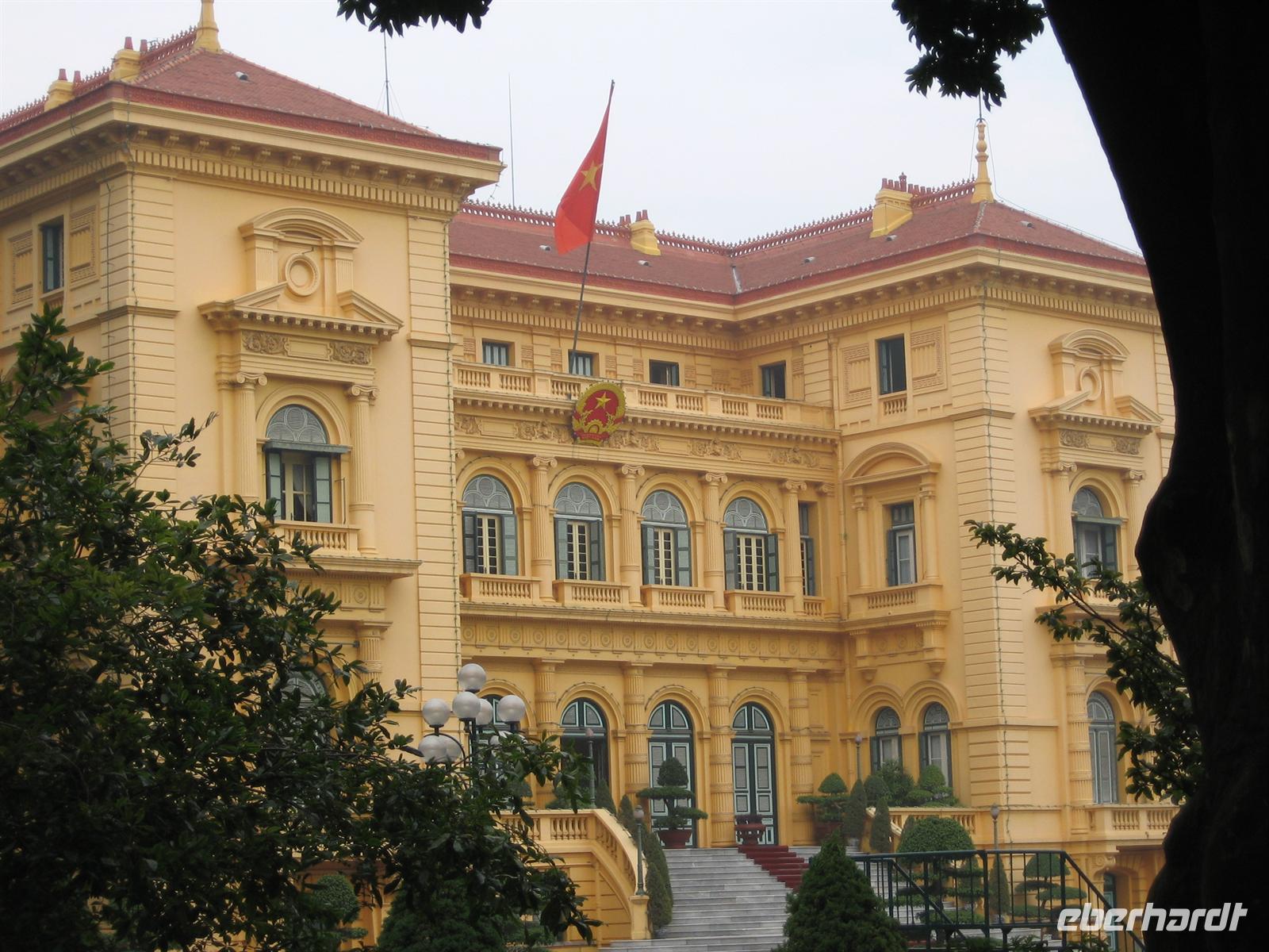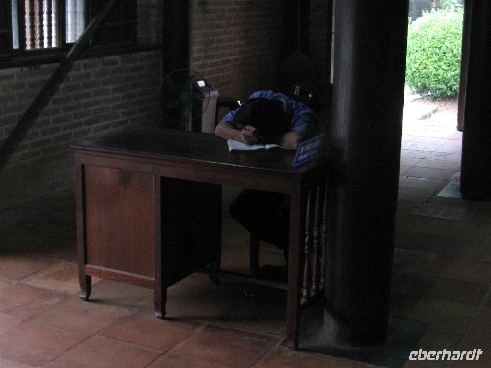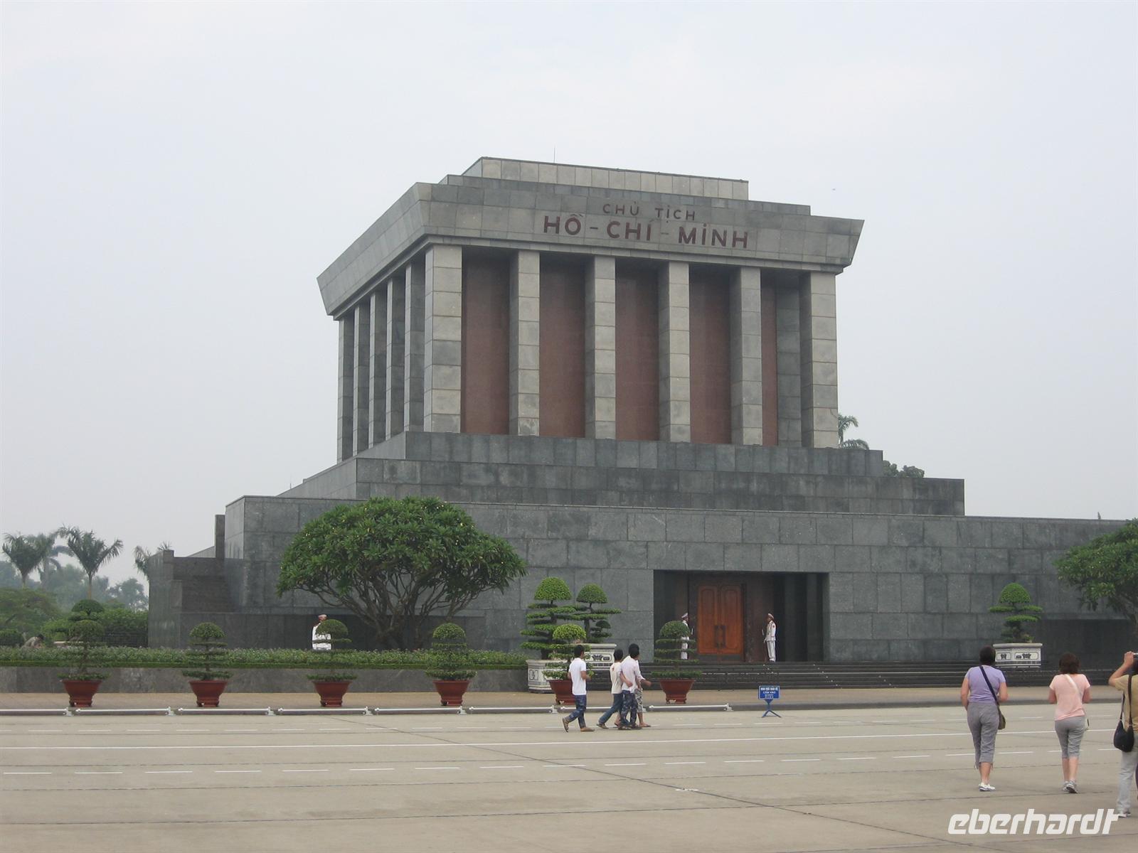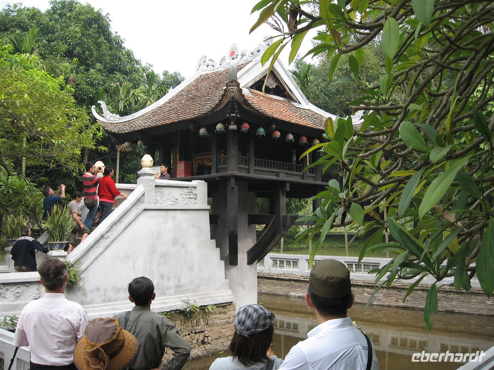 Der Tag beginnt zeitig, bereits um 8 Uhr holt uns Ot am Hotel ab. Das Frühstück im Hotel war gut und ließ keine Wünsche offen. Zuerst fahren wir zum Mausoleum von Ho Chi Mihn. Leider ist es heute geschlossen, Freitags ist Pflegetag. So müssen die Geschichten von Ot über das Leben von „Onkel Ho“ genügen. Nach seinen Reisejahren in Europa und Amerika war er von 1945 an der führende Politiker in Vietnam. Bis zu seinem Tod lebte er in unmittelbarer Nähe zum Präsidentenpalast in einem bescheidenen Haus. Im Palast wollte er nicht wohnen, er meinte so ein riesiges Haus brauche er alleine nicht. Die gepflegte Anlage erfreut das Auge. In unmittelbarer Nähe befindet sich noch die Ein-Säulen-Pagode, eines der Wahrzeichen von Hanoi. Dieses 3 m² große Miniheiligtum aus dem 11. Jh. wird nur von einer Säule getragen und steht in einem kleinen See. Sie soll das Abbild einer Lotusblume sein, dem buddhistischen Symbol für die Erleuchtung. Hier gibt es auch die Möglichkeit zum Kauf von schönen Postkarten und Briefmarken. Danach besuchen wir den Literaturtempel,