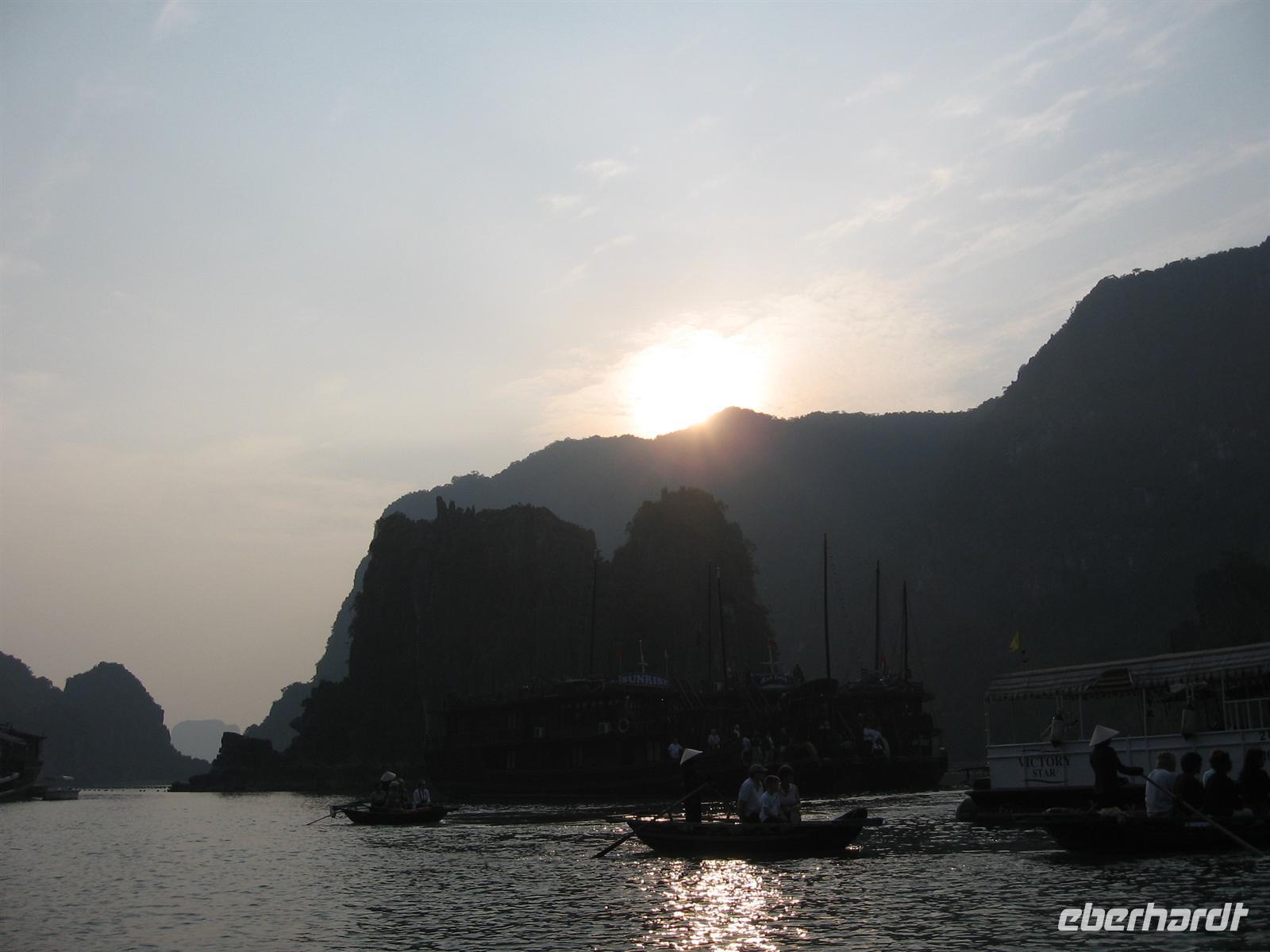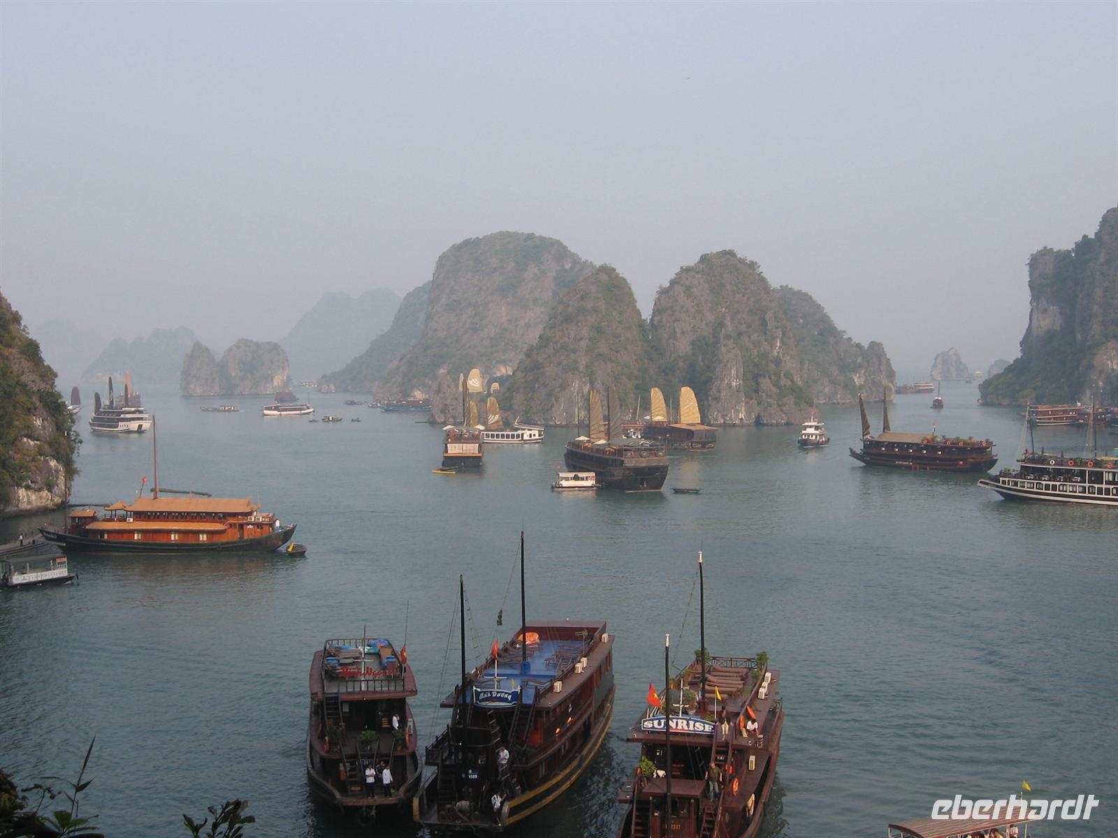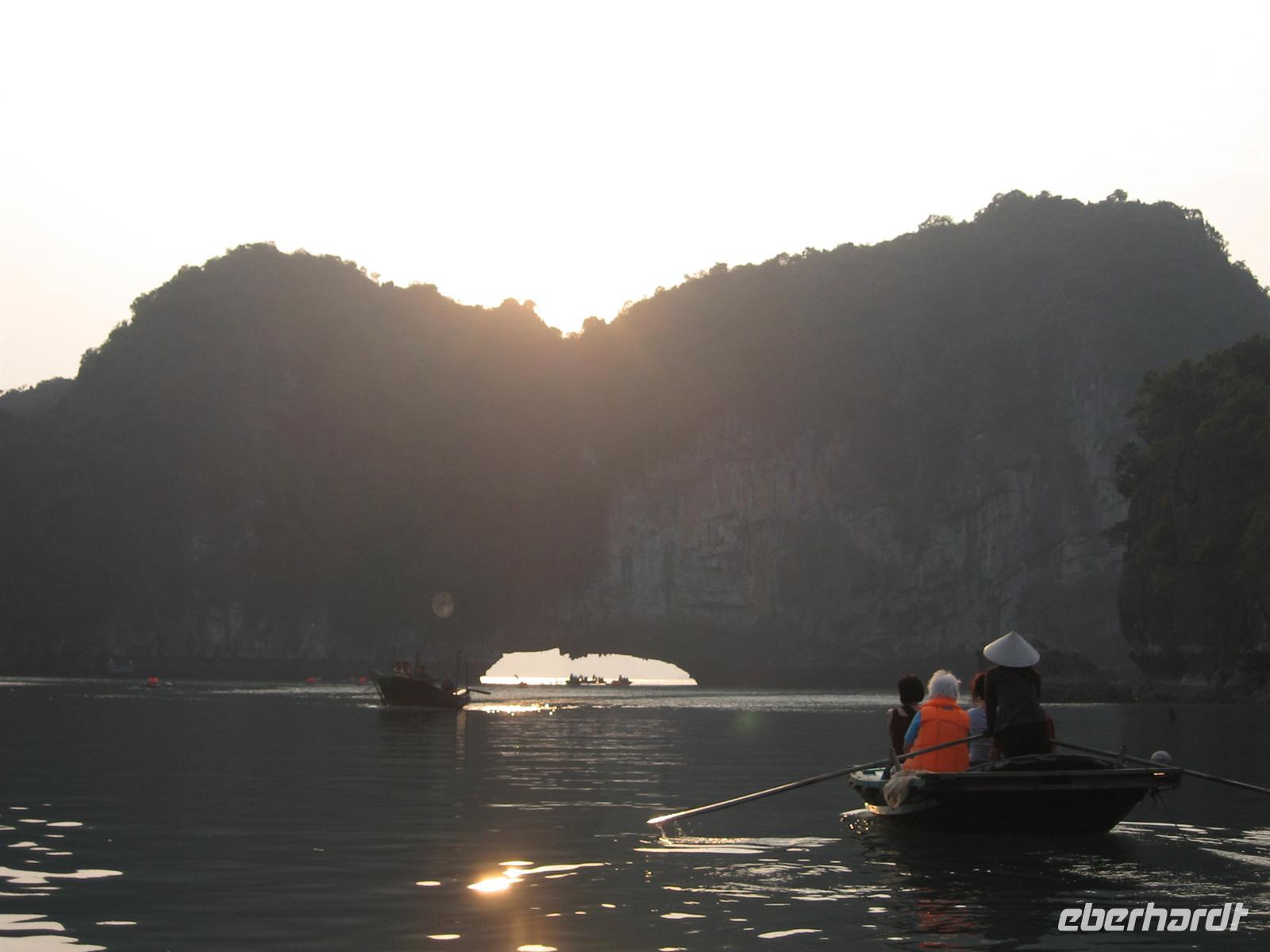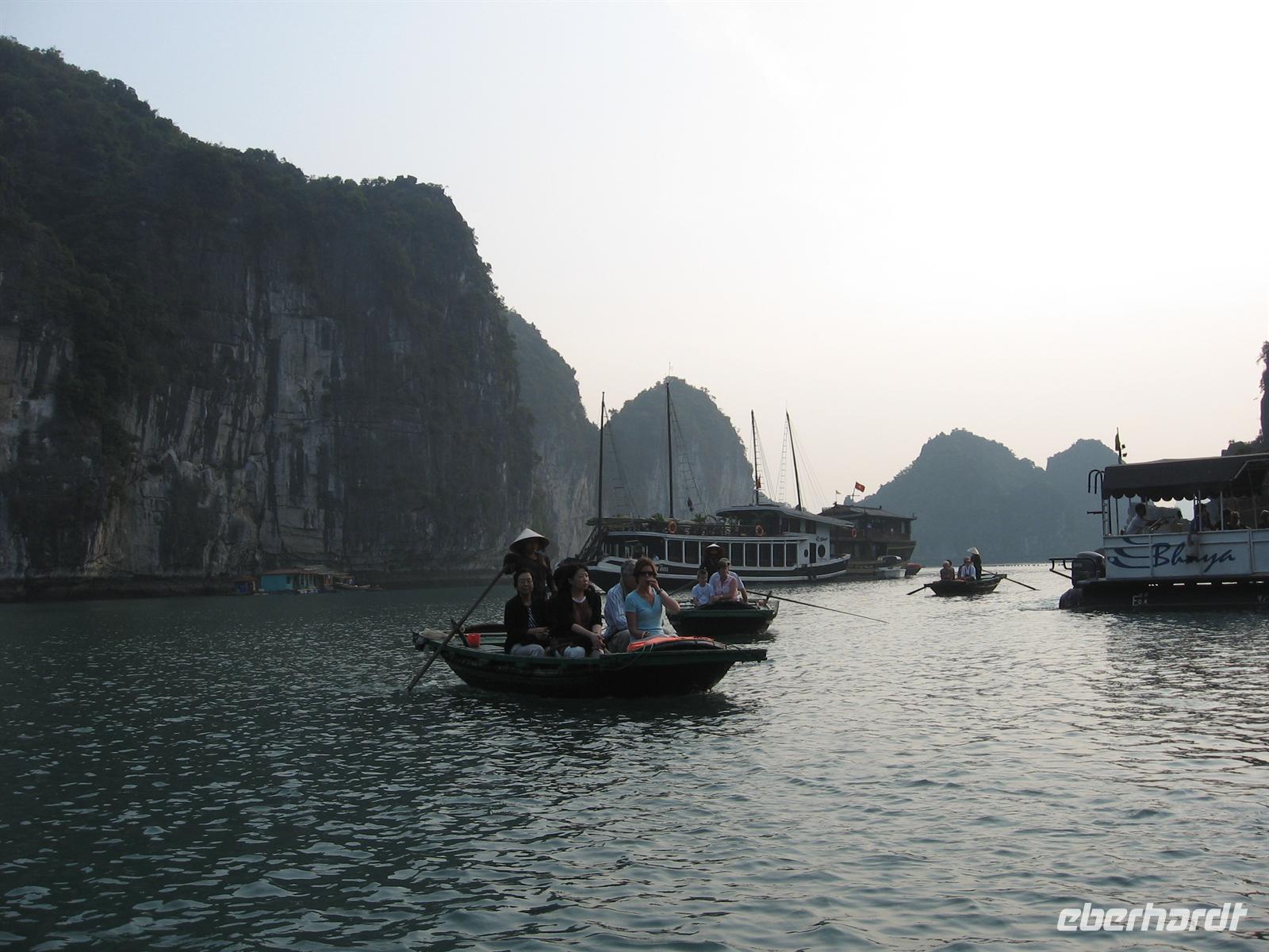 Der Legende nach kam ein riesiger Drache vom Gebirge ins Tal hinab, um den Vietnamesen im Kampf gegen ihre Feinde beizustehen. Wütend schlug er mit seinem Schwanz um sich, spaltete so die Berge und schnitt riesige Kerben und Täler in die Landschaft. Als er anschließend im Wasser untertauchte, verdrängte er soviel Wasser, dass das Land überflutet wurde und fortan nur noch die steilen Felsen herausragten. Das ist aber nur eine Legende, es gibt noch mehr. Nach dem Bezug der Kabinen werden wir zum Mittagessen gebeten, es gibt u.a. Krabben welche vor unseren Augen geöffnet werden. An uns vorbei zieht dabei die Landschaft der Ha Long Bucht mit ihren einzigartigen Felsen, die als kleine Inseln in der Bucht stehen. Es sollen 2000 sein. Es handelt sich bei der Ha Long Bucht um ein Karst-Gebiet, welches seine heutige Form durch Verwitterung über mehrere Millionen Jahre erhalten hat. Halt machen wir mit unserer Dschunke an einem schwimmenden Dorf. Wir steigen um in kleine Ruderboote und werden durch das Dorf gefahren. Dabei müssen die Frauen an den Rudern eine ganz schön lange Strecke zurück legen. Die Bewohner leben in erster Linie von Fischfang, Muschelzucht und natürlich auch von Touristen. Auf dem Weg zurück zur Dschunke können wir Drachenboot fahren. Eine leider nur kleine Mannschaft findet sich zusammen um gegen die Reisegruppe aus Kroatien, welche mit uns auf der Dschunke ist, anzutreten. Wir haben das Glück zu gewinnen, unser Steuermann dreht einfach etwas eher um. Anschließend ist Zeit vorhanden um zu schwimmen oder einfach die Seele baumeln zu lassen. Vor dem Abendessen können wir dem Koch noch über die Schulter sehen, wie er ganz schnell ein sehr schmackhaftes vietnamesisches Gericht zaubert. Das Abendessen danach in Form eines Gala Dinners ist wieder sehr schmackhaft und vor allem auch etwas für das Auge. Fisch und Fleisch, lecker zubereitet stellen eine Gaumenfreude dar. Nach dem Essen sitzen wir alle gemeinsam noch an Deck und trinken auf das Wohl aller Reisschnaps. Unser Reiseleiter Ot hat diesen extra bei einem Bauern besorgt, gebrannt wurde er aus Klebreis. Dabei werden verschiedene Geschichten erzählt und es gibt allerhand zu lachen. Frau Arnhold, welche früher als Lehrerin für vietnamesische Schüler in der DDR gearbeitet hat erzählt eine sehr lustige Begebenheit, welche ich kurz wiedergeben möchte: Sie war mit ihren Schülern im Konsument Warenhaus in Leipzig damit diese Wintersachen kaufen können. Das war gar nicht so einfach, denn die Vietnamesen mussten für richtige Kälte eingekleidet werden. Einer der Schüler suchte sich einen dünnen Rollkragenpullover aus. Sie wies ihn mehrmals darauf hin, das er nicht warm hält und zu dünn ist. Als sie es noch einmal versuchte sagte der Vietnamese: „...das stimmt nicht, hinten im Pullover steht dreißig Grad.“ Er hatte also gedacht, das Wäschezeichen zeigt an wie warm der Pullover hält.