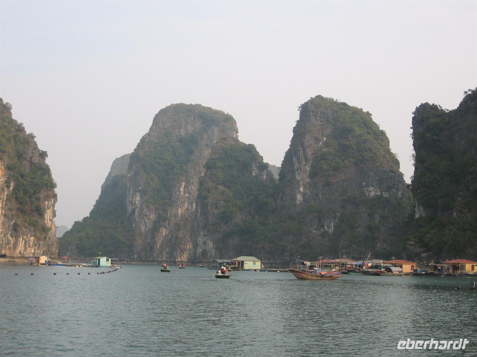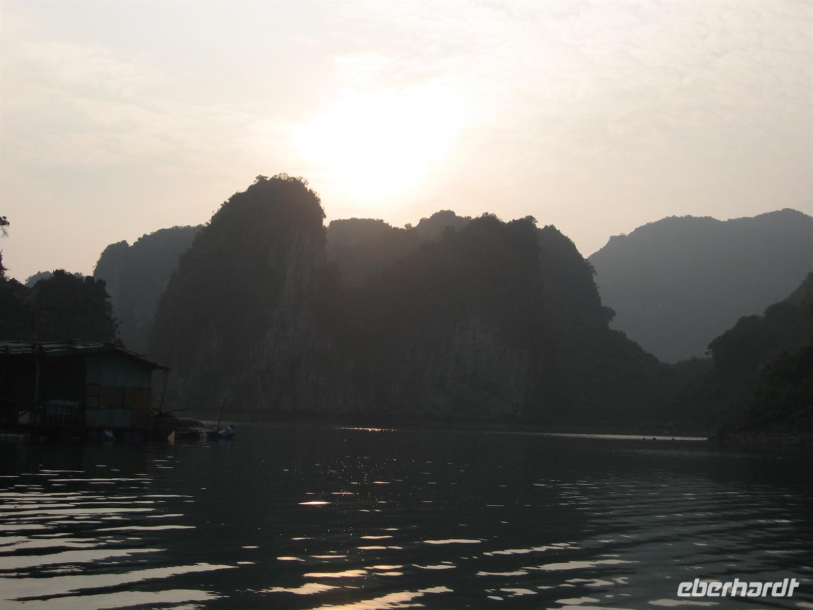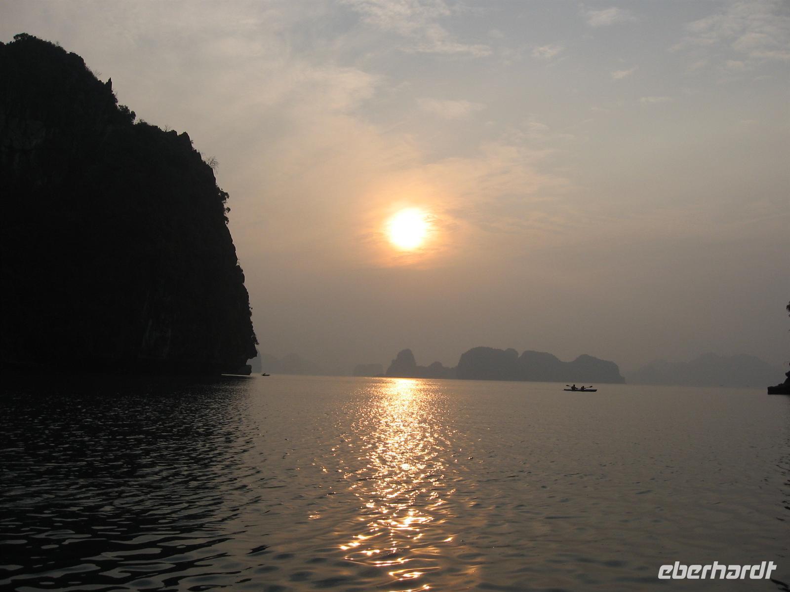 Der Legende nach kam ein riesiger Drache vom Gebirge ins Tal hinab, um den Vietnamesen im Kampf gegen ihre Feinde beizustehen. Wütend schlug er mit seinem Schwanz um sich, spaltete so die Berge und schnitt riesige Kerben und Täler in die Landschaft. Als er anschließend im Wasser untertauchte, verdrängte er soviel Wasser, dass das Land überflutet wurde und fortan nur noch die steilen Felsen herausragten. Das ist aber nur eine Legende, es gibt noch mehr. Nach dem Bezug der Kabinen werden wir zum Mittagessen gebeten, es gibt u.a. Krabben welche vor unseren Augen geöffnet werden. An uns vorbei zieht dabei die Landschaft der Ha Long Bucht mit ihren einzigartigen Felsen, die als kleine Inseln in der Bucht stehen. Es sollen 2000 sein. Es handelt sich bei der Ha Long Bucht um ein Karst-Gebiet, welches seine heutige Form durch Verwitterung über mehrere Millionen Jahre erhalten hat. Halt machen wir mit unserer Dschunke an einem schwimmenden Dorf. Wir steigen um in kleine Ruderboote und werden durch das Dorf gefahren. Dabei müssen die Frauen an den Rudern eine ganz schön lange Strecke zurück legen. Die Bewohner leben in erster Linie von Fischfang, Muschelzucht und natürlich auch von Touristen. Auf dem Weg zurück zur Dschunke können wir Drachenboot fahren. Eine leider nur kleine Mannschaft findet sich zusammen um gegen die Reisegruppe aus Kroatien, welche mit uns auf der Dschunke ist, anzutreten. Wir haben das Glück zu gewinnen, unser Steuermann dreht einfach etwas eher um. Anschließend ist Zeit vorhanden um zu schwimmen oder einfach die Seele baumeln zu lassen. Vor dem Abendessen können wir dem Koch noch über die Schulter sehen, wie er ganz schnell ein sehr schmackhaftes vietnamesisches Gericht zaubert. Das Abendessen danach in Form eines Gala Dinners ist wieder sehr schmackhaft und vor allem auch etwas für das Auge. Fisch und Fleisch, lecker zubereitet stellen eine Gaumenfreude dar. Nach dem Essen sitzen wir alle gemeinsam noch an Deck und trinken auf das Wohl aller Reisschnaps. Unser Reiseleiter Ot hat diesen extra bei einem Bauern besorgt, gebrannt wurde er aus Klebreis. Dabei werden verschiedene Geschichten erzählt und es gibt allerhand zu lachen. Frau Arnhold, welche früher als Lehrerin für vietnamesische Schüler in der DDR gearbeitet hat erzählt eine sehr lustige Begebenheit, welche ich kurz wiedergeben möchte: Sie war mit ihren Schülern im Konsument Warenhaus in Leipzig damit diese Wintersachen kaufen können. Das war gar nicht so einfach, denn die Vietnamesen mussten für richtige Kälte eingekleidet werden. Einer der Schüler suchte sich einen dünnen Rollkragenpullover aus. Sie wies ihn mehrmals darauf hin, das er nicht warm hält und zu dünn ist. Als sie es noch einmal versuchte sagte der Vietnamese: „...das stimmt nicht, hinten im Pullover steht dreißig Grad.“ Er hatte also gedacht, das Wäschezeichen zeigt an wie warm der Pullover hält.
