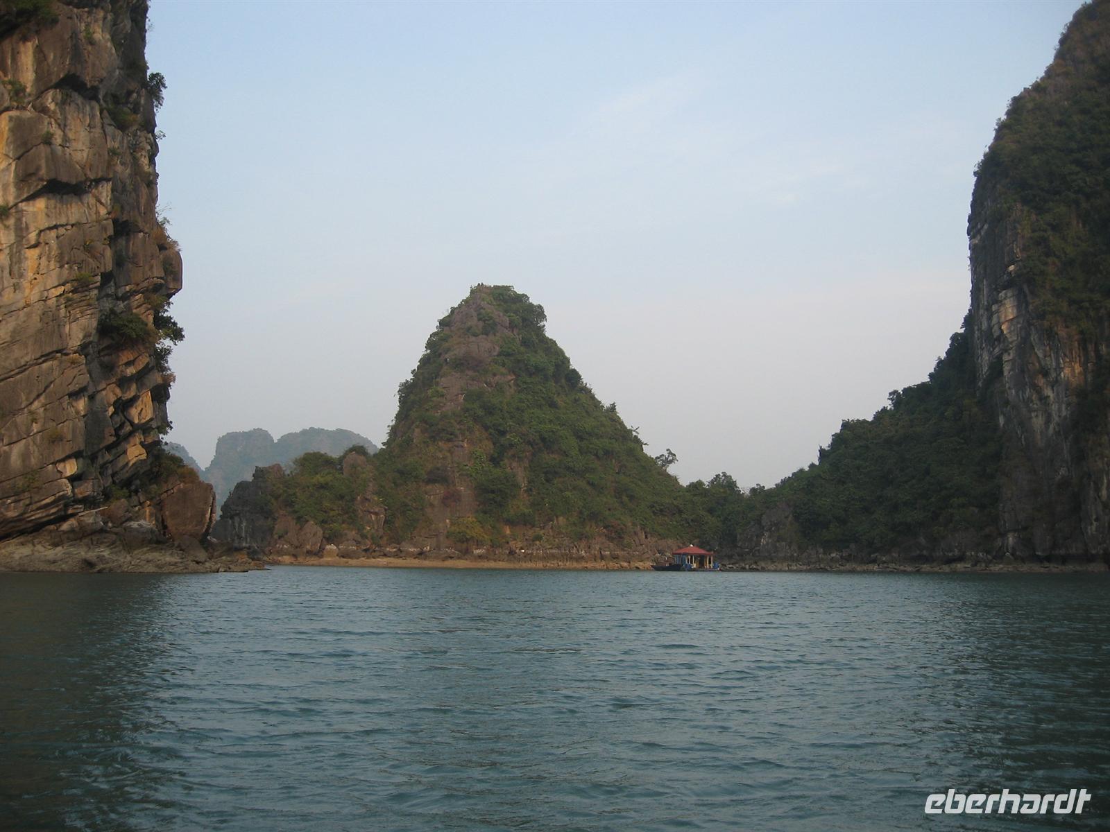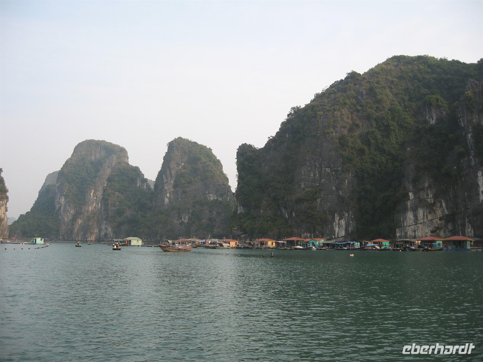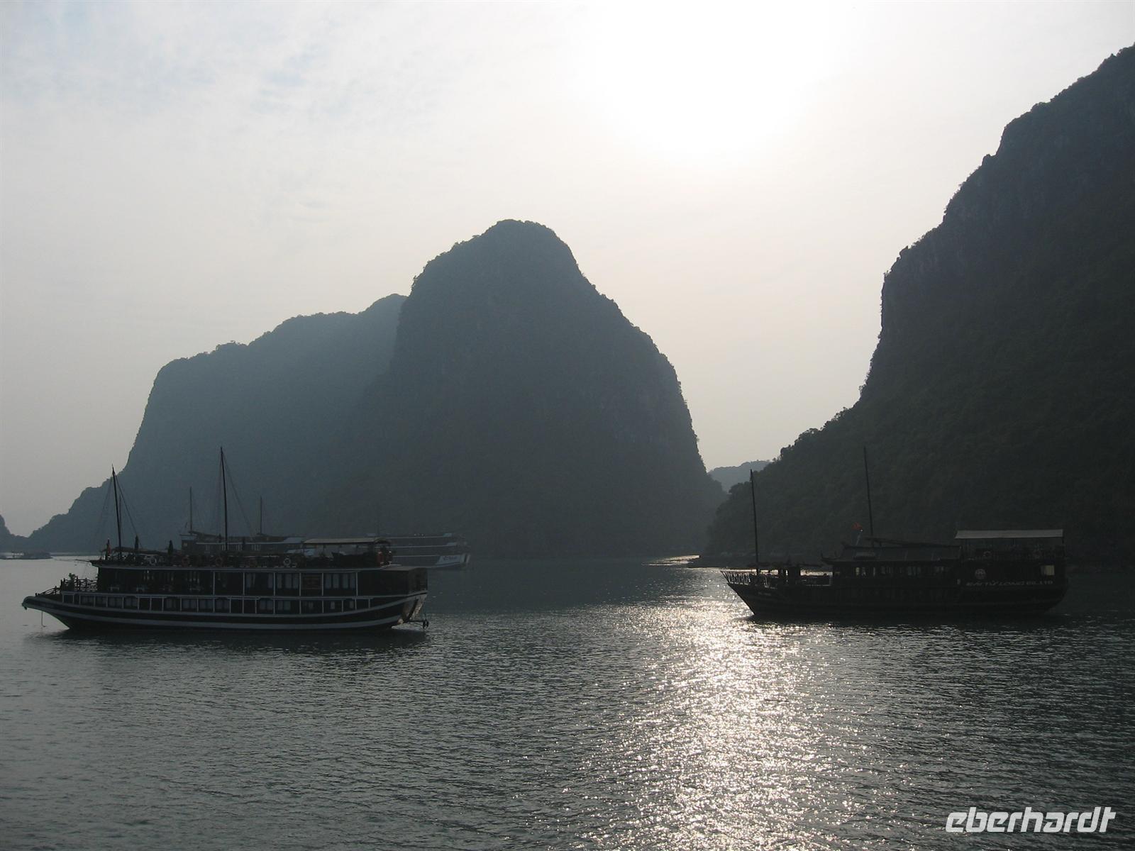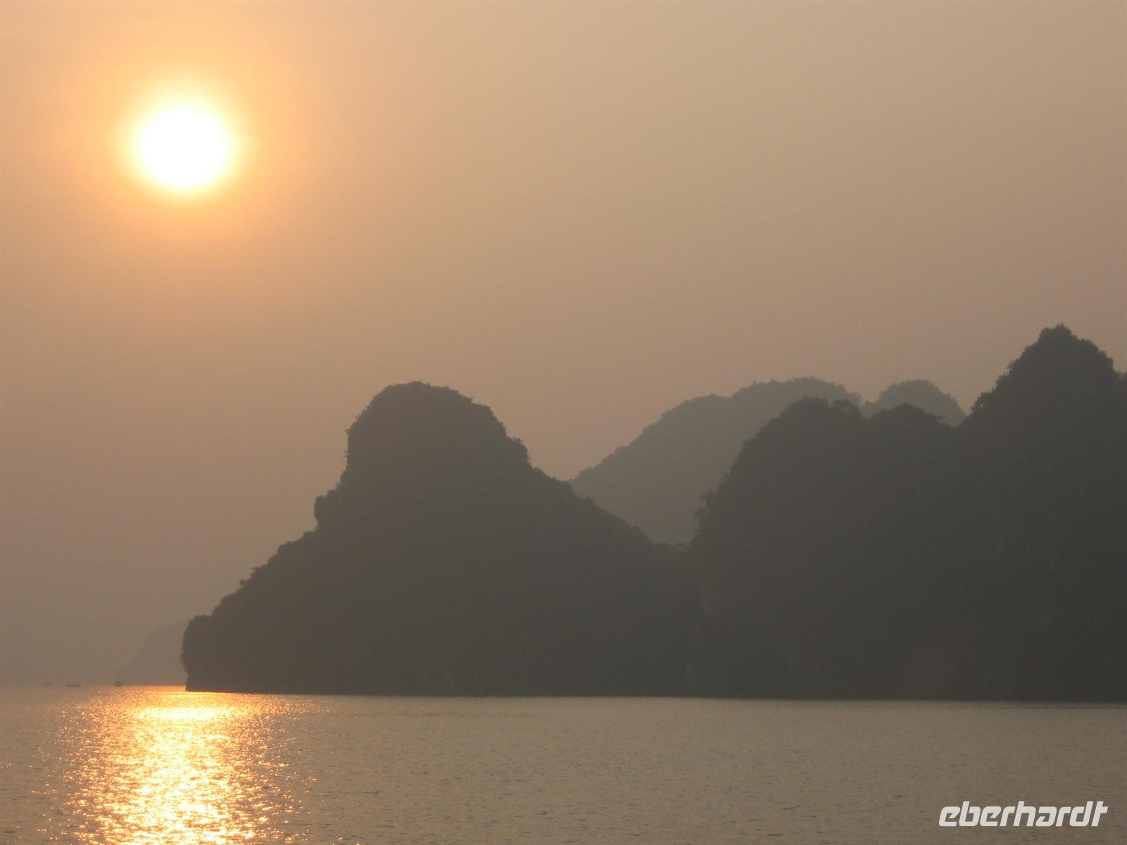 Der Legende nach kam ein riesiger Drache vom Gebirge ins Tal hinab, um den Vietnamesen im Kampf gegen ihre Feinde beizustehen. Wütend schlug er mit seinem Schwanz um sich, spaltete so die Berge und schnitt riesige Kerben und Täler in die Landschaft. Als er anschließend im Wasser untertauchte, verdrängte er soviel Wasser, dass das Land überflutet wurde und fortan nur noch die steilen Felsen herausragten. Das ist aber nur eine Legende, es gibt noch mehr. Nach dem Bezug der Kabinen werden wir zum Mittagessen gebeten, es gibt u.a. Krabben welche vor unseren Augen geöffnet werden. An uns vorbei zieht dabei die Landschaft der Ha Long Bucht mit ihren einzigartigen Felsen, die als kleine Inseln in der Bucht stehen. Es sollen 2000 sein. Es handelt sich bei der Ha Long Bucht um ein Karst-Gebiet, welches seine heutige Form durch Verwitterung über mehrere Millionen Jahre erhalten hat. Halt machen wir mit unserer Dschunke an einem schwimmenden Dorf. Wir steigen um in kleine Ruderboote und werden durch das Dorf gefahren. Dabei müssen die Frauen an den Rudern eine ganz schön lange Strecke zurück legen. Die Bewohner leben in erster Linie von Fischfang, Muschelzucht und natürlich auch von Touristen. Auf dem Weg zurück zur Dschunke können wir Drachenboot fahren. Eine leider nur kleine Mannschaft findet sich zusammen um gegen die Reisegruppe aus Kroatien, welche mit uns auf der Dschunke ist, anzutreten. Wir haben das Glück zu gewinnen, unser Steuermann dreht einfach etwas eher um. Anschließend ist Zeit vorhanden um zu schwimmen oder einfach die Seele baumeln zu lassen. Vor dem Abendessen können wir dem Koch noch über die Schulter sehen, wie er ganz schnell ein sehr schmackhaftes vietnamesisches Gericht zaubert. Das Abendessen danach in Form eines Gala Dinners ist wieder sehr schmackhaft und vor allem auch etwas für das Auge. Fisch und Fleisch, lecker zubereitet stellen eine Gaumenfreude dar. Nach dem Essen sitzen wir alle gemeinsam noch an Deck und trinken auf das Wohl aller Reisschnaps. Unser Reiseleiter Ot hat diesen extra bei einem Bauern besorgt, gebrannt wurde er aus Klebreis. Dabei werden verschiedene Geschichten erzählt und es gibt allerhand zu lachen. Frau Arnhold, welche früher als Lehrerin für vietnamesische Schüler in der DDR gearbeitet hat erzählt eine sehr lustige Begebenheit, welche ich kurz wiedergeben möchte: Sie war mit ihren Schülern im Konsument Warenhaus in Leipzig damit diese Wintersachen kaufen können. Das war gar nicht so einfach, denn die Vietnamesen mussten für richtige Kälte eingekleidet werden. Einer der Schüler suchte sich einen dünnen Rollkragenpullover aus. Sie wies ihn mehrmals darauf hin, das er nicht warm hält und zu dünn ist. Als sie es noch einmal versuchte sagte der Vietnamese: „...das stimmt nicht, hinten im Pullover steht dreißig Grad.“ Er hatte also gedacht, das Wäschezeichen zeigt an wie warm der Pullover hält.