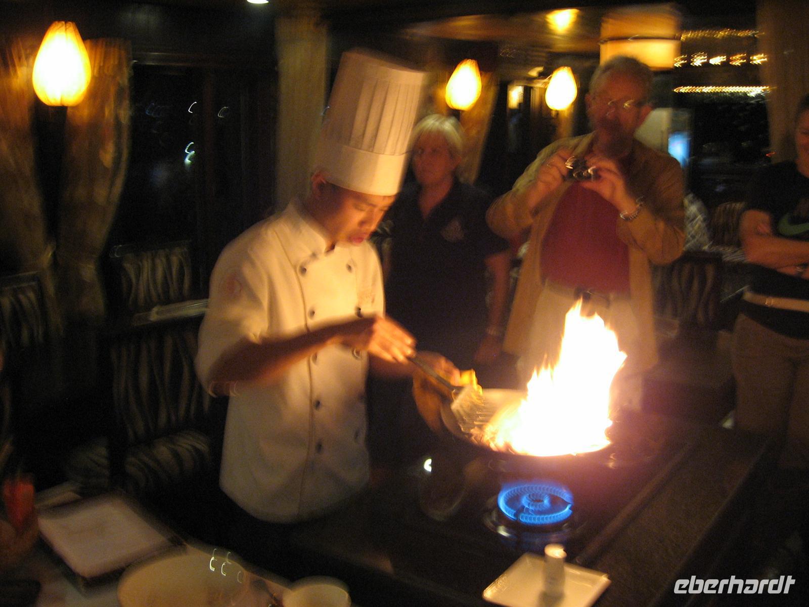 Zu Abend essen wir wieder außer Haus, erst fahren wir wieder ein Stück mit dem Bus, dann steigen wir um in ein Taxi, welches uns zum Restaurant bringt. Es liegt auf einer der Inseln und unser Bus kann dort nicht hin fahren. Auch heute endet der Abend wieder mit einer Gesangseinlage, eine der Kellnerinnen sind uns zwei wunderschöne Lieder, alle sind davon begeistert.