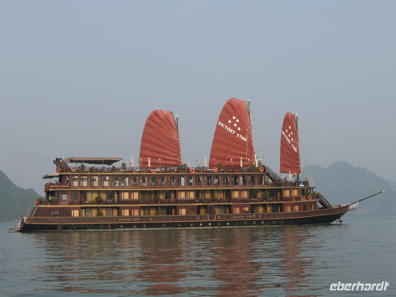 Wir verlassen am Morgen Hanoi und fahren zur Ha Long Bucht. Für die Strecke von 180 km brauchen wir, mit einer Pause, gut 4,5 Stunden. Auf unserer Fahrt geht es entlang abgeernteter Reisfelder. In Nordvietnam kann im Jahr zweimal Reis geerntet werden, im Süden drei bis vier Mal. Nach der Ernte werden hier im Norden auf den Felder verschiedene Gemüse als Zwischenfrucht angebaut. Wir kommen nicht sehr schnell voran, denn unser Bus darf auf der Landstraße nicht mehr als 70 und in Ortschaften nur 40 km/h fahren. Unser Busfahrer hält sich sehr daran, er möchte nicht erwischt werden, die Strafen sind sehr hoch. Sofort werden z.B. dann 500000 VND fällig. Nach gut zwei Stunden Fahrt machen wir Pause in einer Werkstatt, wo zahlreiche Behinderte arbeiten. Sie fertigen vor allem Kunstgewerbe für Touristen an. Das Angebot ist riesig, auf der Rückfahrt werden wir hier sicher etwas mehr Pause. Weiter geht die Fahrt, vorbei u.a. an einem großen Kohlekraftwerk. Die dafür benötigte Kohle wird ausschließlich per LKW transportiert, entsprechend schwarz sehen auch teilweise die Straßen aus. Langsam kommen am Horizont die ersten Berge der trockenen Ha Long Bucht in Sicht, nun ist es nicht mehr sehr weit. Kurz nach zwölf Uhr erreichen wir Ha Long und auch den Hafen wo unsere Dschunke liegt, die Victory Star. Der Name Ha Long bedeutet im deutschen „absteigender Drache“.