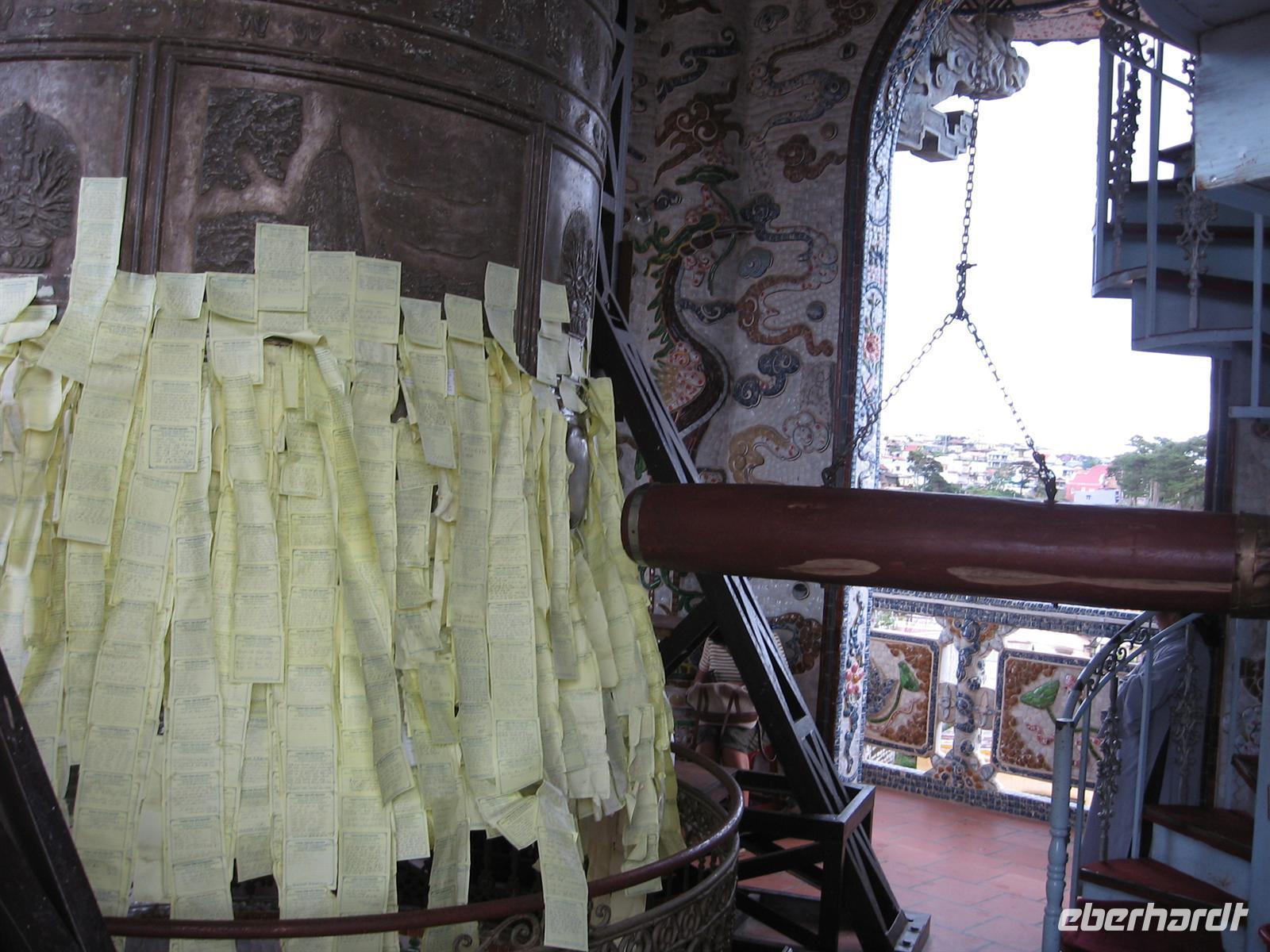 Die Linh Phuoc Pagode wurde zwischen 1949 und 1992 erbaut und wurde seitdem von einer Reihe von buddhistischen Mönchen geleitet und 1990 von ihnen renoviert. Im zweiten Stockwerk des Turmes, in dem in jedem Stockwerk ein anderer Gott verehrt wird, ist die größte Glocke Zentralvietnams zu finden. Die Glocke misst 4,4 Meter in der Höhe und wiegt etwa 8,5 Tonnen. Mit dem Bus fahren wir dann zum Sommerpalast des letzten Kaisers von Vietnam, Bao Dai. Das schlichte, stark vom Art-Déco-Stil beeinflusste, Bauwerk wurde zwischen 1933 und 1938 erbaut. Die Einrichtung des Palastes ist fast unverändert, bemerkenswert war für uns, dass die Zimmer mit frischen Blumen dekoriert waren. 1957 ging Dao Bai endgültig ins Exil nach Frankreich und der Plast wurde anschließend vom südvietnamesischen Präsidenten Diem genutzt. Abschließend besuchen wir noch den quirligen Markt im Zentrum der Stadt. Das Abendessen ist wieder ein Genuss, wir essen im Art Cafe. Der Besitzer ist auch ein Künstler und bringt für einige Gäste ein kleines Kunstwerk mit Tusche und ausschließlich seinen Findern auf Papier.