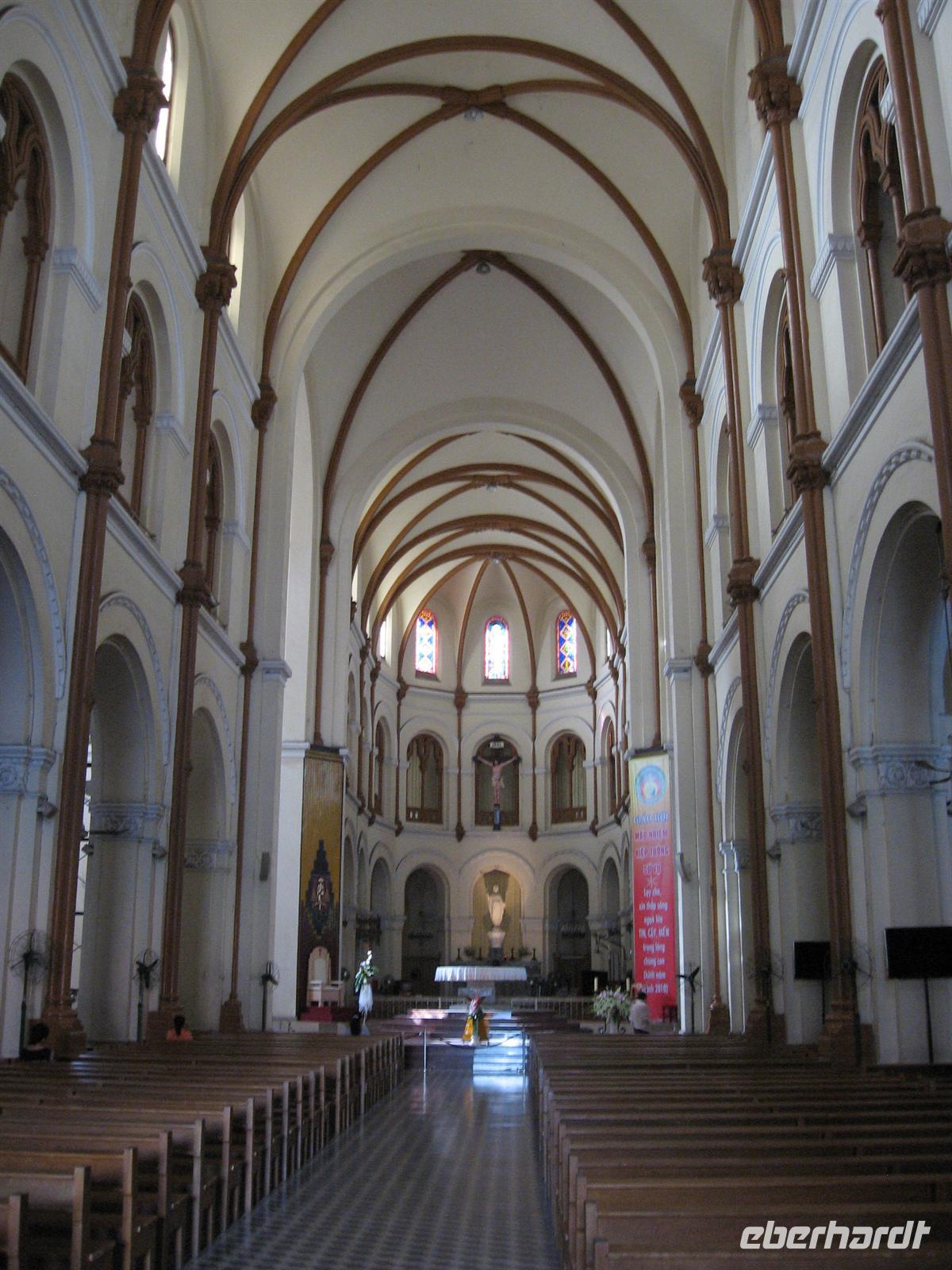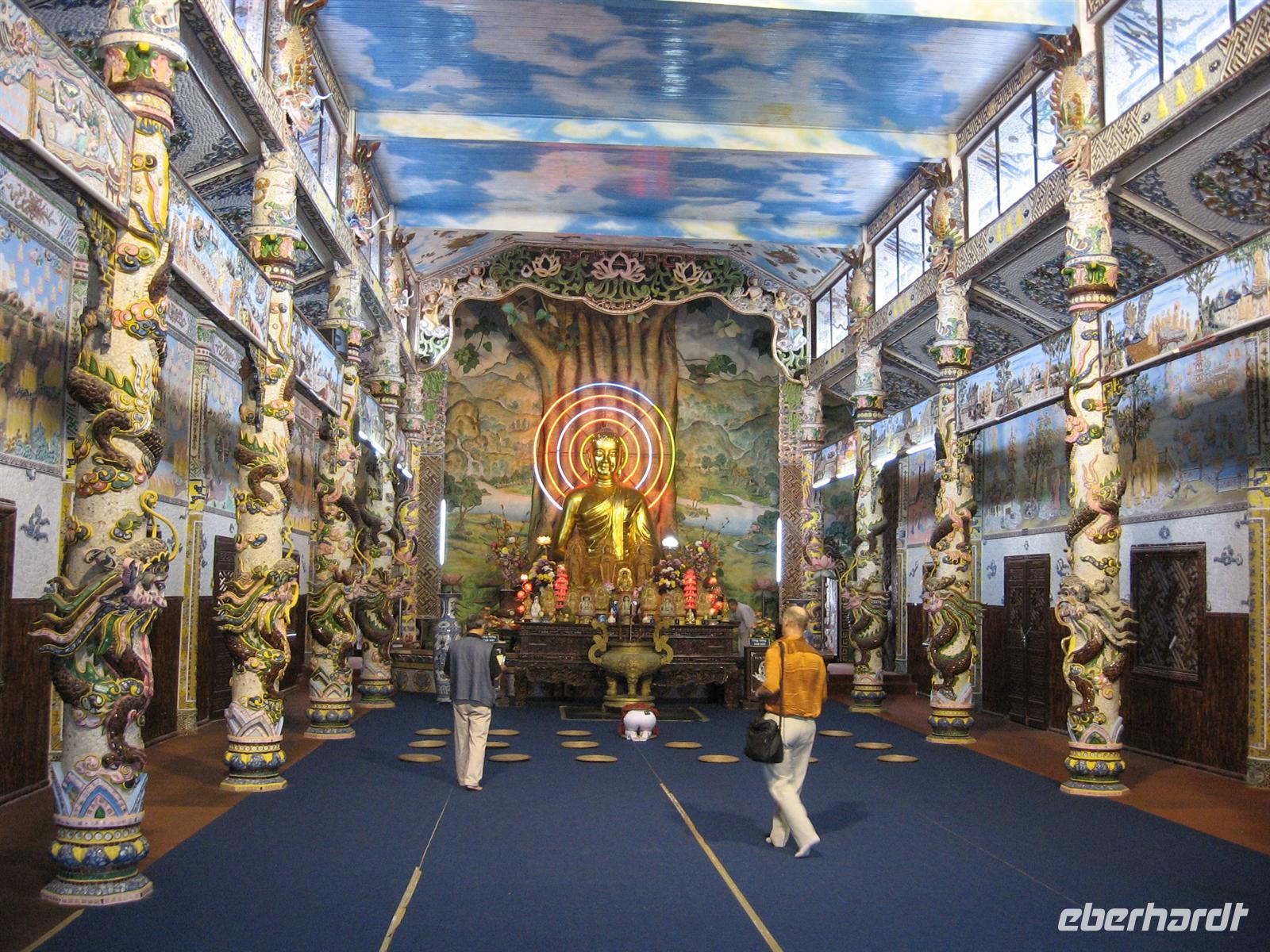 Mit der Erstürmung durch die vietnamesische Armee und der Kapitulation endete im April 1975 endgültig das Kapitel des Vietnamkrieges. Der Palast wird auch heute noch genutzt, allerdings nur der Konferenzsaal. Unweit von hier befindet sich die Kathedrale Notre Dame. Die Kirche aus rotem Backstein, 1880-1883 erbaut wurde von den französischen Kolonialherren errichtet, damit die Gläubigen immer regelmäßig zum Gottesdienst erscheinen konnten. Auch heute noch ist die Kirche bei Gottesdiensten voller Menschen. Im 20.Jh. sind auch Katholiken aus Nordvietnam in den Süden geflüchtet, aus Angst weil ihr Glauben der des Feindes war. Gleich nebenan befindet sich, ebenfalls im kolonialfranzösischen Baustil, das Postamt von Saigon. Neben Briefmarken kann man hier, unter dem wachsamen Auge von „Onkel Ho“ auch allerlei Andenken erwerben. Ebenfalls aus dieser Bauepoche stammen das Rathaus und die Oper von Saigon. Im chinesischen Viertel „Cholon“, wo etwa 300000 chinesisch stämmige Menschen leben, besuchen wir die Thien-Hau-Pagode. Gebaut ab Ende des 18. Jh. ist sie vor allem wegen ihres Dachfries sehr sehenswert. Erzählt werden dabei chinesische Legenden, das ganze wirkt etwas wie eine Art Puppentheater. Ich kaufe für die Gruppe eine Räucherspirale aus Sandelholz, versehe sie mit einem Wunsch und so wird sie jetzt etwa 4 Tage vor sich her glimmen. Eine Pagode anderer Art ist die Giac-Lam-Pagode. Es ist eine rein vietnamesische Pagode, geweiht der Göttin der Barmherzigkeit. Im inneren befinden sich zahlreiche kleine Bildnisse von verstorbenen Menschen. Ihnen gedenkt man hier und bringt ihnen auch Opfer, damit sie einen guten Aufenthalt im Nirvana haben. Wiederum ist sehr interessant, das es einen Altar für Ho Chi Minh. Eigentlich passt das ja nicht zusammen, aber in Vietnam geht alles. Für alle Gäste die noch Lust haben und das sind doch mehr als gedacht, machen wir noch Halt am Ben-Than-Markt. Hier gibt es wieder nicht was es nicht gibt und so werden noch Nüsse gekauft und Schuhe. Die anderen Gäste sind derweil schon zum Hotel gefahren und wir gehen zu Fuß dahin, es sind nur gut 15 Minuten zu laufen. Das Abendessen nehmen wir wieder in einem Restaurant ein, dabei werden wir mit traditioneller Musik unterhalten.