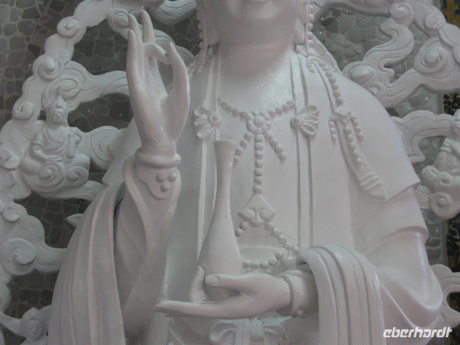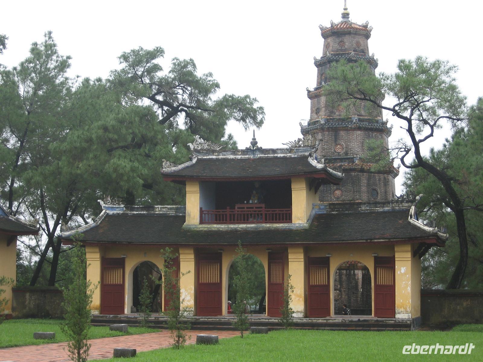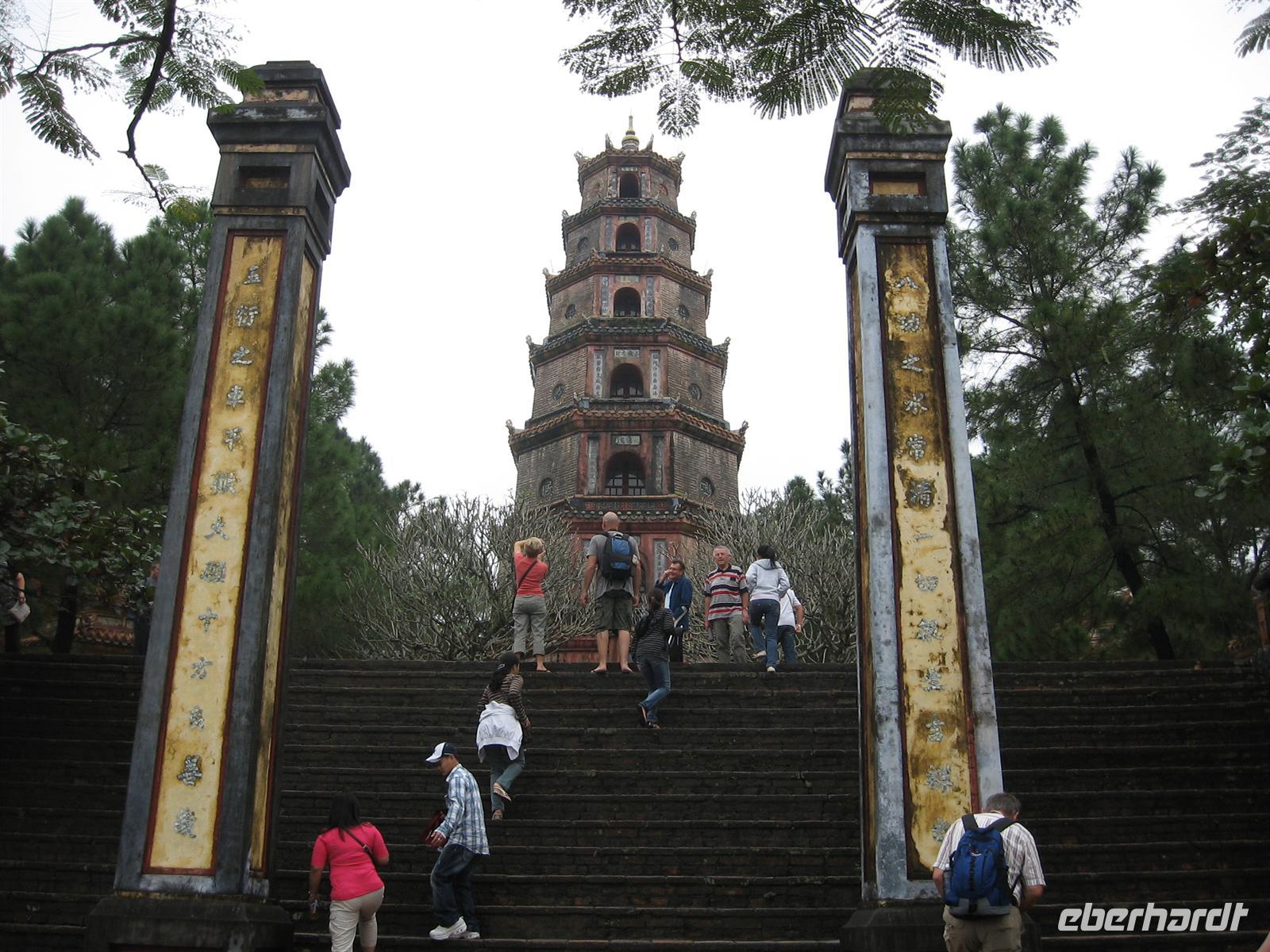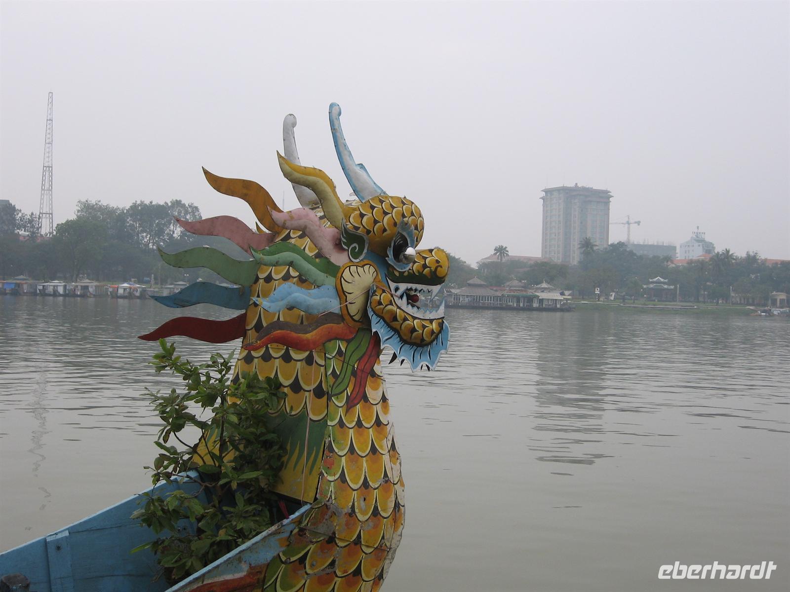 In der Nacht hat es noch kräftig geregnet. Das sind die letzten Ausläufer des Monsunregens, welcher in Vietnam auch regelmäßig zu Überschwemmungen führt. Nach einem exzellenten Frühstück beginnt unser Besichtigungsprogramm. Dadurch, dass wir gestern nichts unternehmen konnten haben wir heute viel zu tun. Wir beginnen mit einer Bootsfahrt auf dem „Parfümfluss“ oder „Fluss der Wohlgerüche“. Mit einem Drachenboot schippern wir auf dem Fluss entlang bis zur Thin-Mu-Pagode. Auf dem Boot werden verschiedene Textilien und Souvenirs angeboten und einige von uns machen davon reichlich Gebrauch. Die Preise sind auch sehr verführerisch. Die Pagode, welche der Himmelsgöttin geweiht ist, liegt zauberhaft am Fluss.