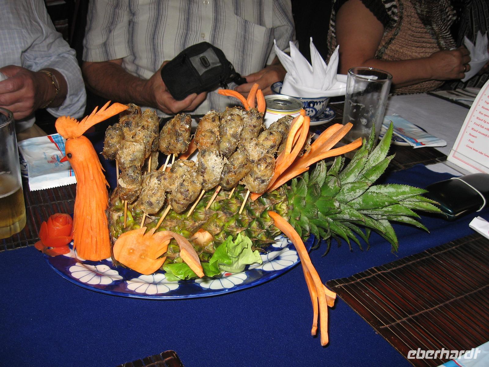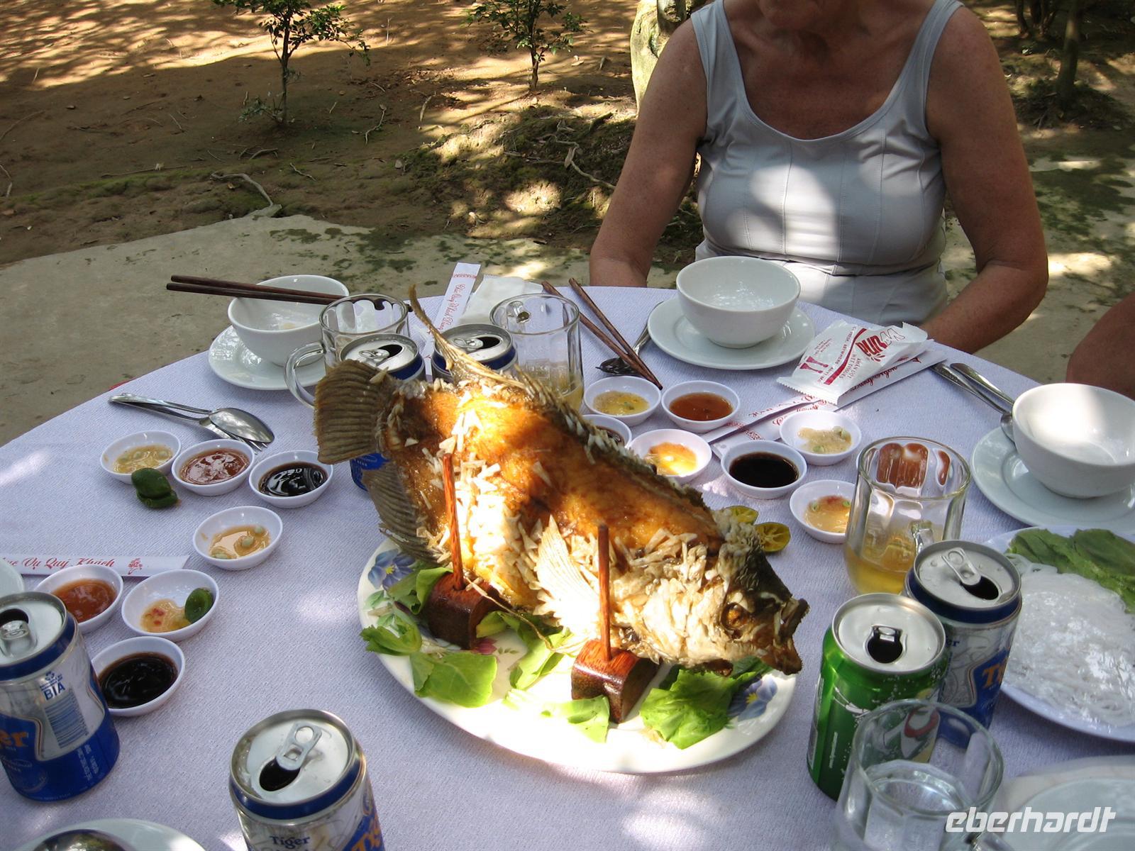 Mit dem Boot fahren wir auf eine der im Strom liegenden Inseln und haben die Gelegenheit die verschiedenen Obstsorten, die angebaut werden zu verkosten. Wir genießen Ananas, kleine süße Bananen, Papaya, wunderbar schmeckende Mango und die für Vietnam typische Drachenfrucht. Dabei werden wir mit vietnamesischer Folklore unterhalten und trinken dazu vietnamesischen Tee. Dann fahren wir zu nächsten Insel mit einem Tempel der Kokosnussreligion. Ihr Begründer rief seine Anhänger auf, sich nur von Kokosnüssen zu ernähren. Nächste Anlegestelle ist die Bonbon-Manufaktur. Hier werden aus Kokos Bonbons in verschiedenen Geschmacksrichtungen per Hand gefertigt. Am meisten beeindruckt die Fingerfertigkeit der Frauen beim verpacken der Bonbons. Natürlich kann man kosten und auch kaufen. Wieder fahren wir ein Stück mit dem Boot um dann in kleine Ruderboote umzusteigen. Damit fahren wir einen Kanal entlang, der an den Ufern mit Wasserpalmen gesäumt ist. Erwartet werden wir wieder mit einem Tee und kandiertem Kokos. Noch sind wir nicht am Ende unserer Tour, wir steigen um in kleine Pferdewagen, fahren damit durch ein Dorf und enden bei einer Bauernfamilie. Hier essen wir zu Mittag, die Spezialität heißt Elefantenohrfisch. Der Fisch hat keineswegs Ähnlichkeit mit einem Elefant und schmeckt ausgezeichnet. Nach einem üppigen Mittagessen fahren wir mit den Pferdewagen zurück zum Boot und wieder zurück nach My Tho. Danach sind noch gut 100 Kilometer im Bus bis Can Tho zurück zulegen. Das Abendessen ist heute fakultativ. Mit allen interessierten Gästen gehen wir in ein typisches Restaurant. Auf der Speisekarte stehen hier nicht nur Fisch, Nudelsuppe oder Reisgerichte sondern auch Frosch und Feldmaus. Herr Marwitz und ich beschließen einmal gegrillte Feldmaus zu probieren und Frau Ackermann möchte mal Frosch kosten. Wie schmeckt nun Maus? Eigentlich ganz normal, der Geschmack vom grillen ist etwas vorherrschend. Übrigens haben auch noch andere Gäste von unserem Teller gekostet. Um es gleich vorweg zu nehmen, Herrn Marwitz und mir geht es Tage danach sehr gut. Die Froschschenkel sollen übrigens sehr gut gewesen sein.