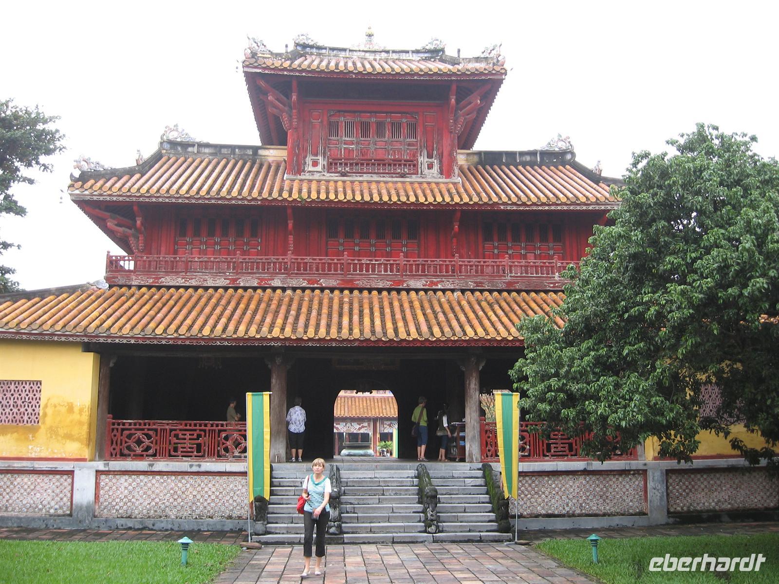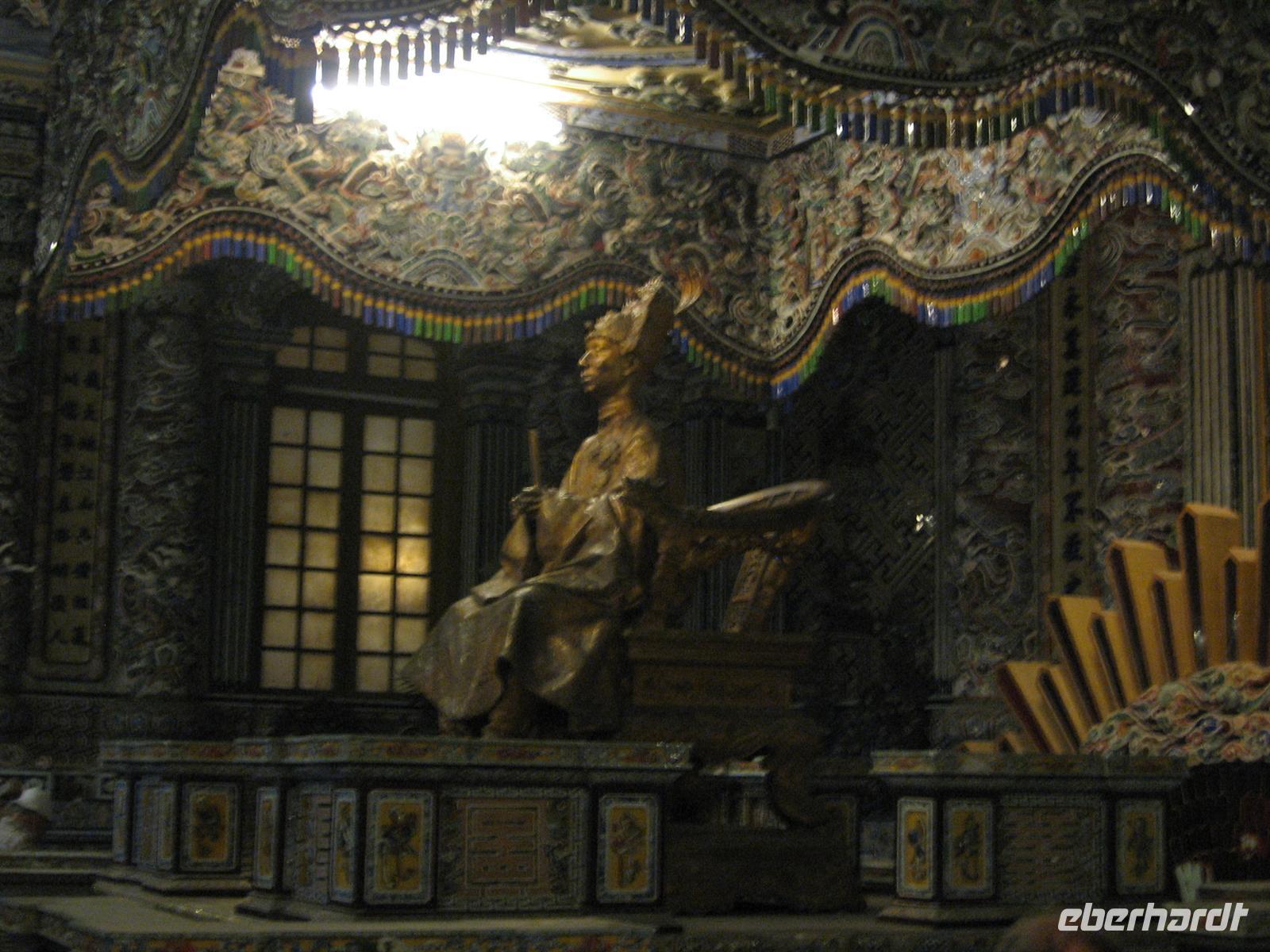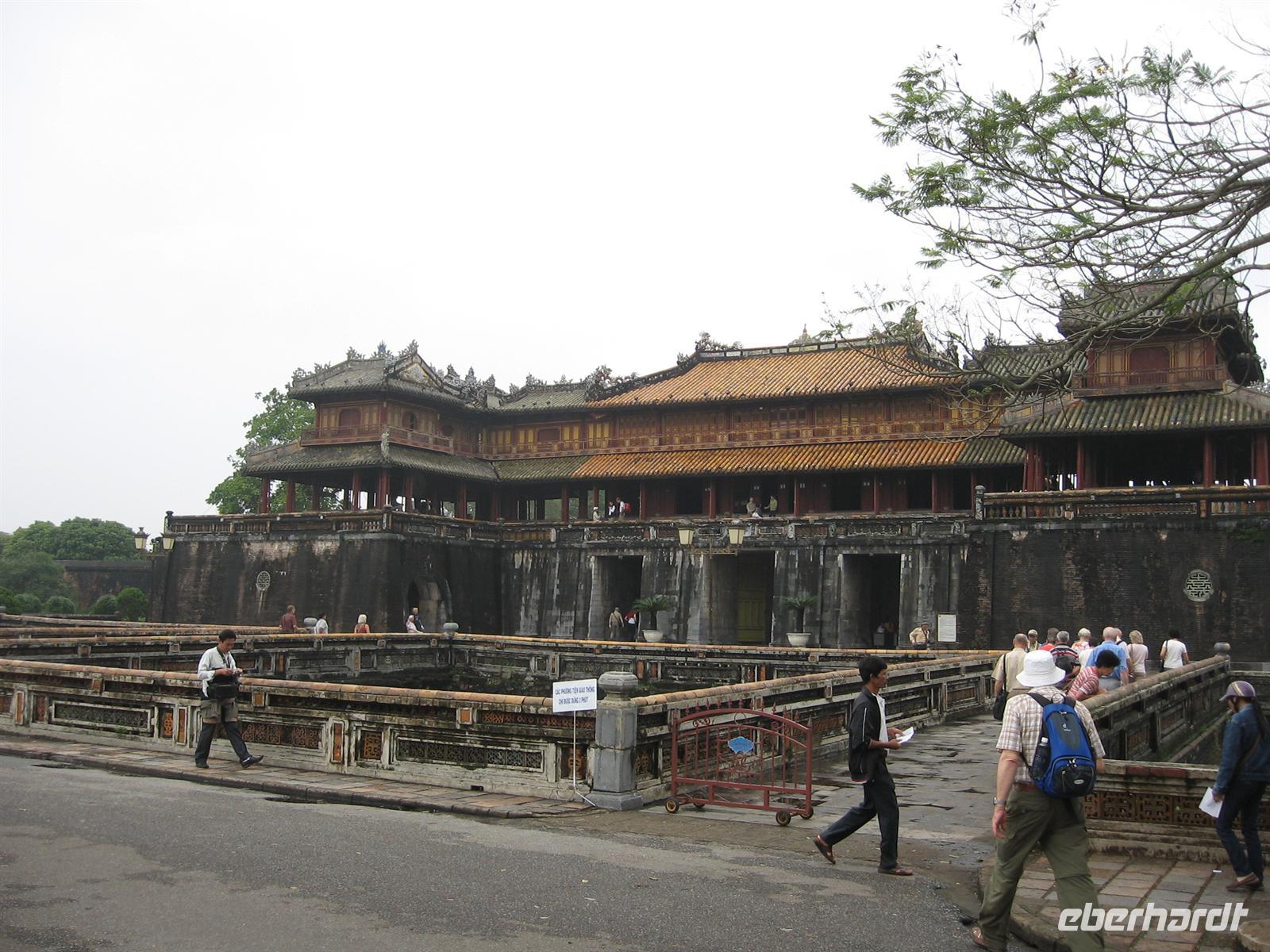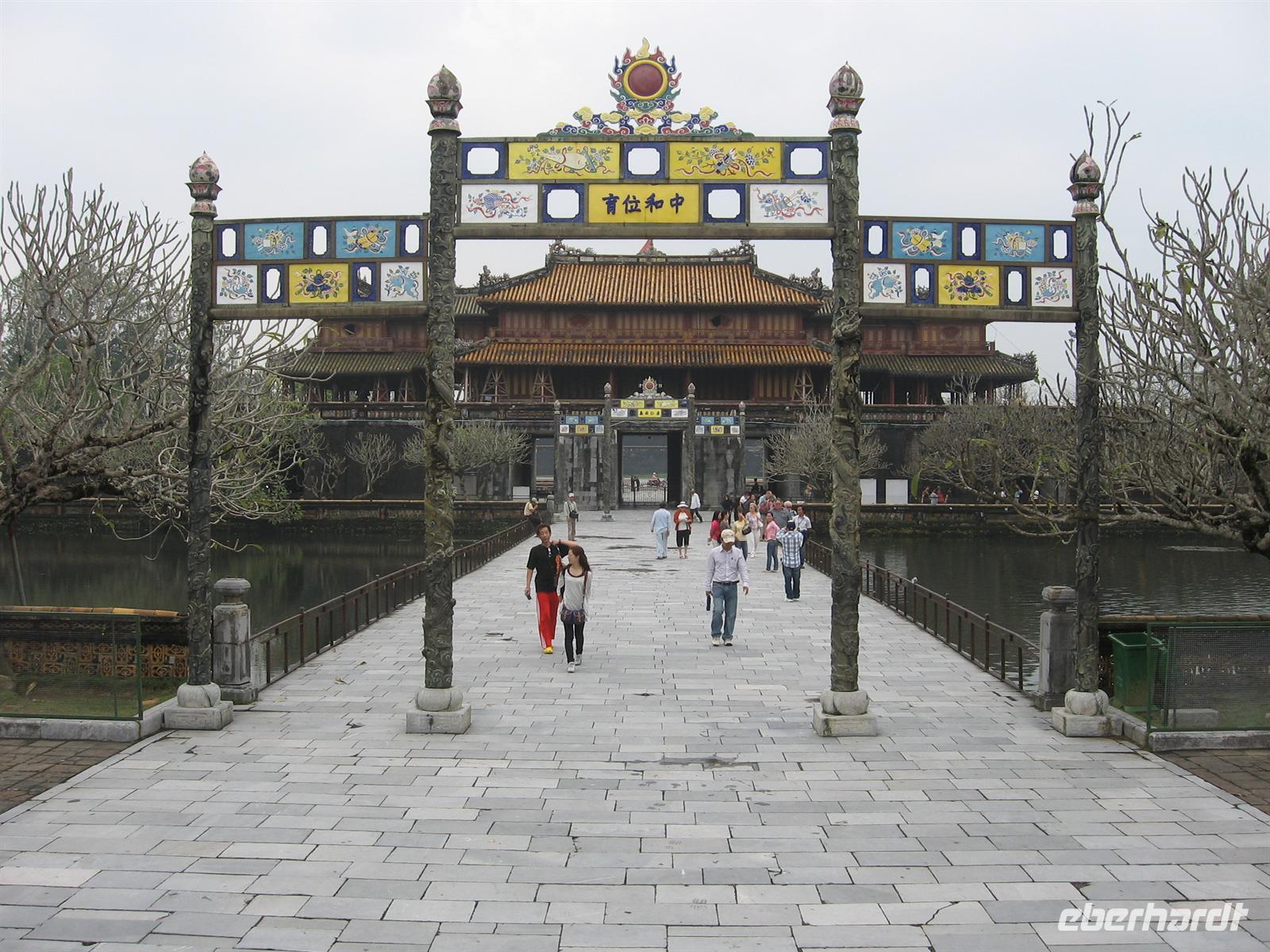 Gleich am Eingang befindet sich der Turm der Pagode, welchen man schon von weitem sehen kann. Es ist in Hue die älteste Pagode, sie stammt aus dem Jahre 1601 und wurde durch den Fürsten Nguyen Hoang errichtet. Ein Traum wies ihm die richtige Stelle zum Bau dieses Heiligtums. Nach der Besichtigung fahren wir mit dem Bus in die Innenstadt zurück. Hue als alte Kaiserstadt in Vietnam besitzt, ähnlich wie Peking, einen Kaiserpalast. Der Kaiser Gia Long ordnete 1802 den Bau der Zitadelle an und so wurde Hue bis 1945 Sitz des Kaisers und Hauptstadt. Der letzte Kaiser Bao Dai verkündete hier 1945 seinen Rücktritt. Wir laufen durch die weitflächige Anlage und sehen neben dem Eingangsbereich mit dem Mittagstor auch die Halle der höchsten Harmonie, das Theater und den Generationentempel. Das Wetter übrigens hält aus, es regnet nicht. Nicht sehr weit ist es von hier bis zum Dong-Ba-Markt, wo wir einige exotische Früchte probieren u.a Rambutan, eine Frucht die zur Familie der Litschis gehört. Nach einer Mittagspause, wie immer mit Nudelsuppe oder gebratenen Nudeln, fahren wir zu den außerhalb von Hue gelegenen Kaisergräbern. Wir werden zwei Anlagen besuchen, die des vierten Kaisers Tu Duc (1829-1883) und des zwölften Kaisers Khai Dinh (1885-1925).