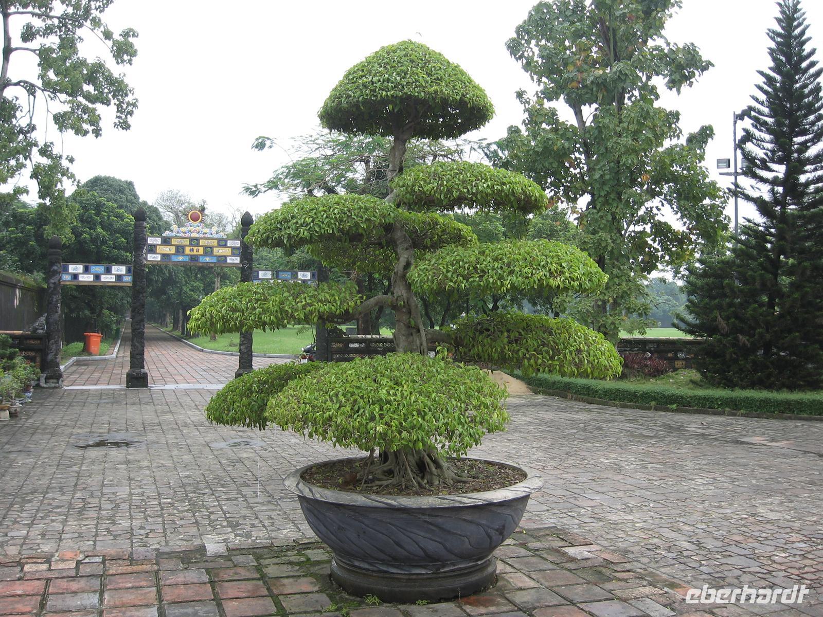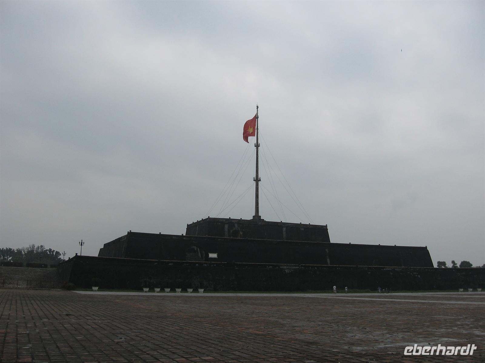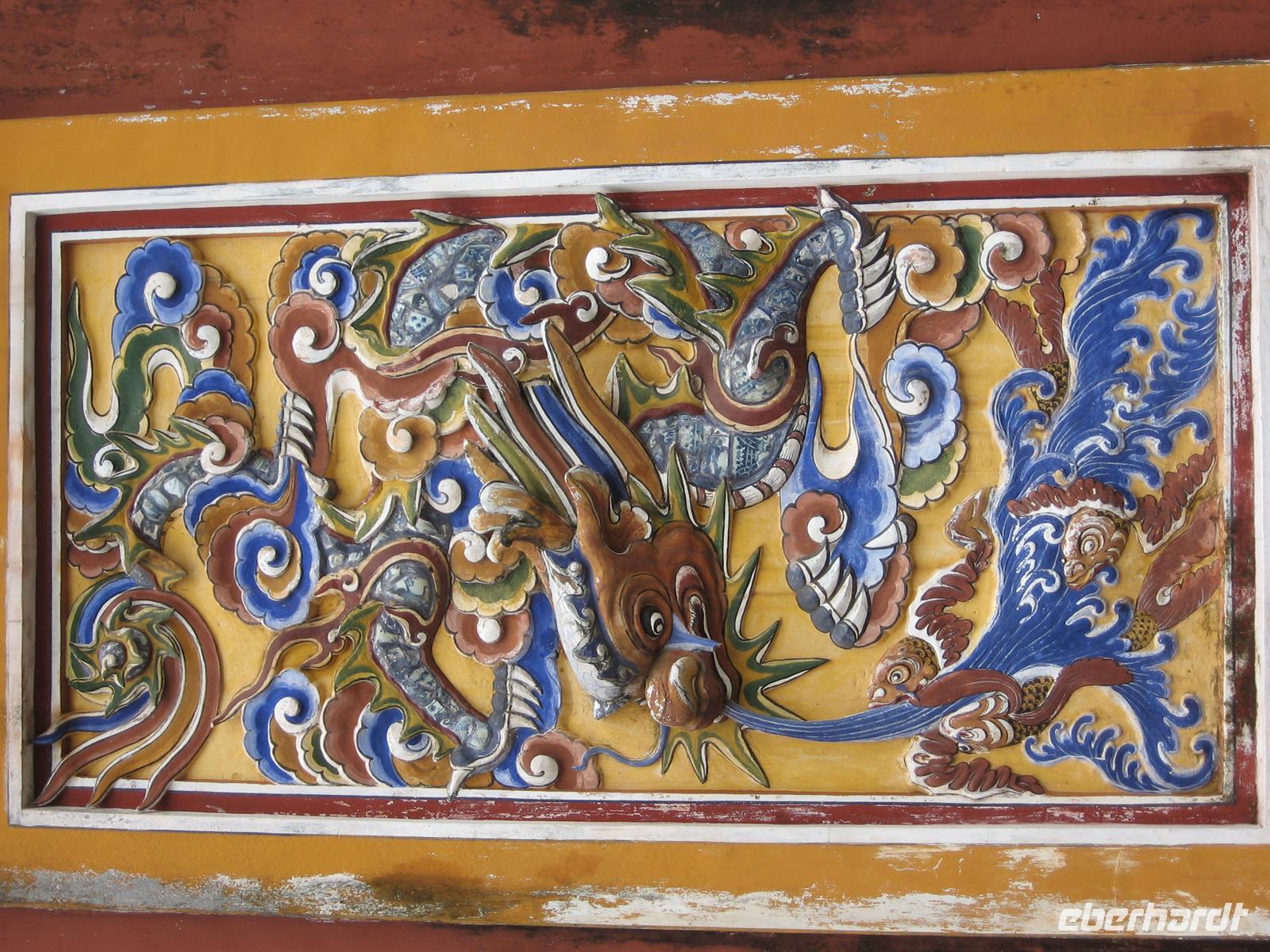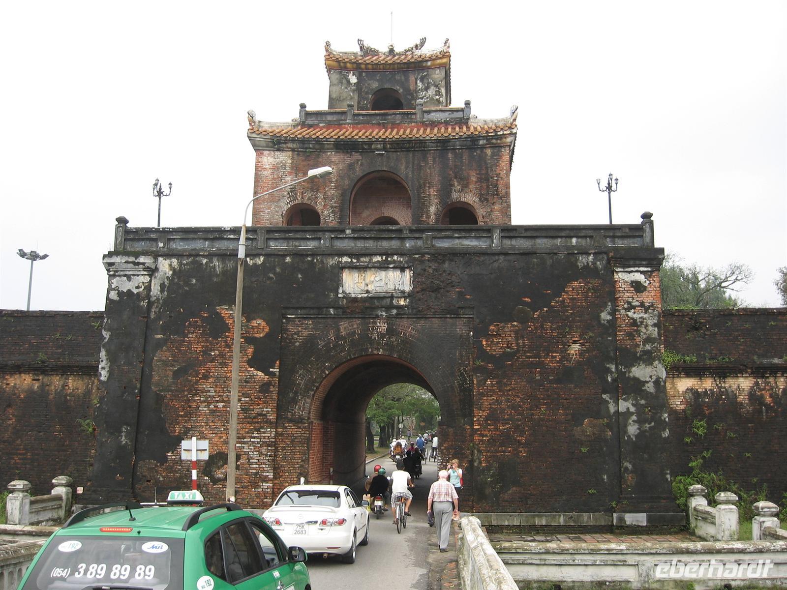 Gleich am Eingang befindet sich der Turm der Pagode, welchen man schon von weitem sehen kann. Es ist in Hue die älteste Pagode, sie stammt aus dem Jahre 1601 und wurde durch den Fürsten Nguyen Hoang errichtet. Ein Traum wies ihm die richtige Stelle zum Bau dieses Heiligtums. Nach der Besichtigung fahren wir mit dem Bus in die Innenstadt zurück. Hue als alte Kaiserstadt in Vietnam besitzt, ähnlich wie Peking, einen Kaiserpalast. Der Kaiser Gia Long ordnete 1802 den Bau der Zitadelle an und so wurde Hue bis 1945 Sitz des Kaisers und Hauptstadt. Der letzte Kaiser Bao Dai verkündete hier 1945 seinen Rücktritt. Wir laufen durch die weitflächige Anlage und sehen neben dem Eingangsbereich mit dem Mittagstor auch die Halle der höchsten Harmonie, das Theater und den Generationentempel. Das Wetter übrigens hält aus, es regnet nicht. Nicht sehr weit ist es von hier bis zum Dong-Ba-Markt, wo wir einige exotische Früchte probieren u.a Rambutan, eine Frucht die zur Familie der Litschis gehört. Nach einer Mittagspause, wie immer mit Nudelsuppe oder gebratenen Nudeln, fahren wir zu den außerhalb von Hue gelegenen Kaisergräbern. Wir werden zwei Anlagen besuchen, die des vierten Kaisers Tu Duc (1829-1883) und des zwölften Kaisers Khai Dinh (1885-1925).