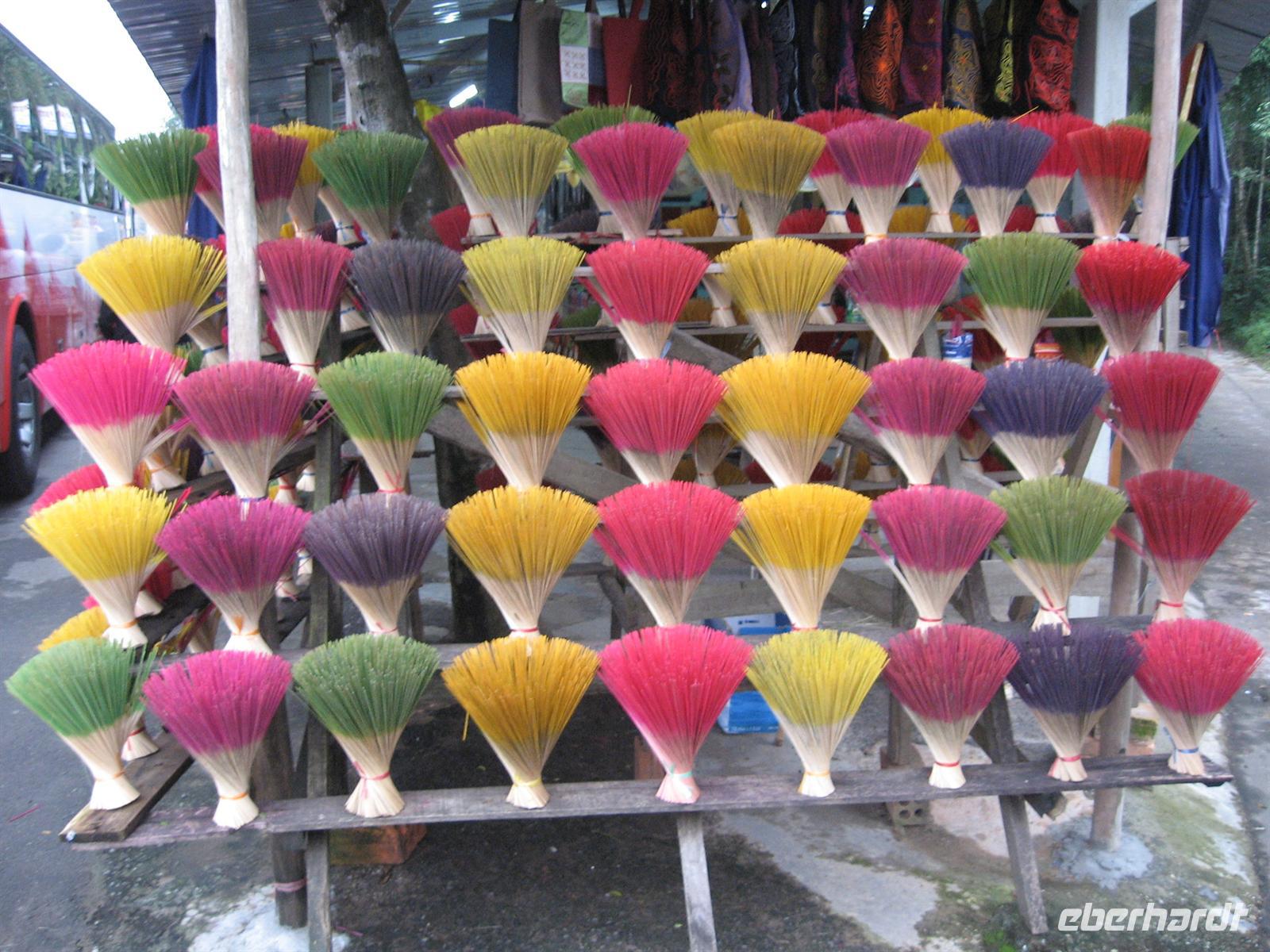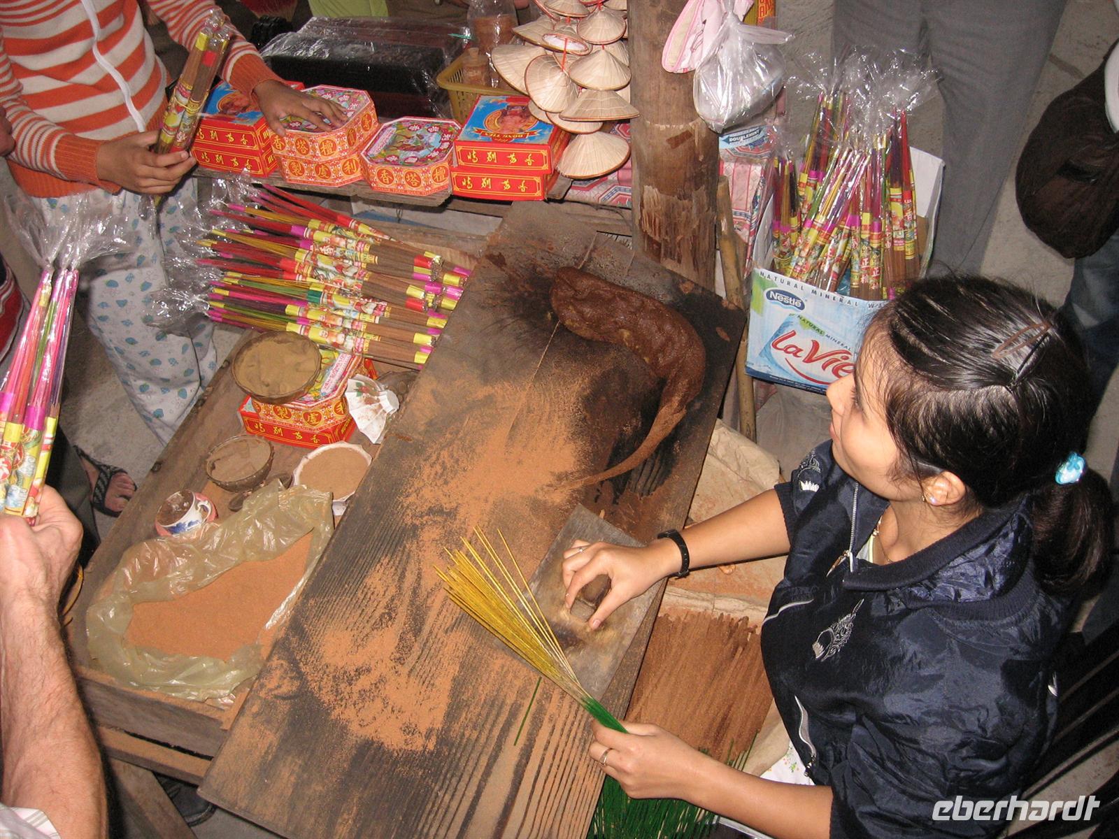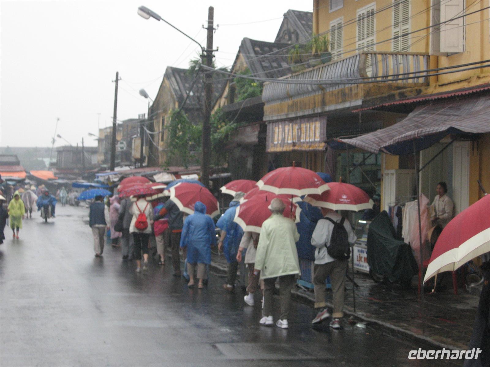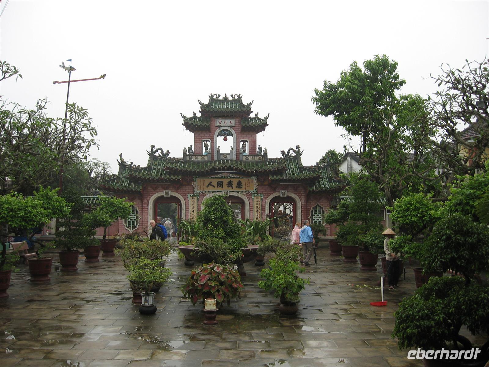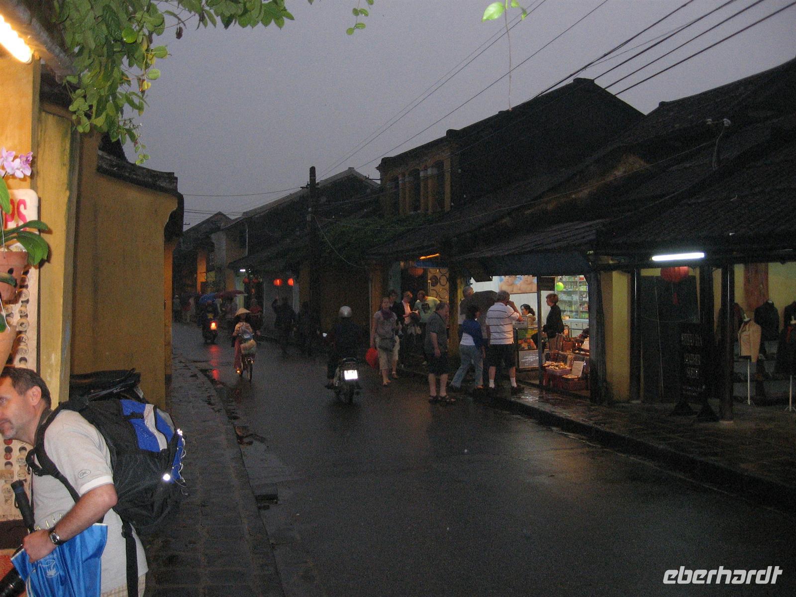 In der Nacht hat es durchweg geregnet, das sind noch die Nachwehen des Monsunregens. Als wir zur Besichtigung aufbrechen nieselt es immer noch. Die kleine Altstadt der alten Hafenstadt hat ein typisches südostasiatisches Flair und das ist ein Grund, weshalb sie zum UNESCO Weltkulturerbe gehört. Zuerst laufen wir über den Fischmarkt, wo am Morgen die Fänge der letzten Nacht verkauft werden. Wie immer auf den Märkten hier herrscht eine betriebsame Stimmung. Viele Frauen die verkaufen und einkaufen. Und immer wieder schiebt sich hupend ein Moped durch die engen Reihen des Marktes. Warum das sein muss verstehen wir nicht. So gehen wir weiter zur Versammlungshalle der Chinesen aus Fujian. Im 16./17. Jh. ließen sich hier zahlreiche Chinesen nieder, später auch Japaner und Holländer. 1300 Chinesen leben heute immer noch in der Stadt. Ihre Versammlungshallen wurden zum Ort der Religionsausübung und sind es heute immer noch. An der Decke hängen große Räucher-Spiralen, welche einige Tage glimmen. In der Mitte hängen dann Zettel mit wünschen für Gesundheit etc. Am alten Hafen entlang, wo es heute hauptsächlich Ausflugsboote für Touristen liegen, laufen wir zur japanischen Brücke. Die schlichte, überdachte,