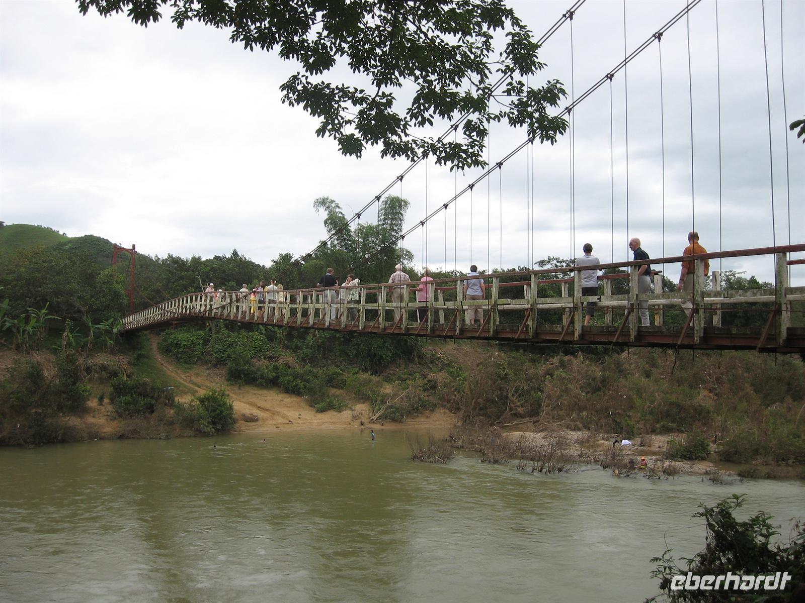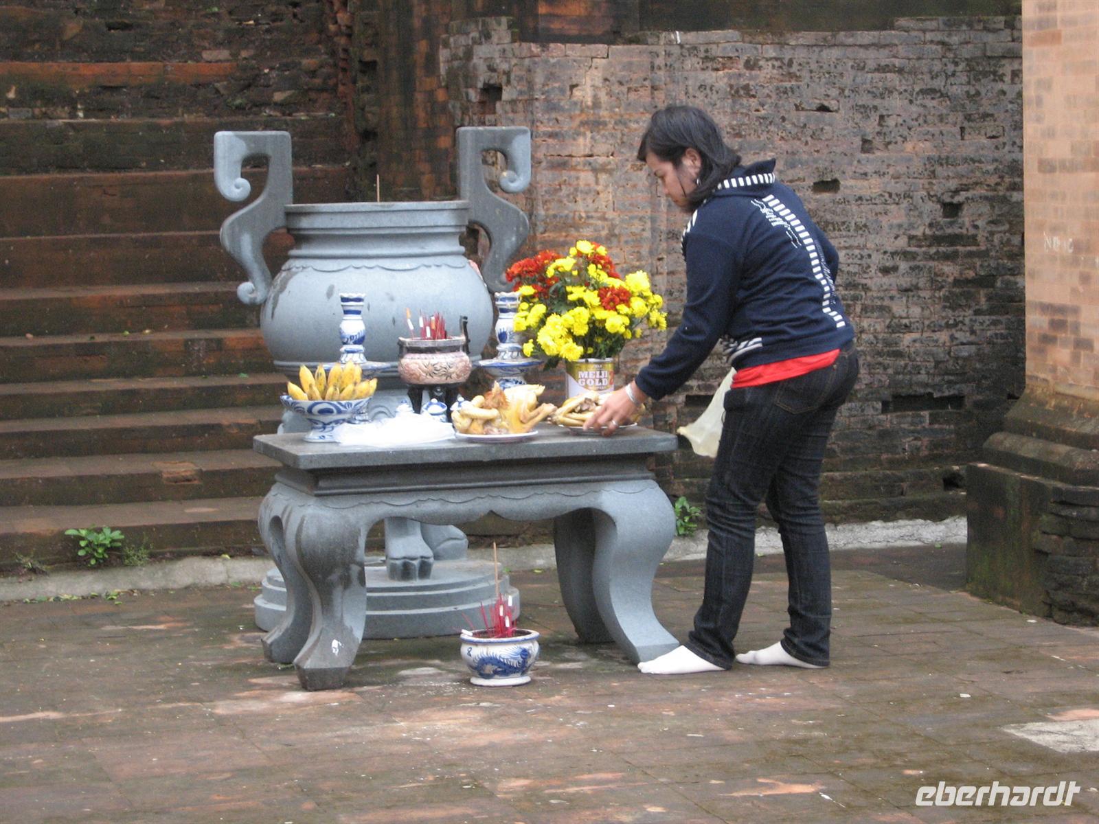 Holzbrücke beherbergt auch noch eine Brückenpagode, die dem Herrscher des Nordens geweiht ist. Diesem werden die Macht über Wind, Regen und andere schlechte Einflüsse zugeschrieben. Wahrscheinlich hat er heute seinen schlechten Tag, den immer wieder schickt er Regen zu uns hinab. Gleich nebenan können wir einen Blick in eines der traditionellen Häuser nehmen. Das Phung-Hung-Haus ist seit acht Generationen im Besitz derselben Familie. Hoi An ist auch berühmt für seine zahlreichen Schneidereien. Hier kann man sich günstig etwas nähen lassen. Diese Gelegenheit lassen sich auch einige Gäste unserer Gruppe nicht entgehen. Ob Rock, Hemd oder Anzug, alles wird über Nacht ins Hotel geliefert. Ich lasse mich für einen Anzug vermessen, suche mir einen schönen Stoff aus. Am Abend kommt die Schneiderin zur Anprobe ins Hotel. Nach einer Mittagspause machen wir noch eine Bootsfahrt auf den Thu Bon River. Auf der Cam-Kim-Insel besichtigen wir eine Schreinerei und auf der Thanh Ha besichtigen wir traditionelle Töpfereien. Immer wieder begleiten uns dabei Regenschauer und wir sind froh als wir den Bus wieder erreichen. Mit einigen Gästen laufen wir noch etwas durch die Stadt und genießen einen Ca Phe.