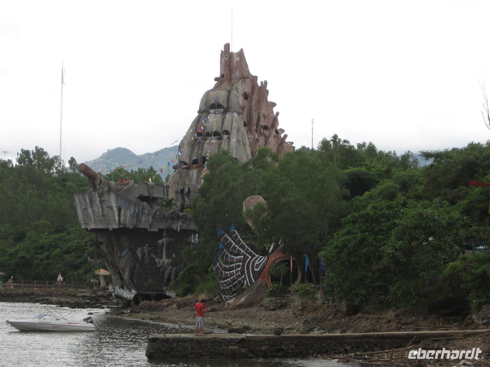 Das Frühstück reißt das Abendessen wieder raus, alle Wünsche werden erfüllt. Danach gehen wir auf Bootstour durch die Bucht von Nha Trang. Erster Anlaufpunkt ist das Aquarium, wo es Fische zu betrachten gibt, die in der Bucht leben. Imposanter erscheint das Bauwerk in welchem alles untergebracht ist. Dabei handelt es sich um ein Schiff, welches aus Beton gebaut wurde. Danach laufen wir eine der Inseln an, hier gibt es die Möglichkeit zu baden, was auch die meisten Gäste ausgiebig nutzen. Am interessantesten ist die Dusche, Sie besteht aus einem Eimer voll Wasser mit einer Schöpfkelle.