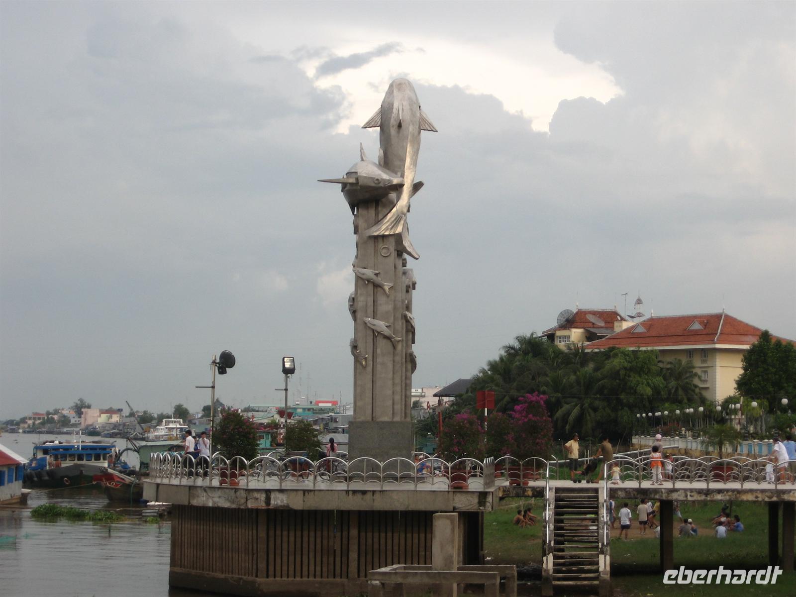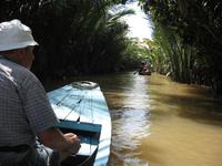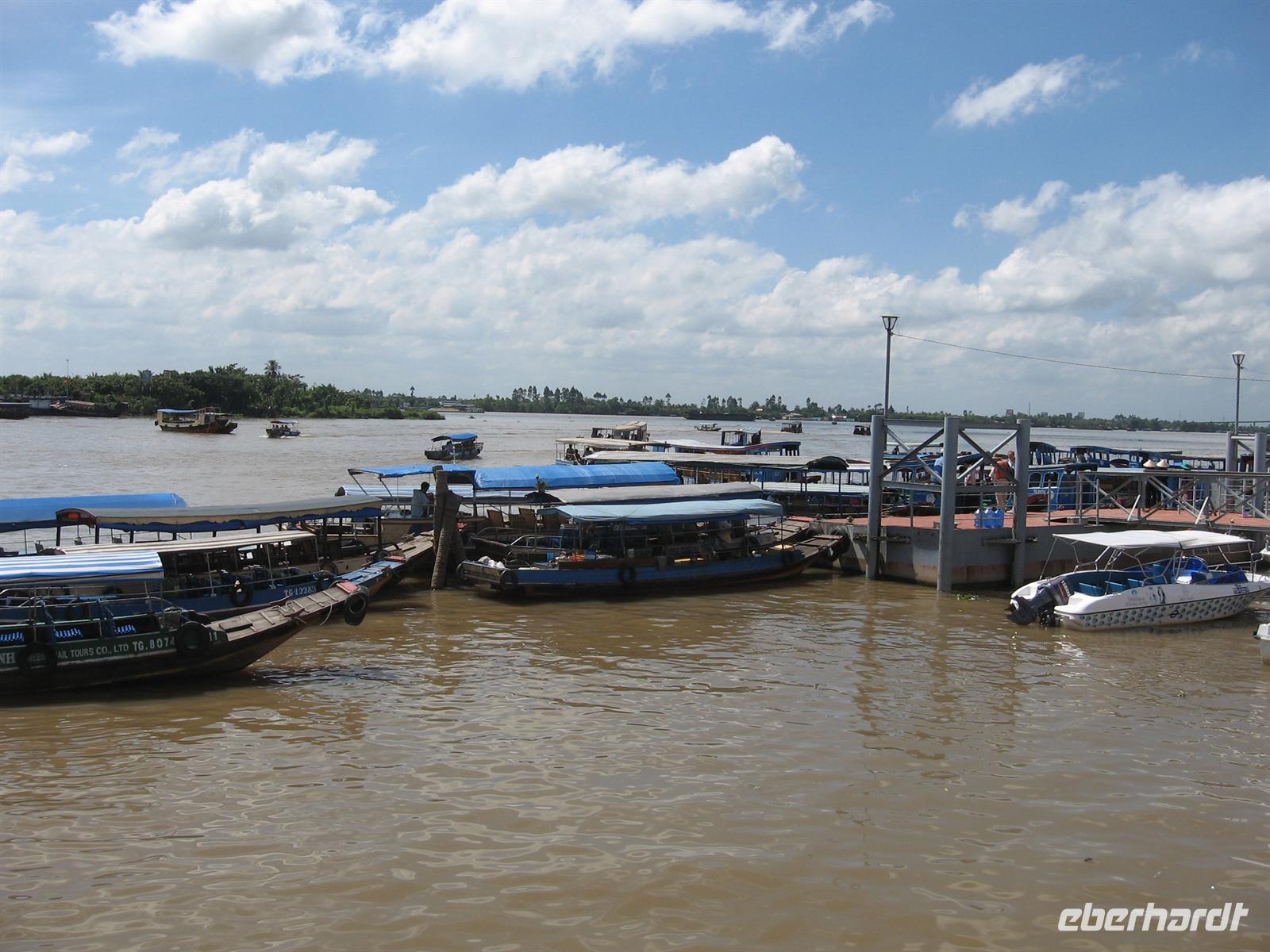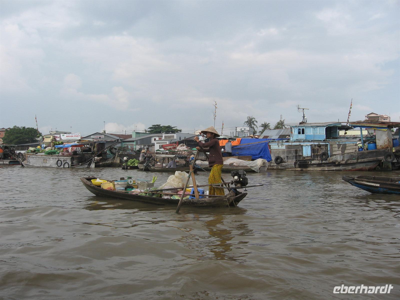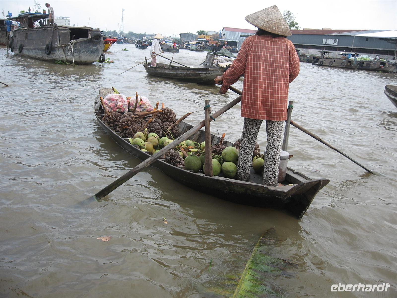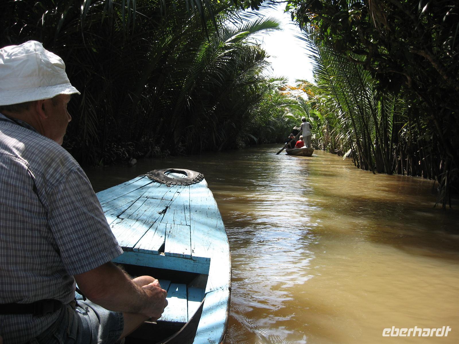 Mit dem Bus fahren wir weiter bis My Tho, steigen dann in ein Boot um. Im Mekong Delta spielt sich alles Leben am und im Wasser ab. Der Mekong einer der größten Ströme in Asien, er entspringt im tibetischen Hochland, fließt durch Südwestchina, bildet die Grenze zwischen Burma und Laos, fließt durch Laos und markiert erneut die Grenze zwischen zwei Staaten, Laos und Thailand. Danach fließt er durch Kambodscha, wobei er sich hinter Phnom Penh in den oberen und unteren Mekong aufteilt. In Vietnam teilt er sich dann in acht Hauptarme und einen Kanal auf, die an verschiedenen Stellen ins Meer fließen. Obwohl er nur acht Mündungsarme hat, wird er in Vietnam als „Neun-Drachen-Fluss“ bezeichnet, nach der in der chinesischen Mythologie heiligen Zahl 9. Insgesamt ist der Mekong 4800 Kilometer lang, auf Südvietnam entfallen die letzten 200 Kilometer. Das Mekong Delta umfasst in etwa eine Fläche von 70000 km².