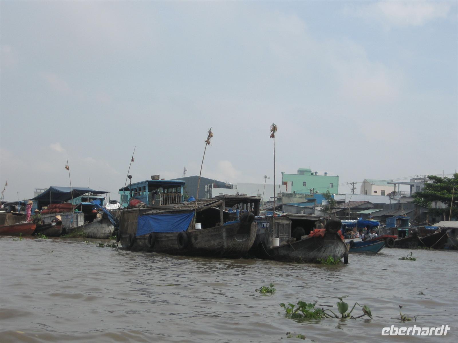 Nach dem Frühstück fahren wir von Can Tho mit dem Boot zum schwimmenden Markt. Dort wird von Boot zu Boot gehandelt, in erster Linie Obst und Gemüse aber auch Getränke und Küchengeräte. Die meisten der Boote dienen den Besitzern auch als Wohnung für die ganze Familie. Was es zu verkaufen gibt wird an einer langen Stange am Boot angezeigt, so dass man schon von weitem sieht was es gibt. Viele der Boote scheinen überladen, vor allem auch die uns immer wieder begegnenden, mit Sand beladenen, Schiffe. Zurück in Can Tho bleibt noch etwas Zeit für einen Kaffee bevor wir weiter nach Chau Doc fahren. Unterwegs halten wir noch an einem Cao Dai Tempel.