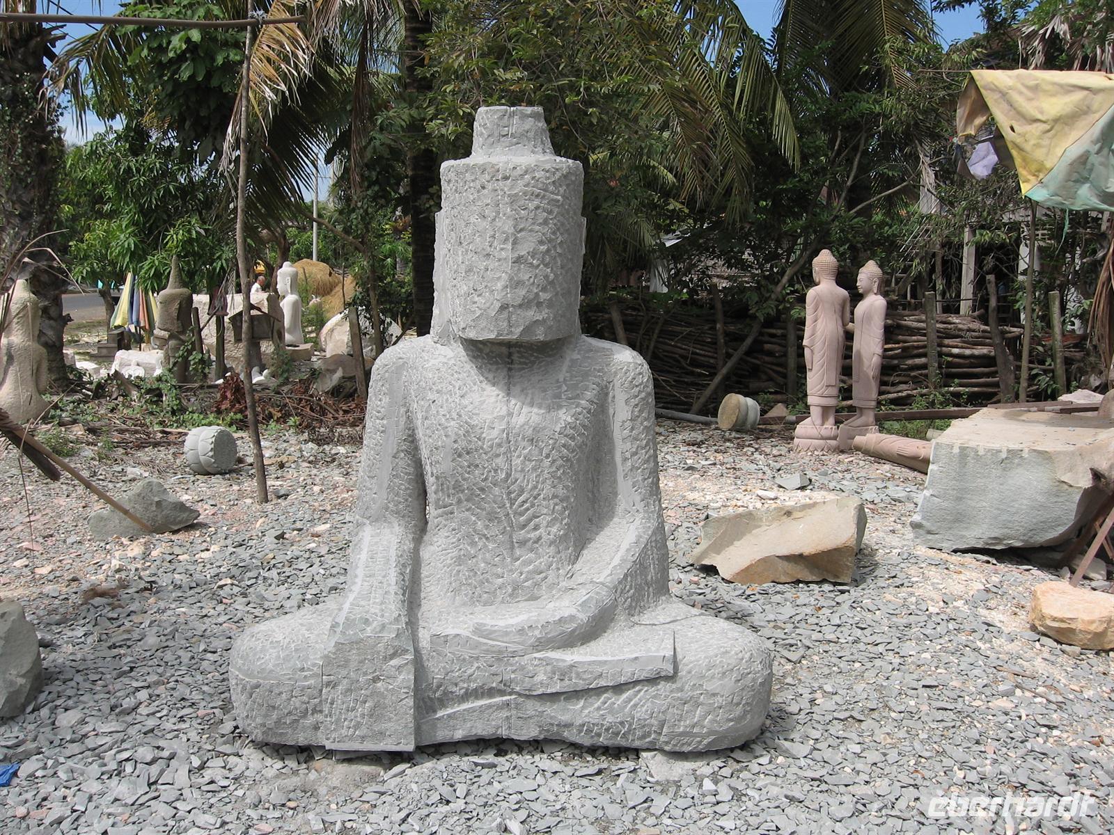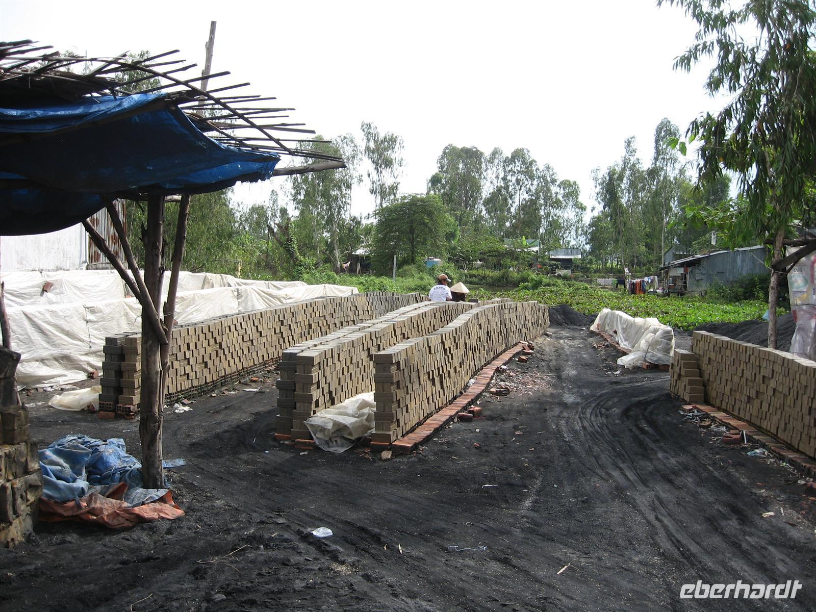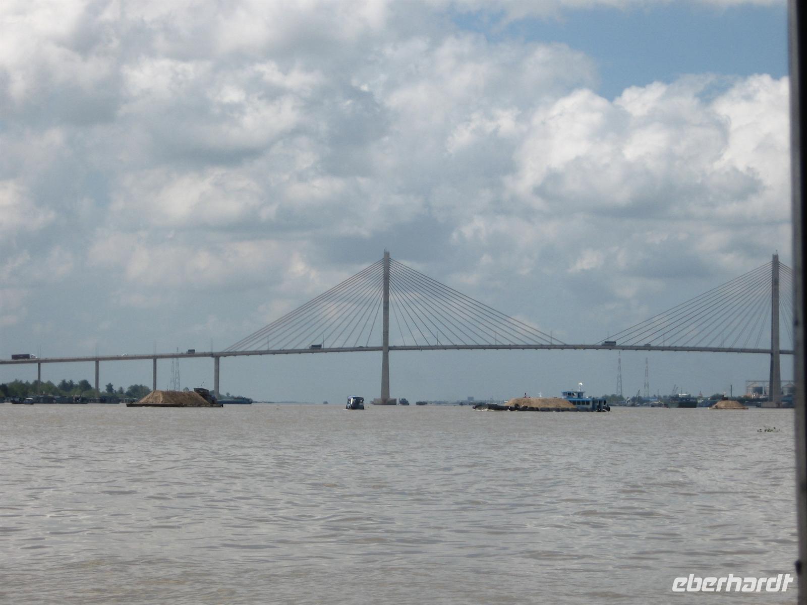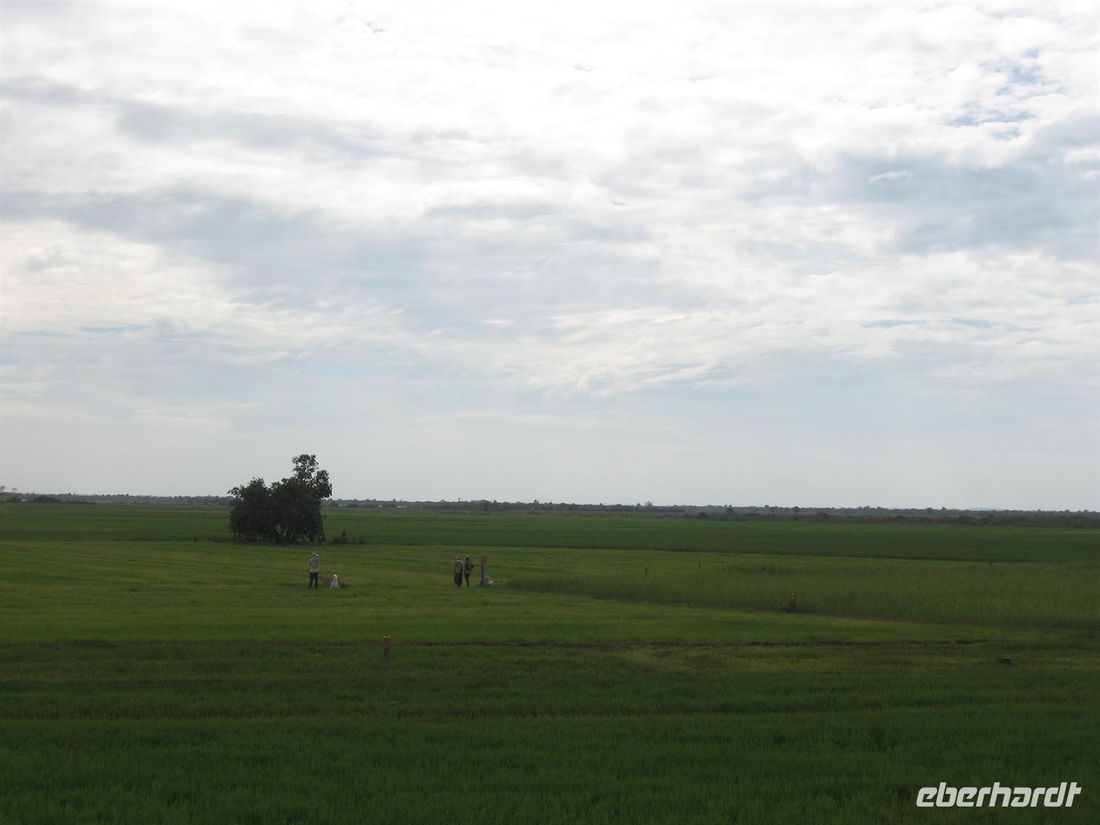 Entlang der Straßen sehen wir wieder unzählige Händler, die alle vor Ihren Häusern etwas verkaufen wollen, wir überqueren zahlreiche Nebenarme und Kanäle des Mekong, sehen abgeerntete und neu bestellte Reis- und Gemüsefelder. Drei bis vier Ernten an Reis kann man hier einbringen. Der Boden hier ist sehr fruchtbar. Etwa alle zwei bis fünf Jahre kommt es hier zu schweren Überschwemmungen und durch den dabei vom Mekong mitgeführten und abgelagerten Sand und Schlamm bleibt die Bodenfruchtbarkeit erhalten.