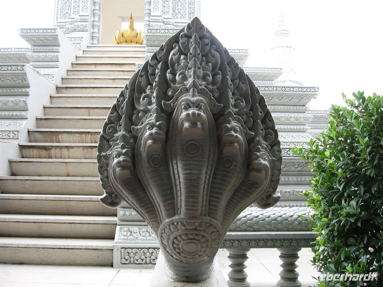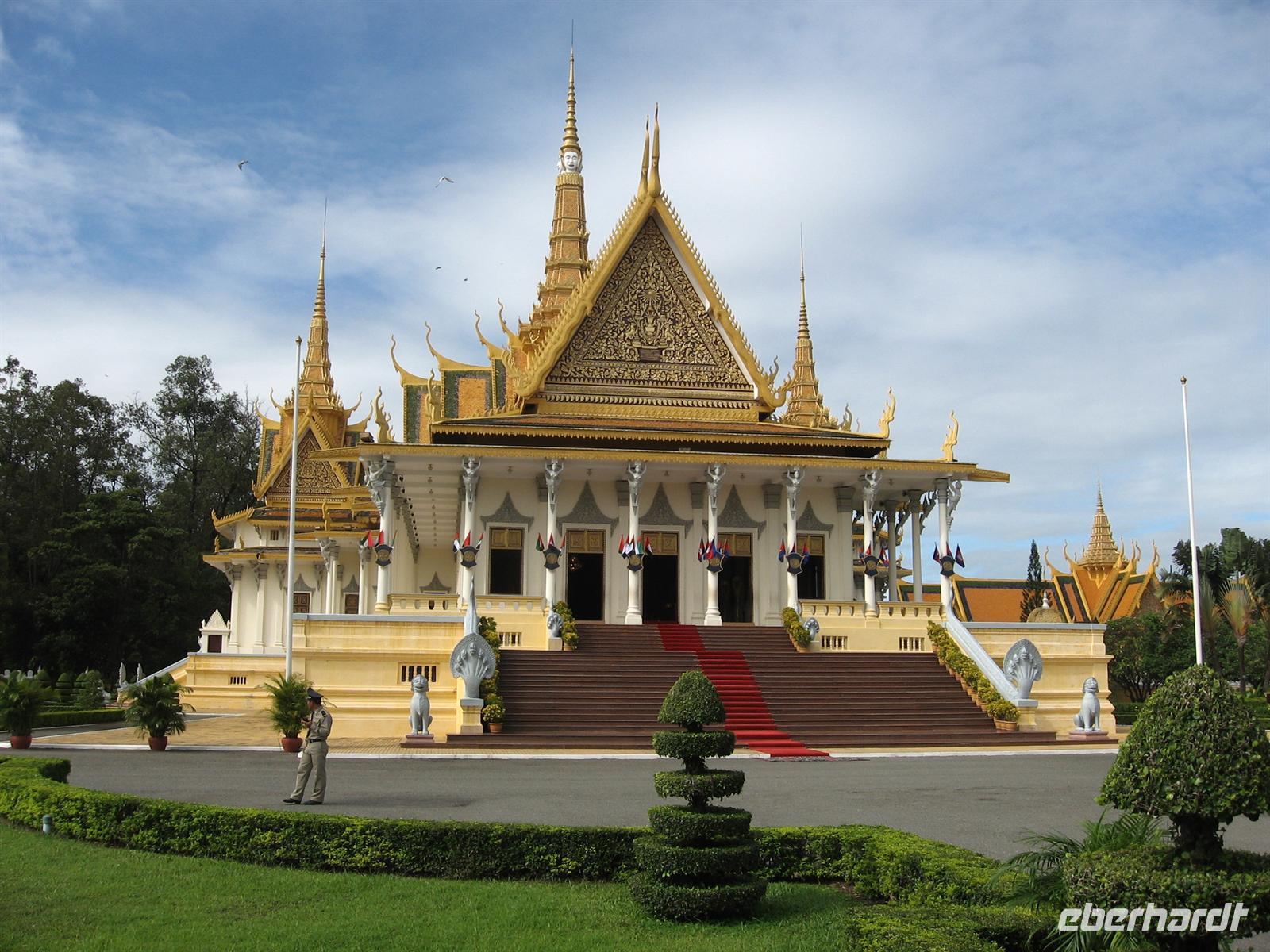 In Phnom Penh haben wir drei Besichtigungspunkte auf dem Programm. Zuerst fahren wir zum Königspalast. Die Palastanlage existiert seit 1886 an dieser Stelle, wurde zuerst aus Holz und später aus Stein gebaut. Das der königliche Palast an dieser Stelle gebaut wurde kommt nicht von ungefähr, er liegt genau an der Stelle wo der Tonle Sap Fluss in den Mekong mündet. Und so kann man vom Palast das wichtigste Fest in ganz Kambodscha gut beobachten, das Wasserfest. Wir haben sogar Glück, denn gerade als wir da sind wird es gefeiert. Zweimal im Jahr ändert der Tonle Sap seine Richtung und ein jedes mal wird das gefeiert. Außerdem weilt heute hoher Staatsbesuch bei König Norodom Sihamoni, dazu war sogar eine Ehrengarde angetreten. Allerdings hat das zur Folge, dass wir leider den Thronsaal nicht besichtigen dürfen. Unser Rundgang führt uns auch zur Silberpagode. Auf dem Fußboden liegen 5329 in Frankreich gefertigte Bodenfließen aus Silber, zu einem Gewicht von je 1,125 kg, also insgesamt knapp 6000 kg Silber. Einen Teil davon kann man sehen, aber der größte Teil ist, zum Schutz, mit Teppichen ausgelegt. Im Inneren ist auf einem