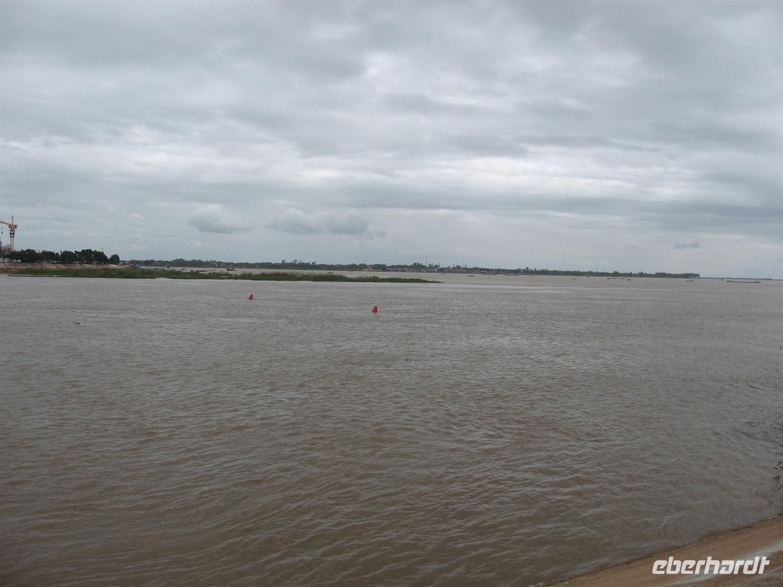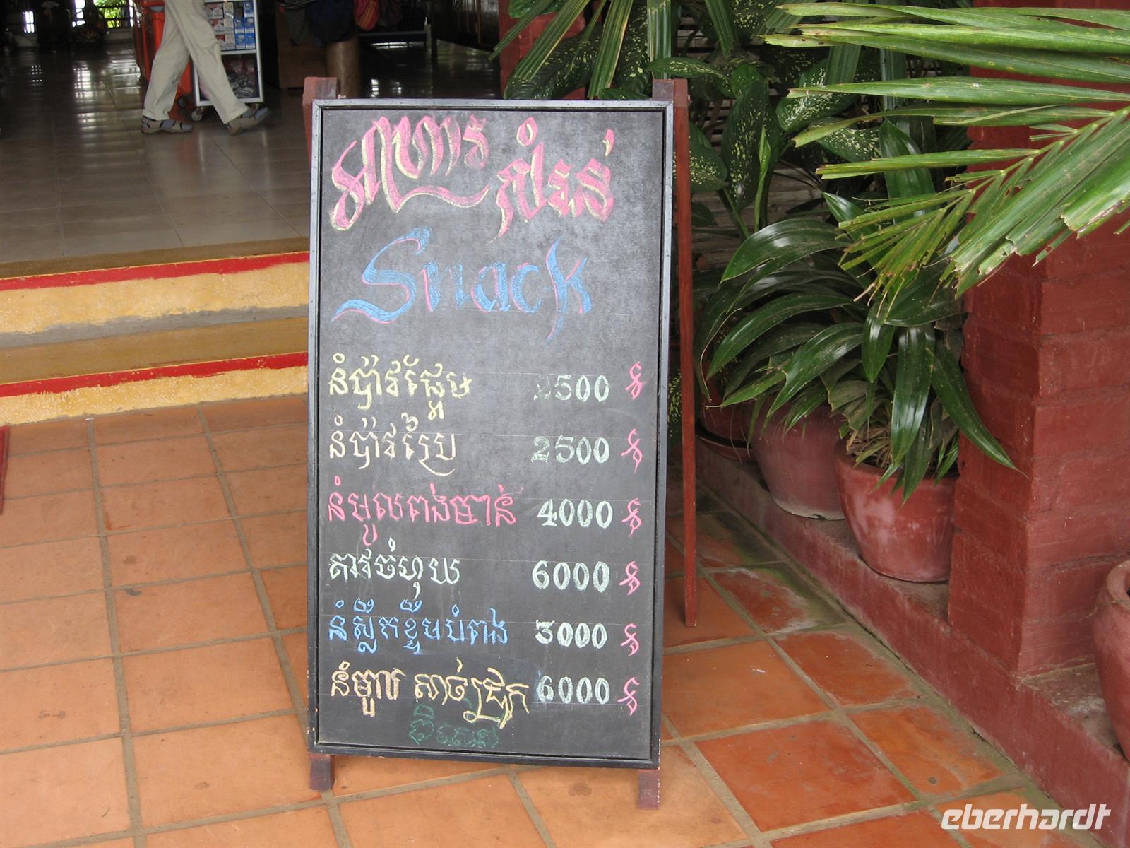 Toiletten sind vorhanden. Die Abwicklung der Abfertigung wird von einem Kurier übernommen. Wir müssen eine ganze Weile warten da mehrere Boote zur gleichen Zeit gekommen sind. Wir steigen wieder in das Boot und fahren nur wenige Minuten bis zur Grenzstation vom Königreich Kambodscha. Hier muss jeder an den Abfertigungsschalter, mehrere Stempel wandern in unseren Pass und schon sind wir auf dem Boot zurück. Auf dem Boot werden wir gut versorgt, Getränke sind frei und auch ein Picknick wird uns ohne zusätzliche Bezahlung geboten. 12,45 Uhr erreichen wir Phnom Penh und werden von unserem Reiseleiter Chim erwartet. Nach dem umladen des Gepäcks fahren wir zum Hotel Phnom Penh, unserer Unterkunft für die nächsten zwei Nächte. Das Hotel bietet uns allen Komfort. Der Nachmittag steht zur freien Verfügung und soll der Erholung dienen. So nutzen einige Gäste die Möglichkeit zur Massage, für uns recht preiswert und die Qualität ist sehr gut. Aber auch das Kaffee lockt in seiner Auslage mit leckerer Torte.