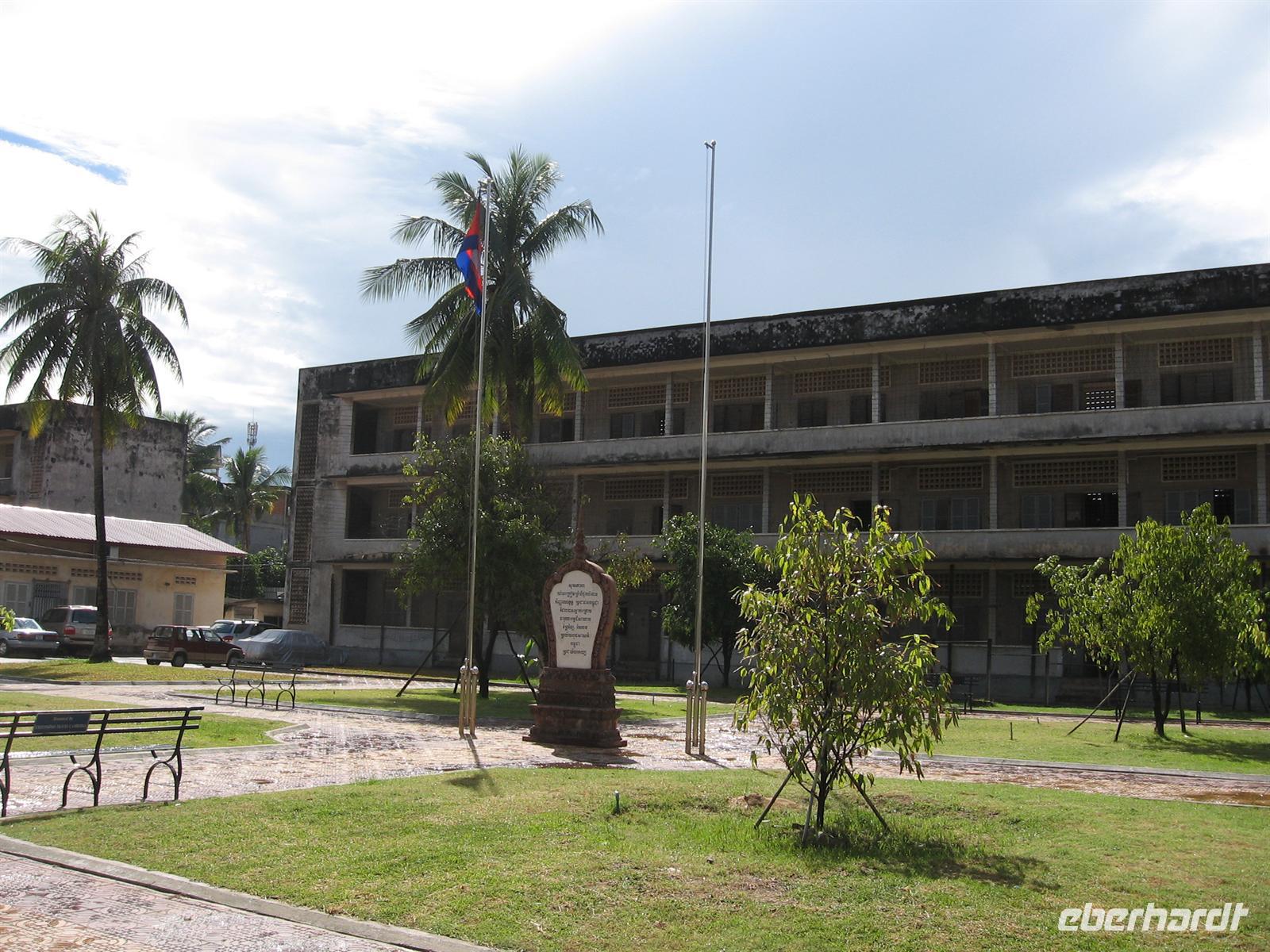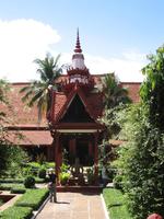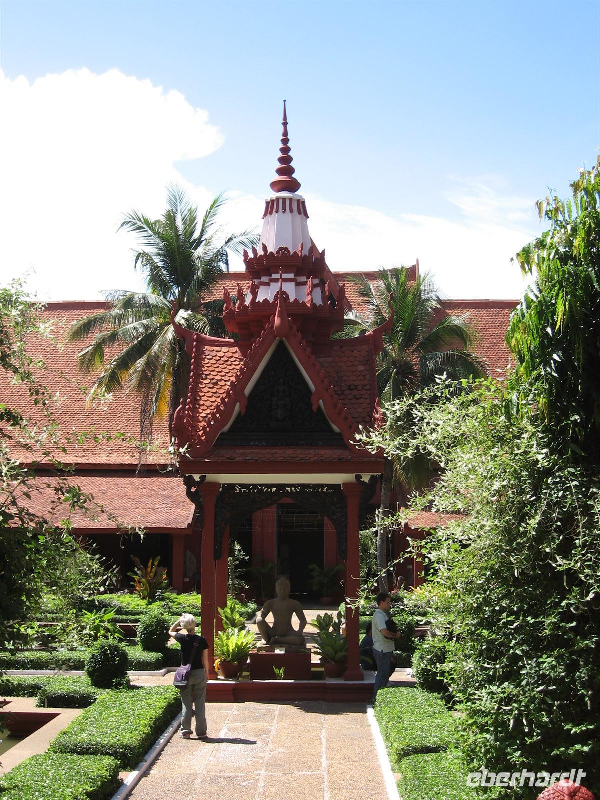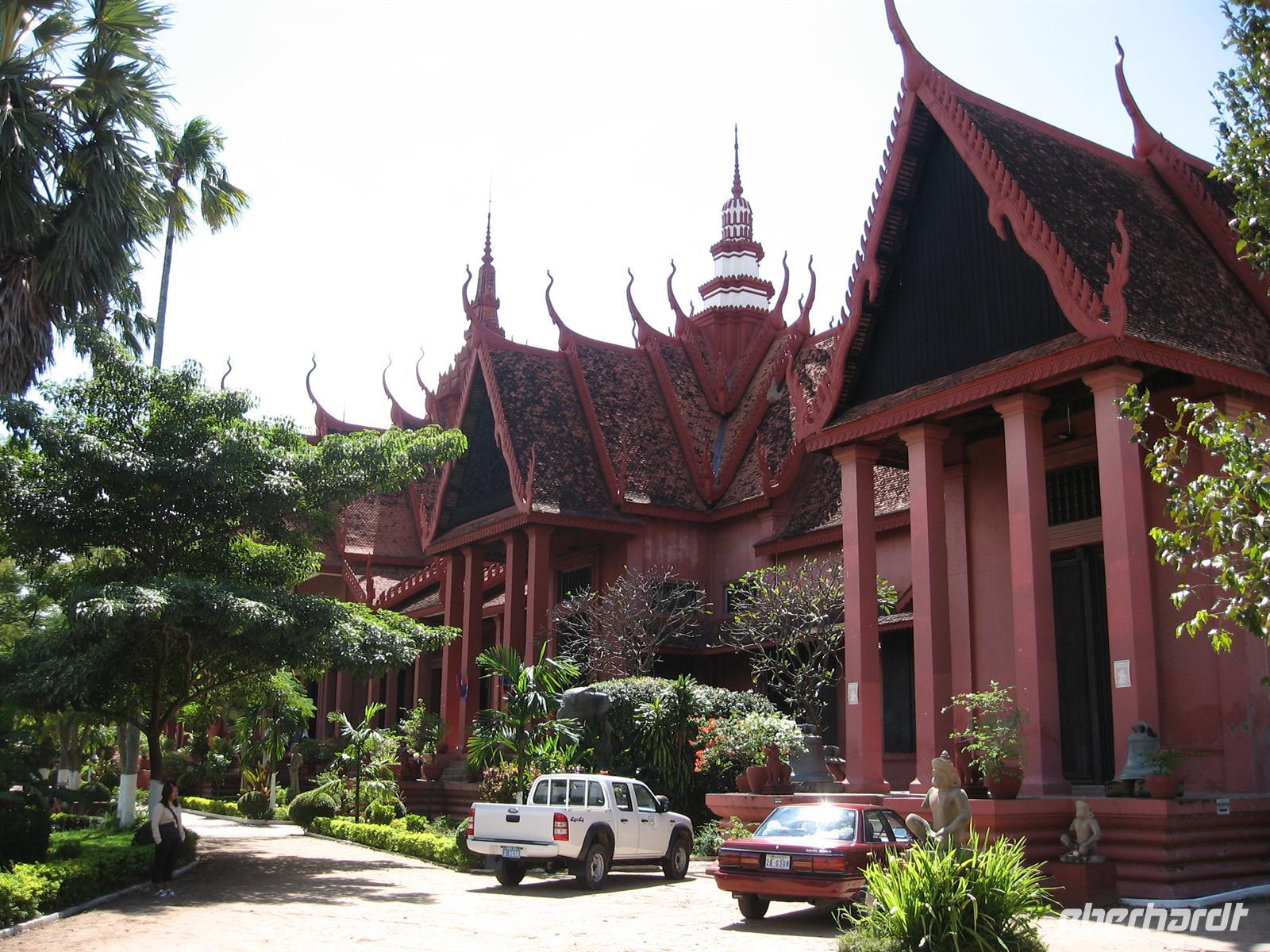 Altar eine grüne Buddhafigur zu sehen und davor steht in einer Glasvitrine eine Buddhafigur aus Purem Gold mit zahlreichen Edelsteinen verziert. Nicht weit entfernt vom Palast befindet sich das Nationalmuseum, ein markantes braunrotes Gebäude im traditionellen Khmerstil. Ausgestellt werden hier ca. 5000 Exponate, das Museum ist weltweit führend in der Sammlung von Khmerkunst. Die Khmer sind der Volksstamm der mit 90% in diesem Land die Stammbevölkerung stellt. Wir bestaunen die Ausstellungstücke aus den verschiedenen Epochen, vor allem sind es hinduistische Götter und Buddhafiguren. Abschließend besuchen wir noch das Hauptheiligtum der Stadt, das Wat Phnom. Ein kleiner Schrein erinnert an die Gründerin der Pagode, Frau Penh. Der Nachmittag steht wieder zur freien Verfügung. Ich biete meinen Gästen noch einen Besuch des Tuol-Sleng-Genozied-Museums an, einige entschließen sich dazu. Hier bekommen wir einen kleinen Eindruck vom schrecklichsten Kapitel kambodschanischer Geschichte. In diesem ehemaligen Gefängnis wurde zwischen 1976 und 1979 über 17000 Gefangene gefoltert und gedemütigt und anschließend zur Hinrichtung auf die Killing Fields gebracht. Schweigend verlassen wir das ehemalige Gefängnis, immer noch nicht begreifend, was in den Menschen vorgegangen sein muss, die diesen Völkermord zu verantworten haben. Zum Abendessen treffen wir uns alle wieder. Das Essen schmeckt gut, allerdings ist auch hier das Personal nicht das freundlichste. Vielleicht lag es ja am Wasserfest, das alle nur dahin wollen um dabei zu sein.