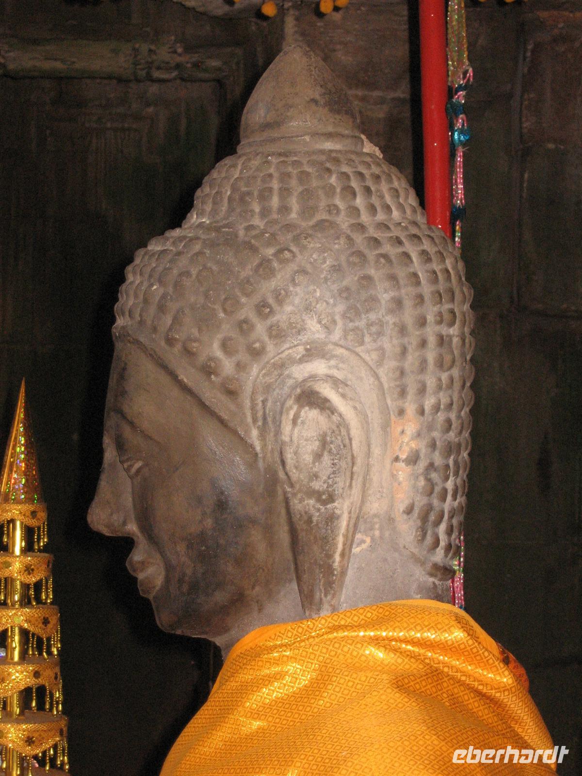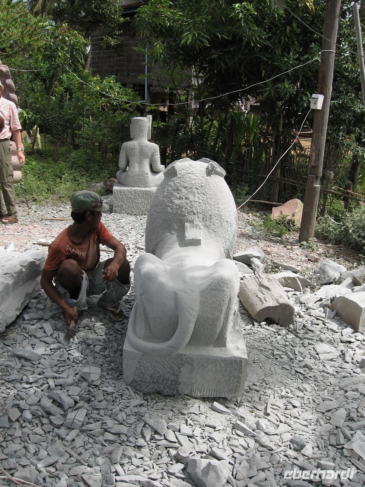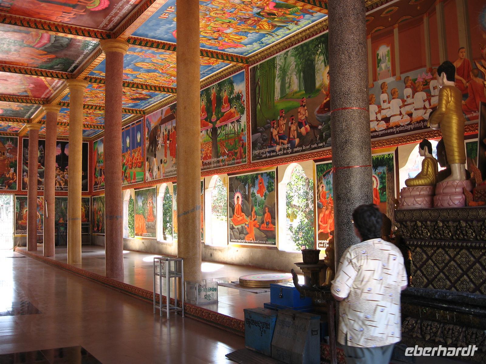 Altar eine grüne Buddhafigur zu sehen und davor steht in einer Glasvitrine eine Buddhafigur aus Purem Gold mit zahlreichen Edelsteinen verziert. Nicht weit entfernt vom Palast befindet sich das Nationalmuseum, ein markantes braunrotes Gebäude im traditionellen Khmerstil. Ausgestellt werden hier ca. 5000 Exponate, das Museum ist weltweit führend in der Sammlung von Khmerkunst. Die Khmer sind der Volksstamm der mit 90% in diesem Land die Stammbevölkerung stellt. Wir bestaunen die Ausstellungstücke aus den verschiedenen Epochen, vor allem sind es hinduistische Götter und Buddhafiguren. Abschließend besuchen wir noch das Hauptheiligtum der Stadt, das Wat Phnom. Ein kleiner Schrein erinnert an die Gründerin der Pagode, Frau Penh. Der Nachmittag steht wieder zur freien Verfügung. Ich biete meinen Gästen noch einen Besuch des Tuol-Sleng-Genozied-Museums an, einige entschließen sich dazu. Hier bekommen wir einen kleinen Eindruck vom schrecklichsten Kapitel kambodschanischer Geschichte. In diesem ehemaligen Gefängnis wurde zwischen 1976 und 1979 über 17000 Gefangene gefoltert und gedemütigt und anschließend zur Hinrichtung auf die Killing Fields gebracht. Schweigend verlassen wir das ehemalige Gefängnis, immer noch nicht begreifend, was in den Menschen vorgegangen sein muss, die diesen Völkermord zu verantworten haben. Zum Abendessen treffen wir uns alle wieder. Das Essen schmeckt gut, allerdings ist auch hier das Personal nicht das freundlichste. Vielleicht lag es ja am Wasserfest, das alle nur dahin wollen um dabei zu sein.