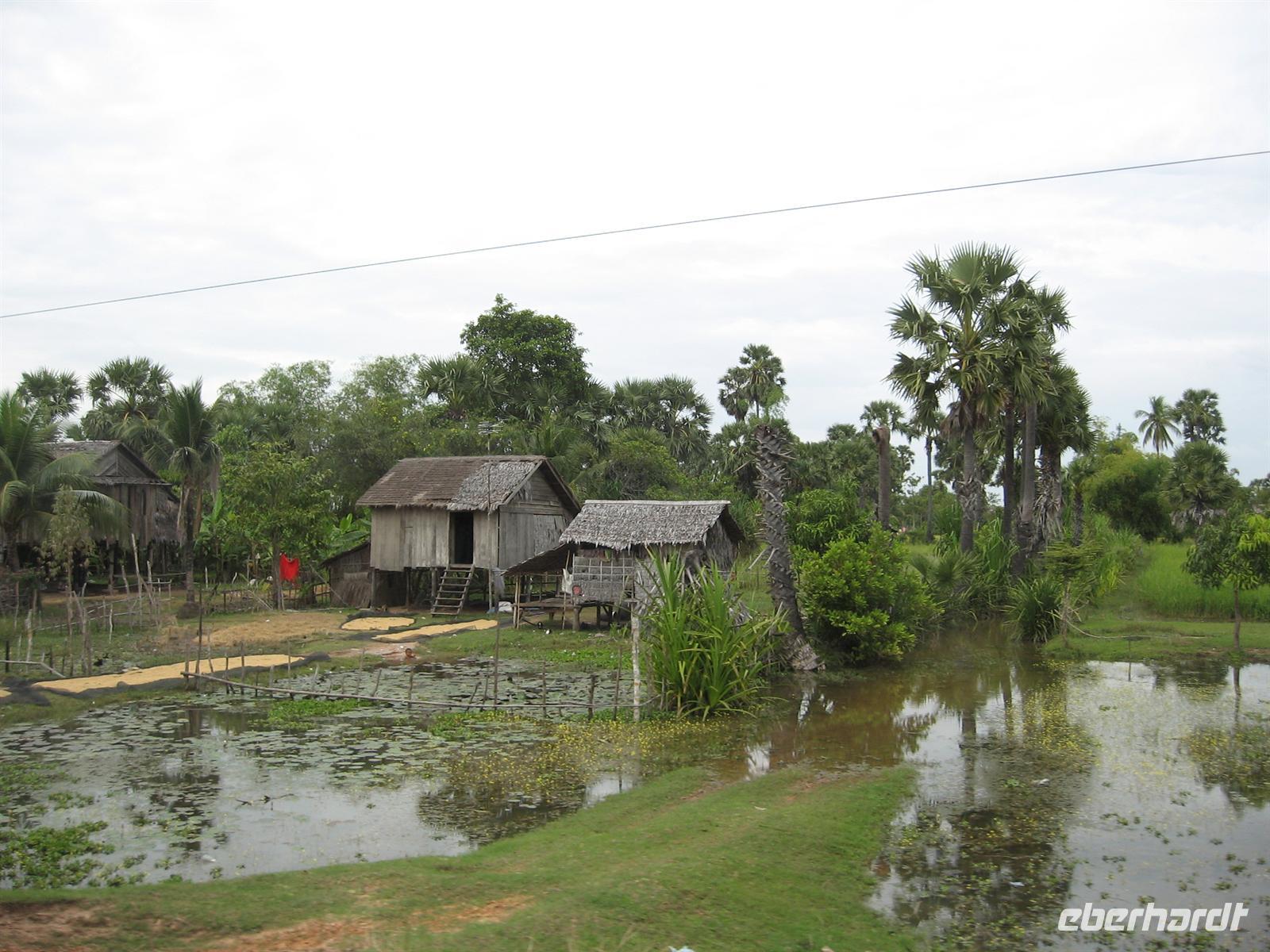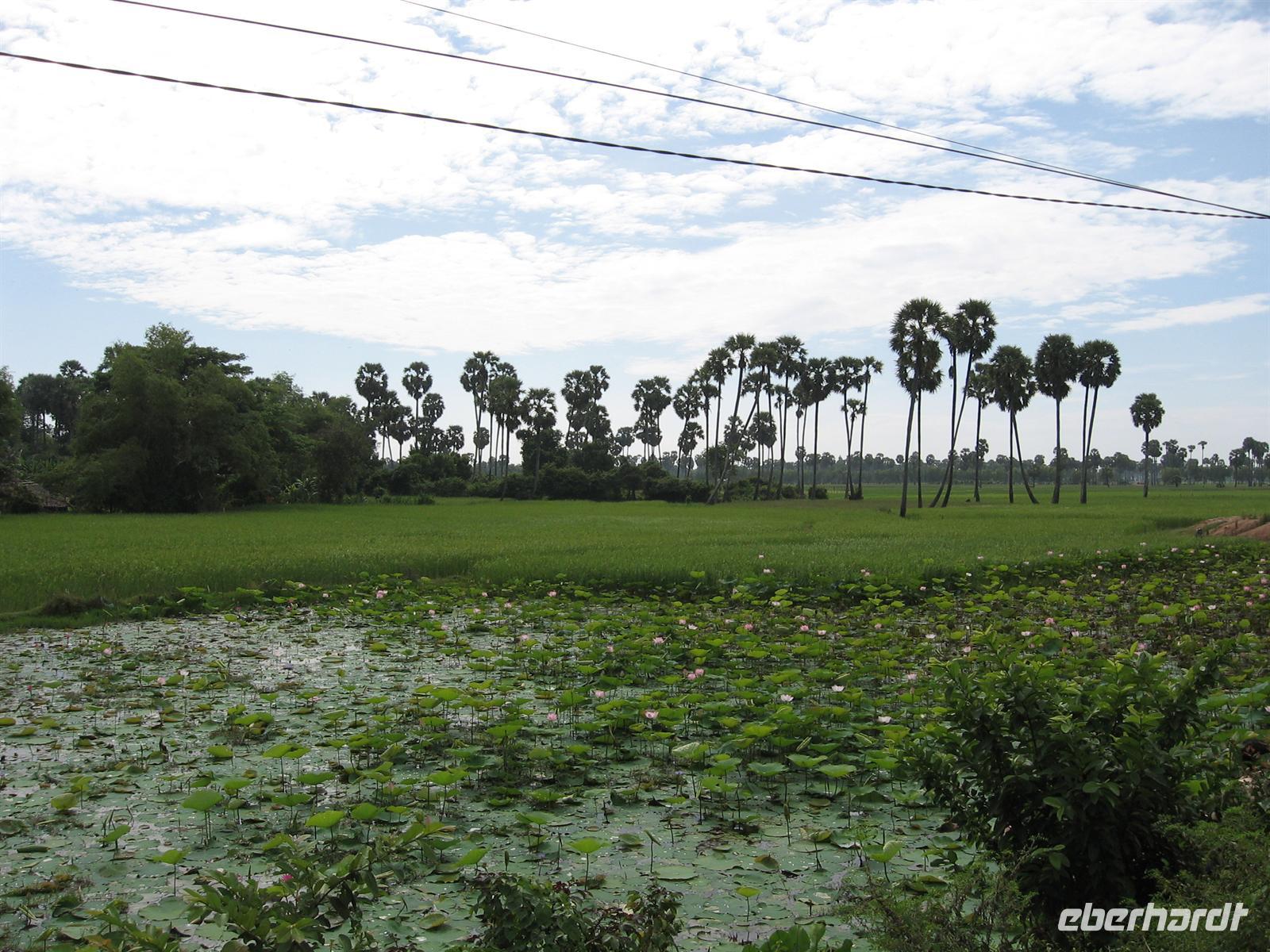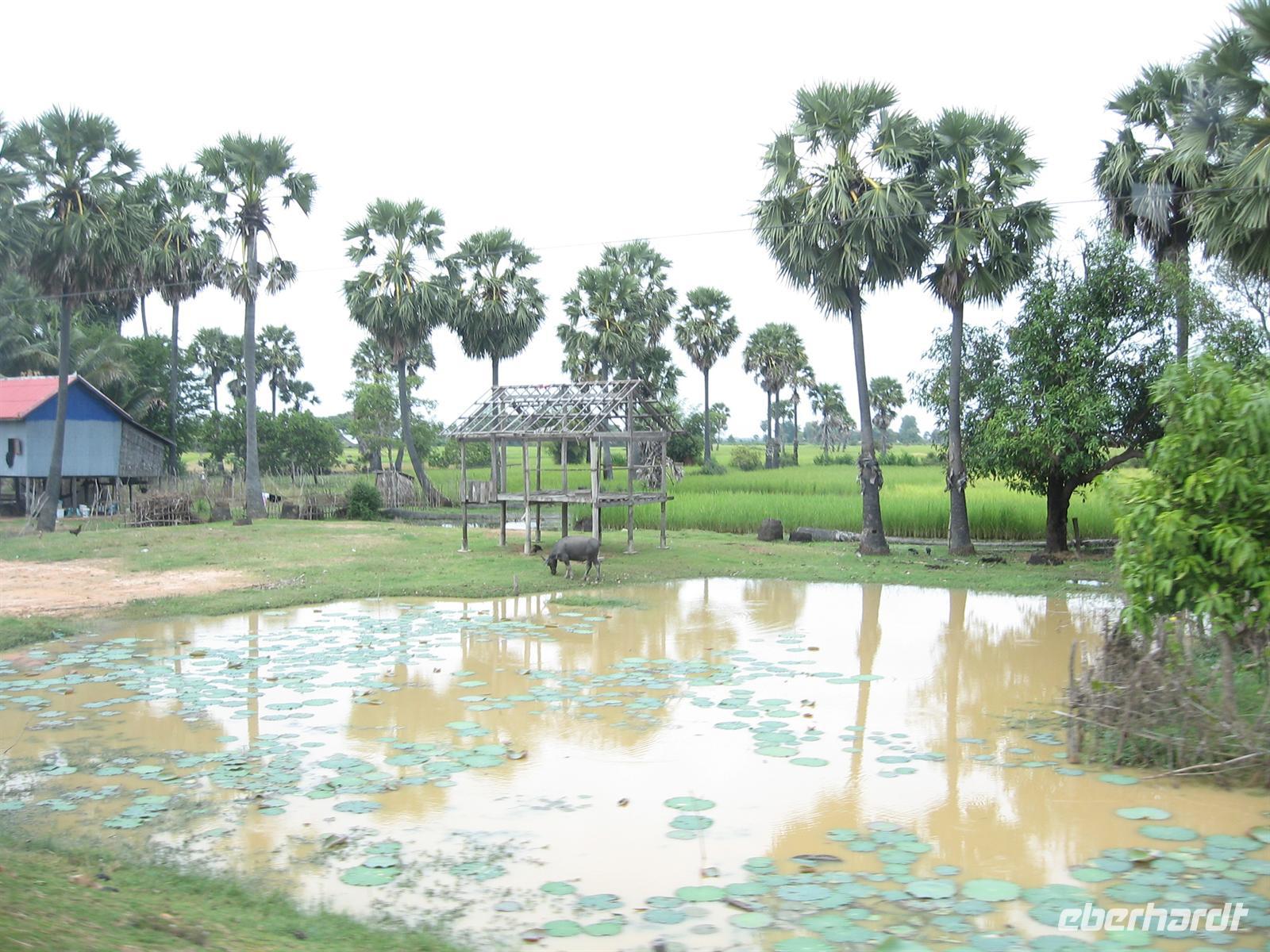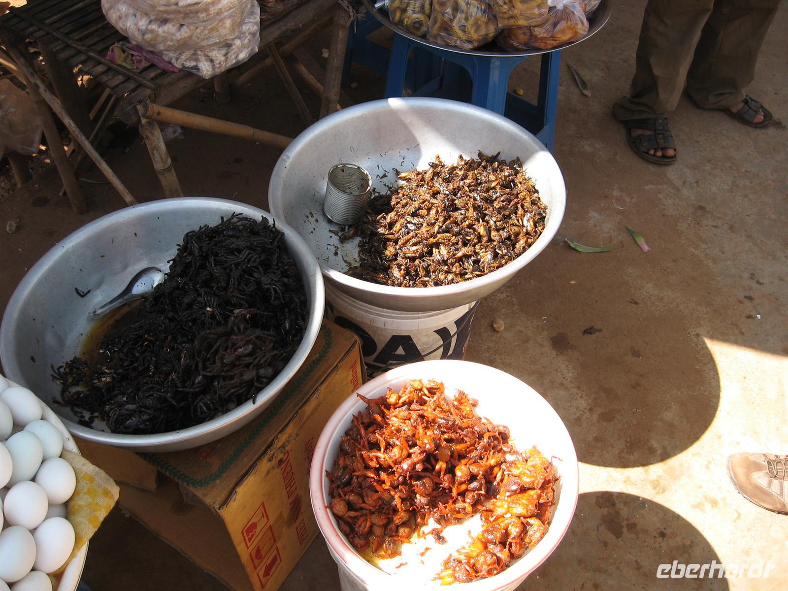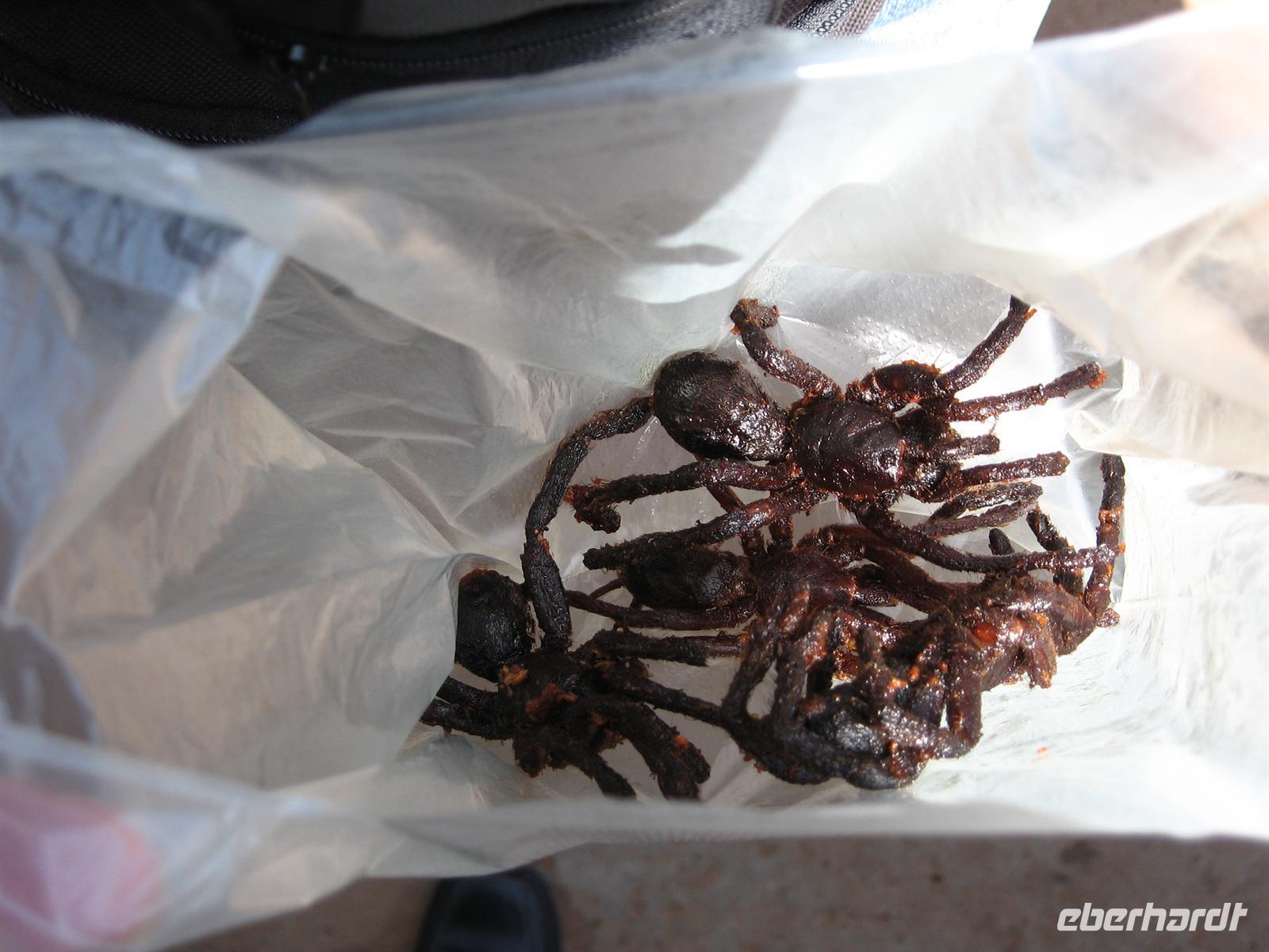 Nach dem Frühstück verlassen wir die Hauptstadt Kambodschas. Begrüßt werden wir heute von unseren Reiseleiter für die nächsten Tage, Thol. Er ist aus Siem Reap gekommen um uns abzuholen. Gemeinsam haben wir heute über 300 Kilometer zurück zu legen. Nachdem wir die Hauptstadt hinter uns gelassen haben geht die Fahrt zügig voran. Unterwegs wird die Straße von Reisfeldern und mit Lotusblüten übersäten Teichen geprägt. Wir halten natürlich auch an um einige Fotos zu machen. Nach gut zwei Stunden halten wir an einem Markt, dessen Spezialität gebratene Spinnen, Heuschrecken und Frösche sind. Ein ganz mutiger kauft sich für einen Dollar vier Spinnen. Die Verkostung bringt zu Tage, dass vor allem die Beine sehr gut und knusprig schmeckten. Auf der Fahrt erklärt uns Thol eine ganze Menge wissenswertes zum Land.