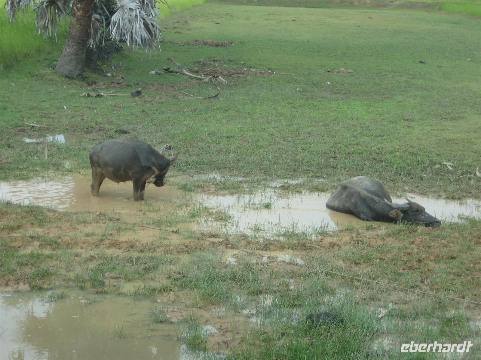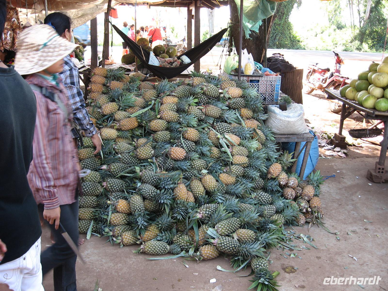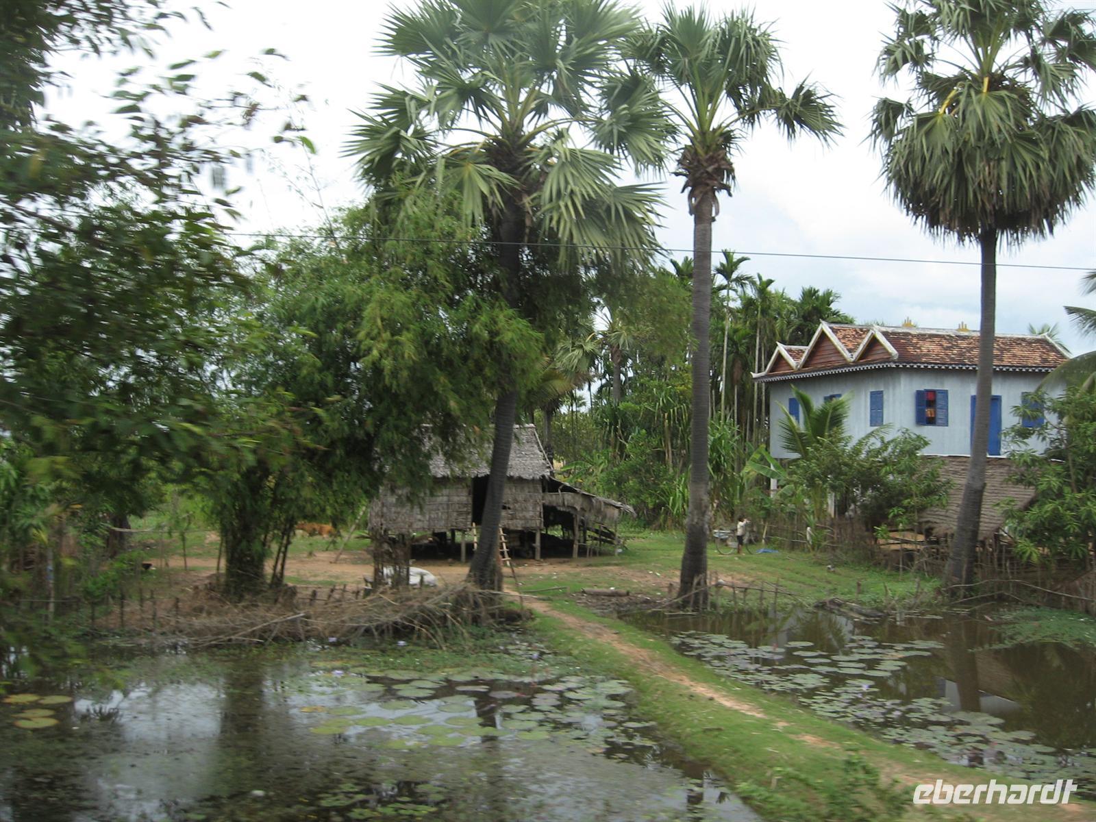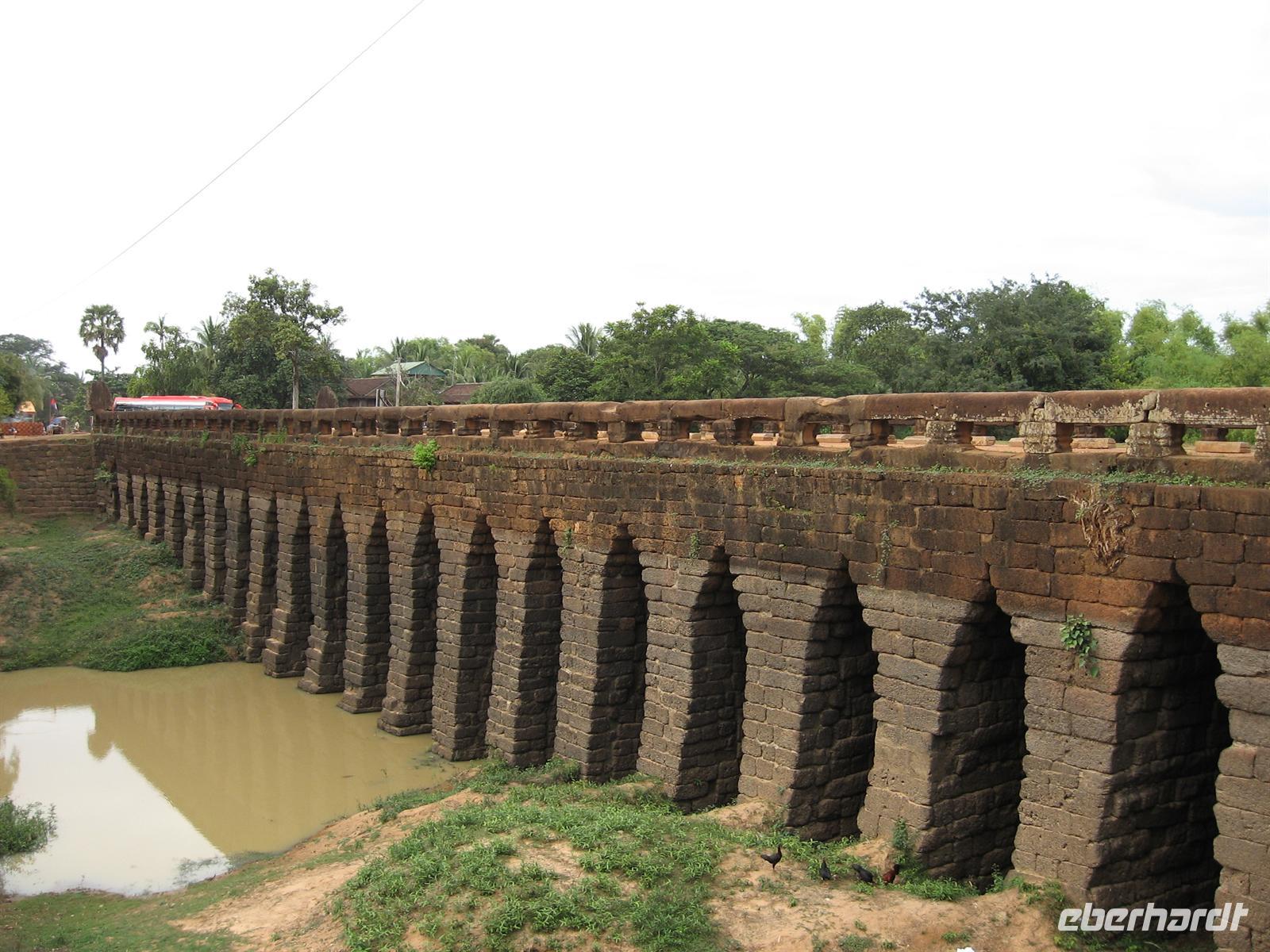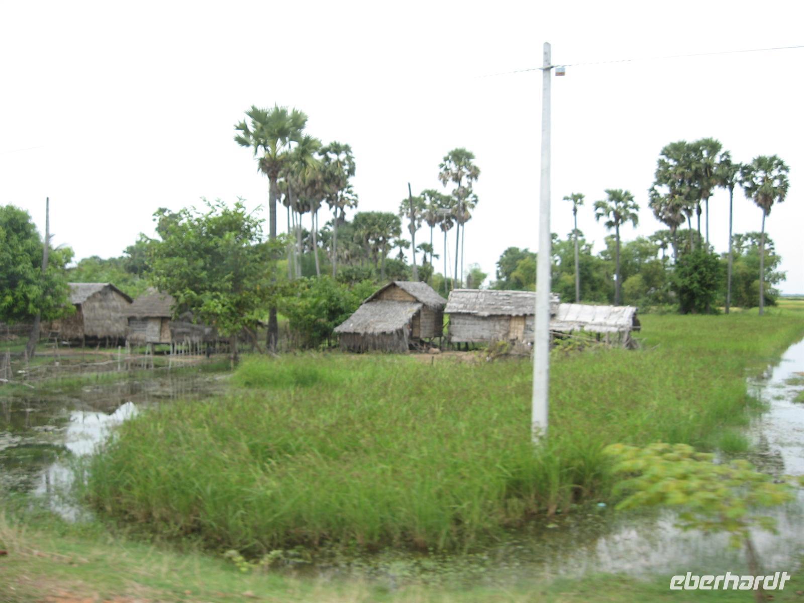Nach dem Frühstück verlassen wir die Hauptstadt Kambodschas. Begrüßt werden wir heute von unseren Reiseleiter für die nächsten Tage, Thol. Er ist aus Siem Reap gekommen um uns abzuholen. Gemeinsam haben wir heute über 300 Kilometer zurück zu legen. Nachdem wir die Hauptstadt hinter uns gelassen haben geht die Fahrt zügig voran. Unterwegs wird die Straße von Reisfeldern und mit Lotusblüten übersäten Teichen geprägt. Wir halten natürlich auch an um einige Fotos zu machen. Nach gut zwei Stunden halten wir an einem Markt, dessen Spezialität gebratene Spinnen, Heuschrecken und Frösche sind. Ein ganz mutiger kauft sich für einen Dollar vier Spinnen. Die Verkostung bringt zu Tage, dass vor allem die Beine sehr gut und knusprig schmeckten. Auf der Fahrt erklärt uns Thol eine ganze Menge wissenswertes zum Land.