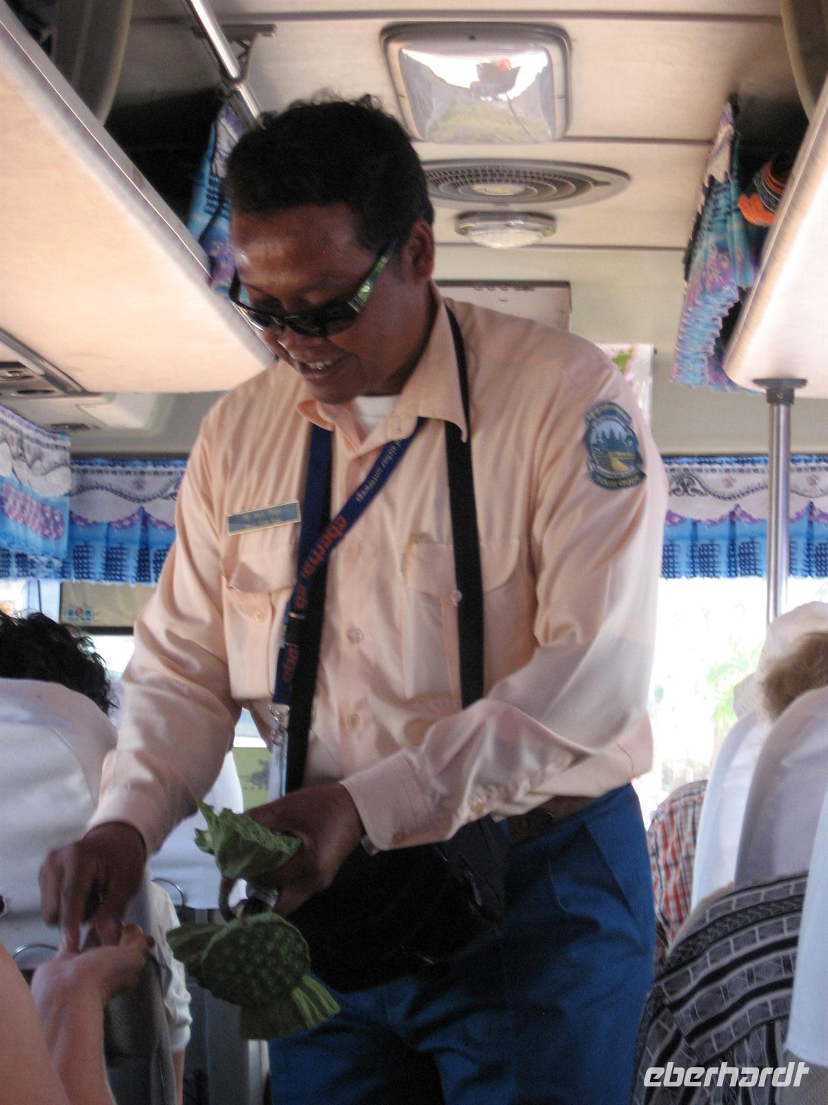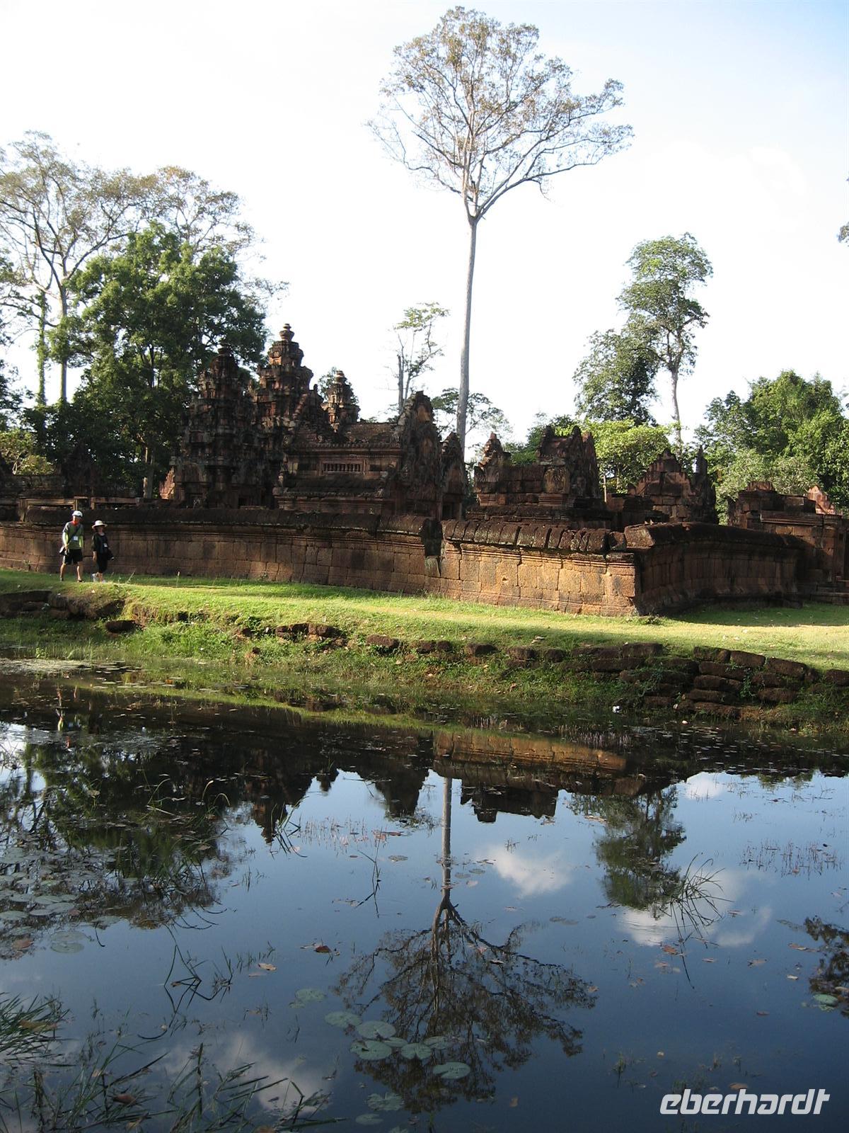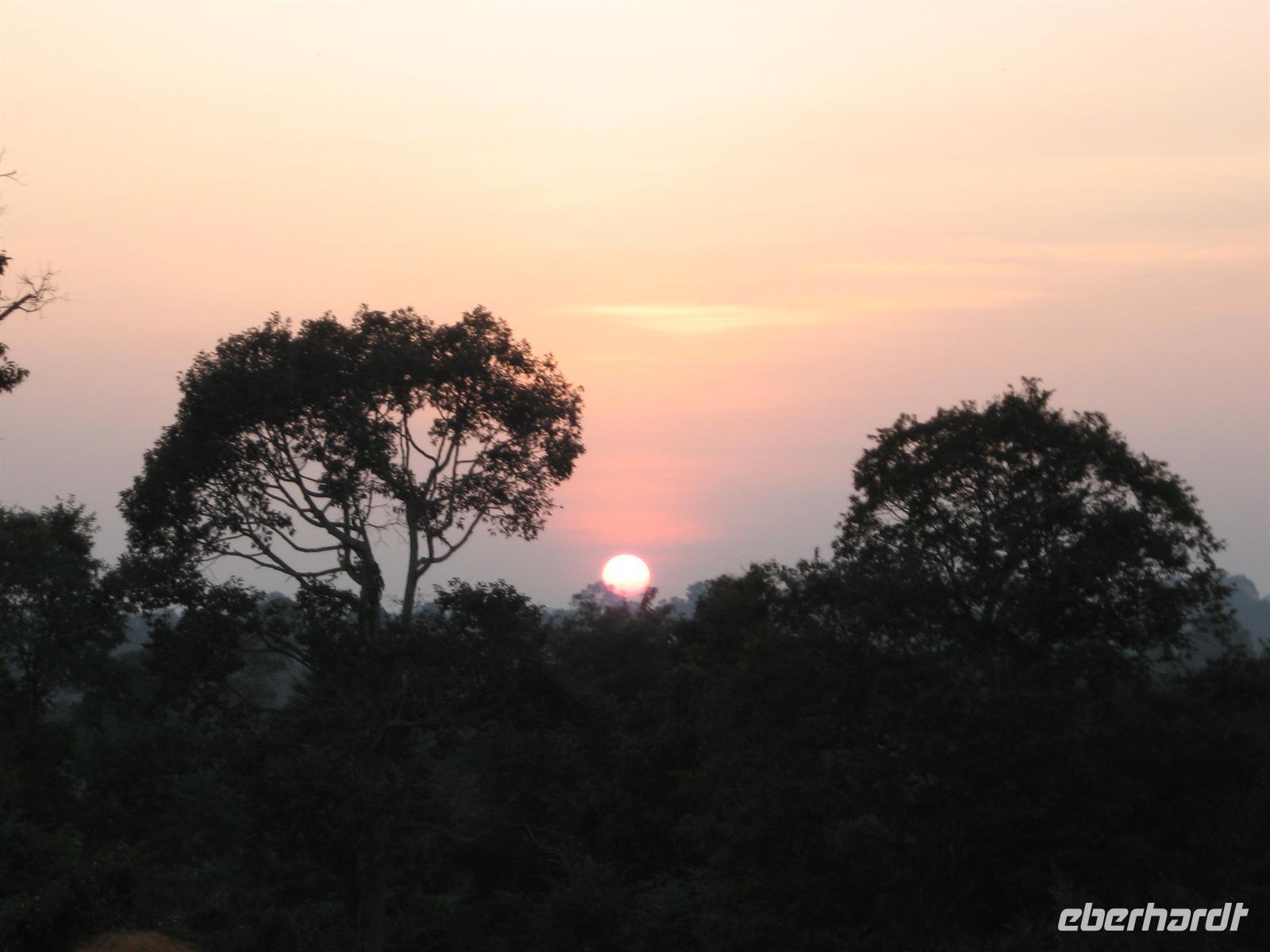 verdient, bevor wir zum letzten Tempel für heute aufbrechen. Gute 20 Kilometer müssen wir bis zum Tempel Banteay Srei oder auch Frauentempel fahren. Die Anlage stammt aus der Mitte des 10 Jh. und ist ein Juwel unter den Tempeln. Die Faszination stammt zweifellos vom Variantenreichtum seines Dekors. Die filigran gearbeiteten Ornamentverzierungen - meist Blumen und Rankenwerk - überziehen die wichtigsten Gebäudeteile. Unwahrscheinlich viele Details gibt es zu entdecken. Uns ist inzwischen ganz schön heiß, die Sonne scheint heute unbarmherzig auf uns herab. Da heißt es viel trinken und jeder von uns greift immer wieder gern zu neuen Wasserflasche bei einsteigen in den Bus. Unser Fahrer hat sich immer darum gekümmert, dass ausreichend kostbares Nass vorhanden ist. Auf der Fahrt zurück Richtung Siem Reap halten wir noch in einem Dorf und sehen uns an, wie man aus dem Saft der Zuckerpalme Palmenzucker herstellt. Eine durchaus mühsame Arbeit. Den Sonnenuntergang erleben wir am bzw. auf dem Tempel Pre Rup, einer ebenfalls aus dem 10. Jh. stammenden pyramidenförmigen Anlage. Die untergehende Sonne bringt die Ziegelsteine zum „glühen“ aber genauso gut kann man von oben den Untergang der Sonne genießen. Zurück zum Hotel heißt es duschen und anschließend fahren wir zum Essen. Allerdings sind wir heute sehr enttäuscht, das Restaurant wird eigentlich nur von asiatischen Reisenden besucht, ist ungemütlich und laut. Schade, das war unser letztes gemeinsames Abendessen und das ging nach hinten los.