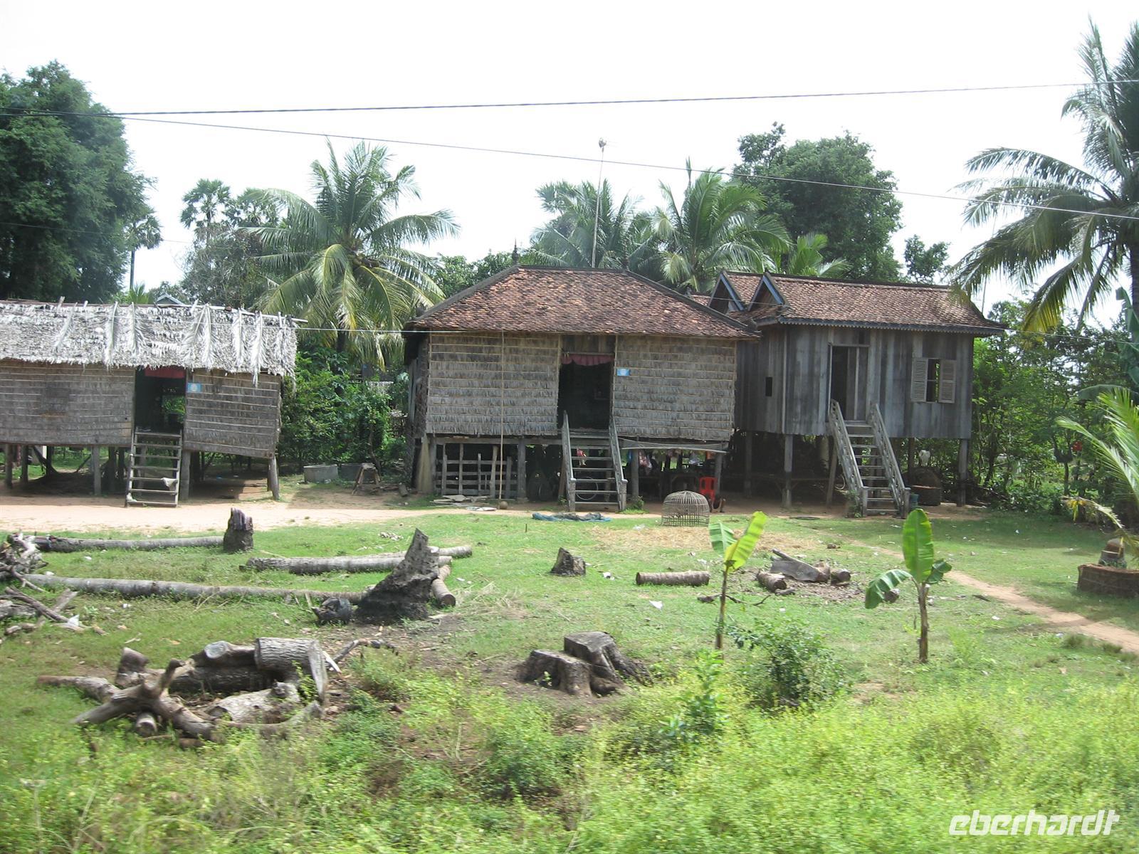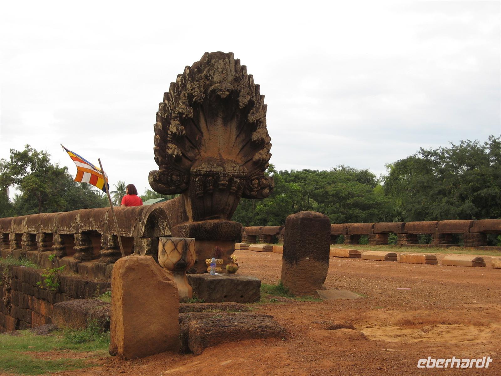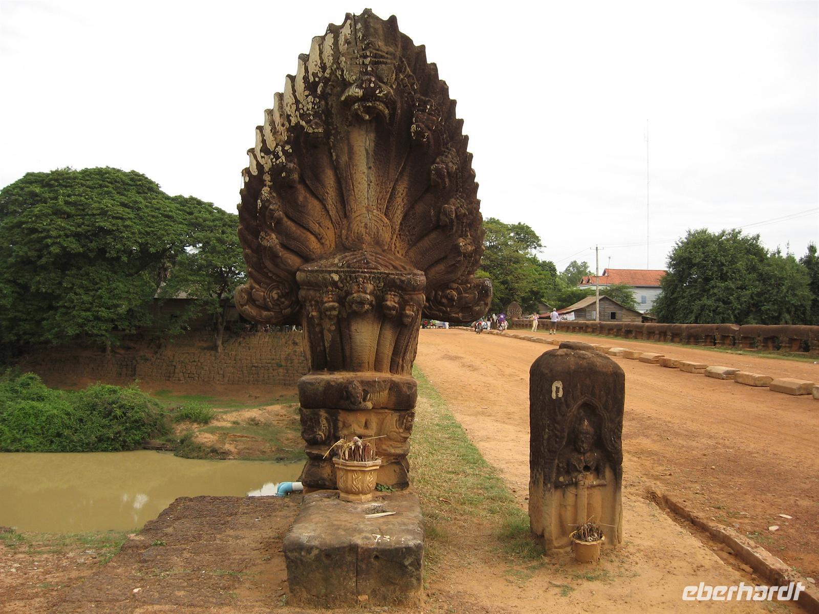 Zwei mal im Jahr wird Reis geerntet, der meiste Reis wird exportiert, Hauptabnehmer sind Vietnam und Europa, hier wiederum Deutschland. Für die Einheimischen kostet ein Kilogramm Reis je nach Qualität 800 bis 1300 Riel. 4000 Riel entsprechen einem US-Dollar. Wenig später halten wir in einem Dorf, wo noch alte Pfahlhäuser stehen. Die alten Häuser sind noch ohne einen Nagel gebaut, nur mit Holzsplinten. Diese traditionelle Architektur ist in Kambodscha weit verbreitet. Wegen Hochwasser, den hohen Temperaturen und Tieren wird auf Stelzen gebaut. In den Häusern gibt es meist nur einen Raum, manchmal ist ein extra Zimmer für die Mädchen da, aber meist wird der Raum nur durch Vorhänge getrennt. Zur Mittagspause sind wir mit vielen Einheimischen in einem Restaurant, heute ist Feiertag im ganzen Land, es ist Wasserfest. Auf den Flüssen im Land finden an diesen Tag Bootsrennen statt, das größte natürlich in der Hauptstadt. Etwa 50 Kilometer vor Siem Reap sehen wir uns noch eine sogenannte Naga-Brücke an. Die Enden der Brücke sind mit Naga-Köpfen verziert, sieben Stück, denn eine ungerade Zahl bringt Glück. Nach unserer Ankunft in Siem Reap beziehen wir unser Hotel. Vor dem Abendessen machen wir noch einen Bummel durch die beleuchteten Straßen des Zentrums und dem Nachtmarkt. Zur Begrüßung gab es für uns sogar ein Feuerwerk. Zahlreiche Köstlichkeiten der Khmer-Küche konnten wir zum Abendessen in einem Buffet-Restaurant probieren.