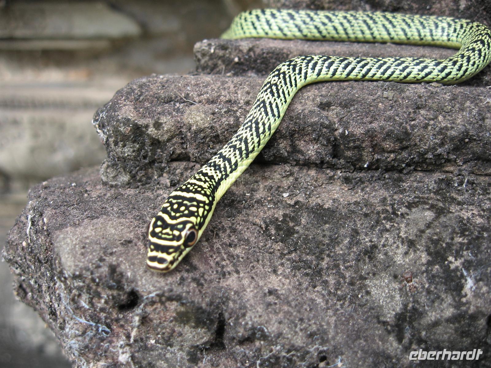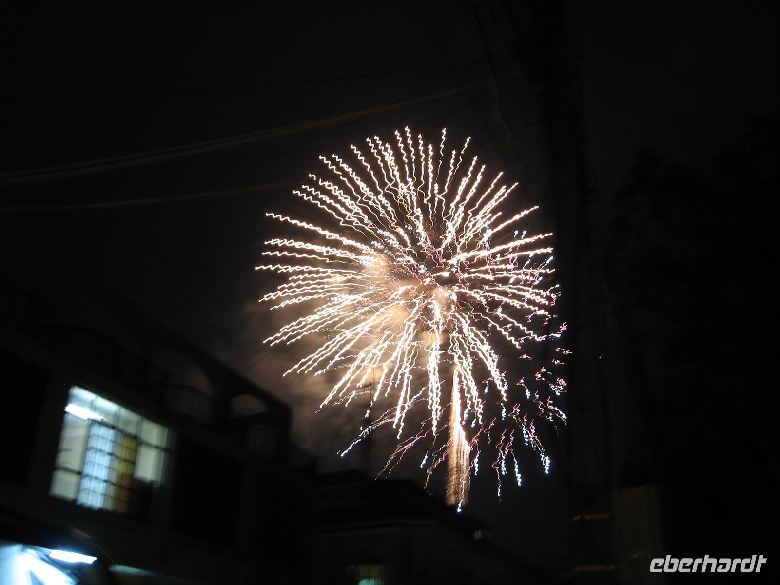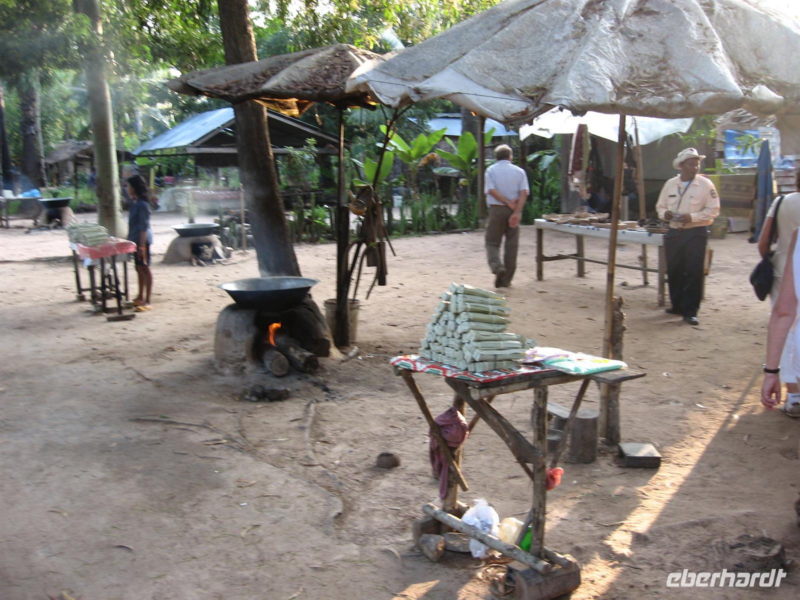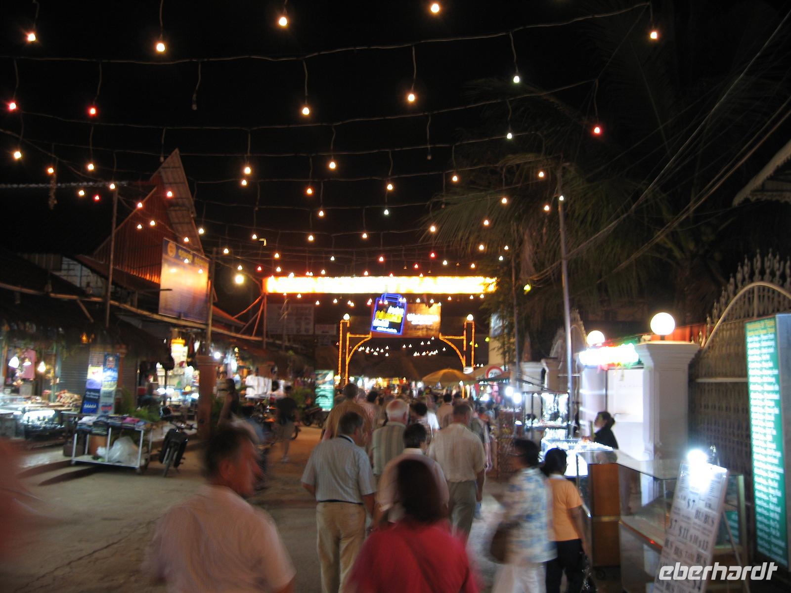 Zwei mal im Jahr wird Reis geerntet, der meiste Reis wird exportiert, Hauptabnehmer sind Vietnam und Europa, hier wiederum Deutschland. Für die Einheimischen kostet ein Kilogramm Reis je nach Qualität 800 bis 1300 Riel. 4000 Riel entsprechen einem US-Dollar. Wenig später halten wir in einem Dorf, wo noch alte Pfahlhäuser stehen. Die alten Häuser sind noch ohne einen Nagel gebaut, nur mit Holzsplinten. Diese traditionelle Architektur ist in Kambodscha weit verbreitet. Wegen Hochwasser, den hohen Temperaturen und Tieren wird auf Stelzen gebaut. In den Häusern gibt es meist nur einen Raum, manchmal ist ein extra Zimmer für die Mädchen da, aber meist wird der Raum nur durch Vorhänge getrennt. Zur Mittagspause sind wir mit vielen Einheimischen in einem Restaurant, heute ist Feiertag im ganzen Land, es ist Wasserfest. Auf den Flüssen im Land finden an diesen Tag Bootsrennen statt, das größte natürlich in der Hauptstadt. Etwa 50 Kilometer vor Siem Reap sehen wir uns noch eine sogenannte Naga-Brücke an. Die Enden der Brücke sind mit Naga-Köpfen verziert, sieben Stück, denn eine ungerade Zahl bringt Glück. Nach unserer Ankunft in Siem Reap beziehen wir unser Hotel. Vor dem Abendessen machen wir noch einen Bummel durch die beleuchteten Straßen des Zentrums und dem Nachtmarkt. Zur Begrüßung gab es für uns sogar ein Feuerwerk. Zahlreiche Köstlichkeiten der Khmer-Küche konnten wir zum Abendessen in einem Buffet-Restaurant probieren.