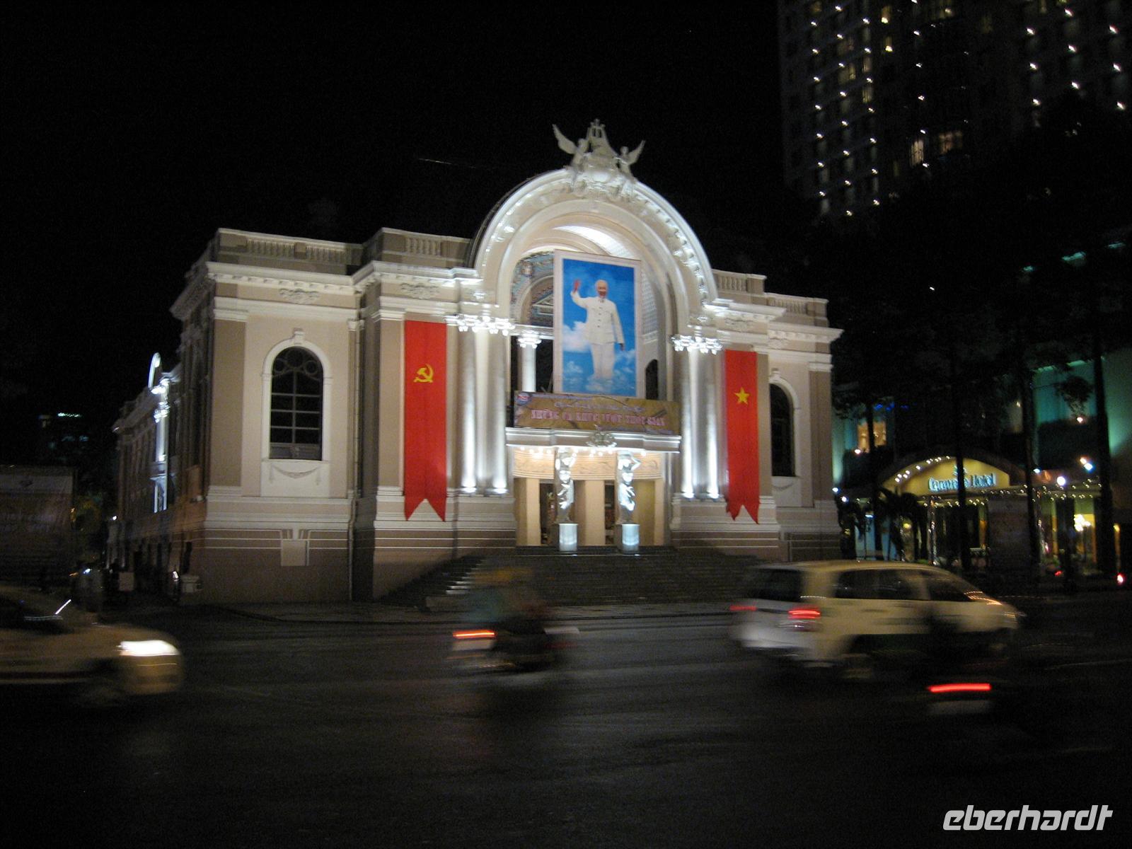 Entlang der Straße fahren wir durch unzählige Kaffeeplantagen und vor fast jedem Haus liegt Kaffee zum trocknen. Pro Kaffeestrauch werden etwa 4 kg Bohnen geerntet, nach der Trocknung bleibt die Hälfte davon übrig. Die Sträucher blühen von Februar bis Mai, ihre Blüte riecht fast wie Jasmin. Geerntet wird etwa von November bis Januar, eine Ernte ist pro Jahr möglich. Die angebauten Sorten sind Arabica und Robusta. In Bao Loc gibt es die Möglichkeit noch mal Kaffee und Tee zu verkosten. Dazu werden leckere Süßigkeiten gereicht. Unter anderem kosten wir Artischokentee, welcher gut für Leber, Niere und den gesamten Verdauungsapparat ist. Nach der Verkostung gehen die Pakete nur so über den Ladentisch. Die Temperatur wird jetzt, je weiter wir nach Süden kommen immer höher, zu Mittag haben wir mit Sicherheit schon fast 30 Grad. Zum Mittagessen verkosten wir noch einen ganz besonderen Schnaps, angesetzt mit Seepferdchen. Eigentlich sollten wir das nicht unterstützen, da diese possierlichen Meeresbewohner auch vom aussterben bedroht sind, aber die Neugierde ist größer. Und wie hat es nun geschmeckt? Na ja, geht so, ist die eindeutige Antwort. Dann sehen wir uns auch noch einen Cashew-Baum und eine Stinkfruchtbaum an, beide jedoch zur Zeit ohne Früchte. Langsam kommt Ho Chi Minh City näher, wir machen noch mal eine Pause und kosten Zuckerrohrstücke, Guaven und noch eine süße Leckerei aus Manjok. Im Bus gibt es dann noch eine Runde Reisschnaps, welchen unser Reiseleiter Ot ausgibt. Gegen 18 Uhr kommen wir an unserem Hotel „Asian Ruby 2“ an, nur eine Straße von der Oper entfernt, also mitten im Zentrum. Das Abendessen nehmen wir außer Haus ein, es schmeckt wieder ausgezeichnet.