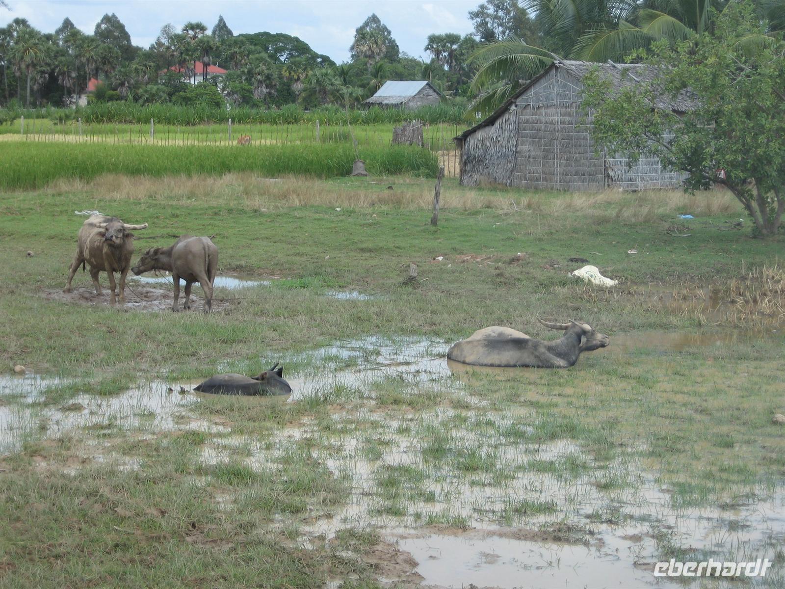 Am zeitigen Morgen fahren einige unserer Gäste zum Eleantenreiten. Mit einem Tuk Tuk werden Sie zum Südtor von Angkor Thom gebracht und auf dem Elefanten geht es dann weiter bis zum Bayon Tempel. Um 9 Uhr treffen wir uns dann alle wieder am Hotel und machen noch einen Ausflug zum Tonle Sap See. Auf dem Weg dahin laufen wir noch durch ein Dorf und haben die Gelegenheit durch ein buddhistisches Kloster zu gehen. Wir können auch für einige Minuten den Vorbereitungen für eine Einäscherung beiwohnen. Im Kloster werden alle Konfessionen eingeäschert, egal ob Christ, Buddhist oder Hindi. Mit einem Boot fahren wir dann auf dem Tonle Sap bis zum schwimmenden Dorf. Auch hier spielt sich das gesamte Leben auf dem Wasser ab. Der Tonle Sap See fungiert als Wassersammelbecken für den Mekong, in der Regenzeit fließt das Wasser aus dem Mekong in den Tonle Sap und seine Fläche dehnt sich auf 10000 km² aus. In der Trockenzeit lehrt sich der See wieder und verkleinert seine Oberfläche auf 2500 km². Entsprechend