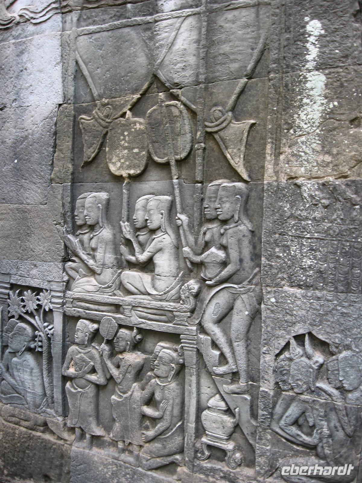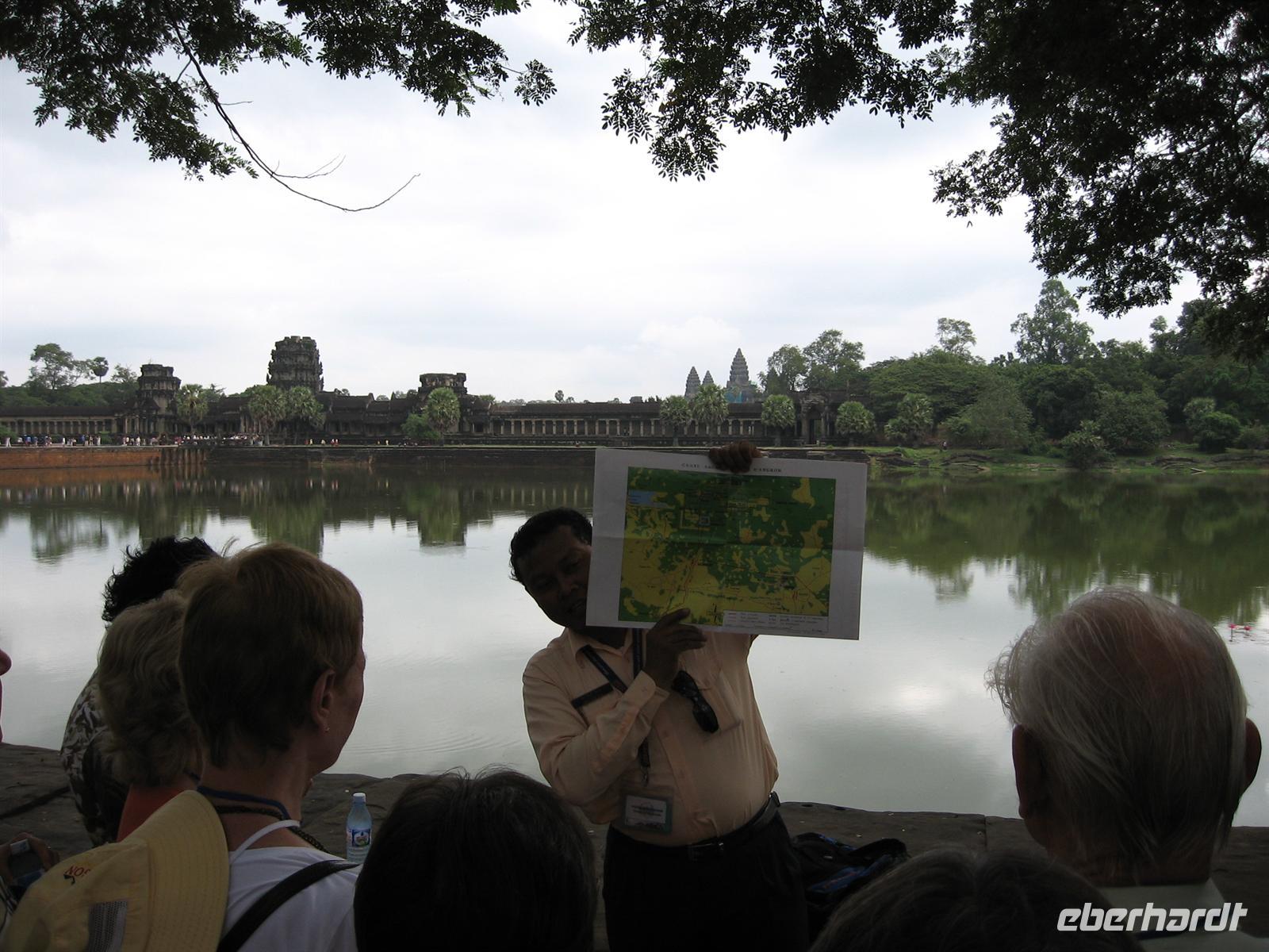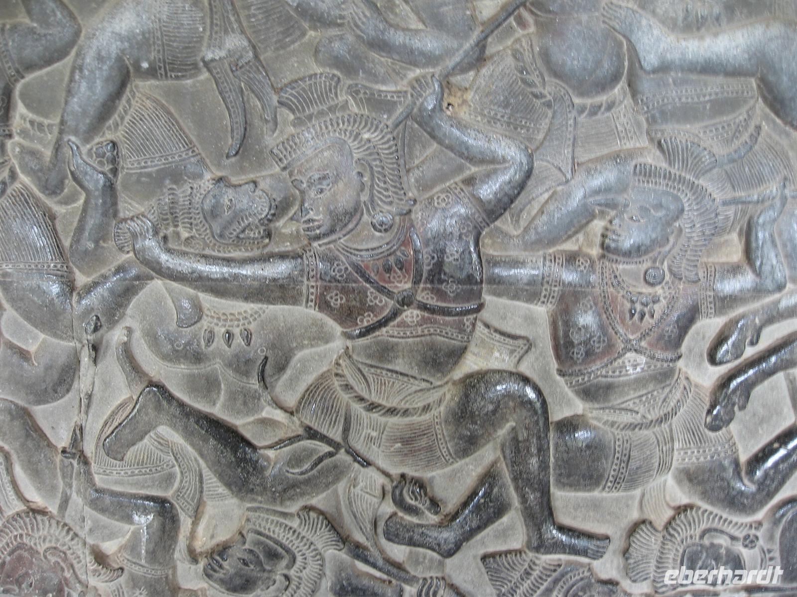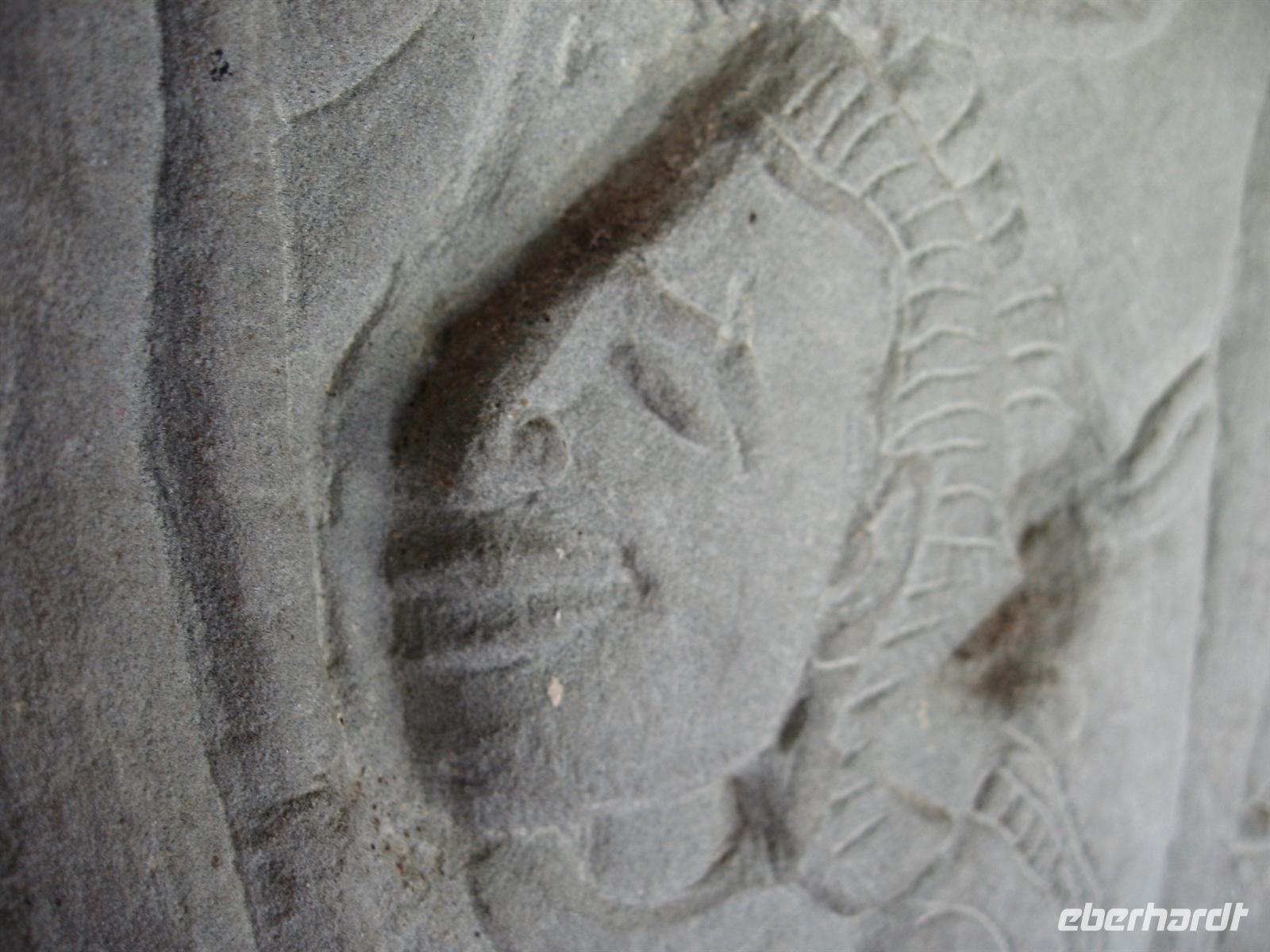Ab heute steht mit Sicherheit einer der Höhepunkte auf dem Programm, die Besichtigung der Tempelanlagen von Angkor. Angkor bedeutet soviel wie Königsstadt oder Hauptstadt. Die meisten Besucher denken dabei vor allem an die beiden berühmten Tempel von Angkor Wat und Angkor Thom. Aber es gibt noch viele Tempel mehr, die in einem Zeitraum von mehr als 600 Jahren entstanden sind. Höhepunkt der Bauepoche waren dabei sicher die beiden schon genannten Anlagen. Wir besichtigen zuerst das unter König Suryavarmann II. erbaute Angkor Wat. Es ist ein beeindruckender Anblick schon zu Beginn des Rundgangs. Unser Reiseleiter Thol macht uns auf verschiedenen Details aufmerksam, erklärt die verschiedenen Reliefarten. Mit Hilfe einer Lotusblume erklärt er zum besseren verstehen, das architektonische Prinzip der Turmbauten und auch die immer wiederkehrenden Motive in den Wandverzierungen. Es gibt fast keinen Stein der nicht mit Verzierungen versehen ist. Immer wiederkehrendes Motiv sind auch Apsara-Tänzerinnen. Vorbei an den Bibliotheken gehen wir zur Nordost-Seite des Tempels. Von hier hat man einen Blick auf alle fünf Türme. Der mittlere und zugleich höchste Turm im Zentralheiligtum stellt den Berg Meru, den Berg der Götter, dar. Wir befinden uns jetzt in der ersten Galerie und das kann man ganz wörtlich nehmen. Hier befinden sich verschiedene, bis zu 100 m lange Reliefs mit Darstellungen aus dem Hinduismus. Der Erbauer war Anhänger dieser Religion, später wandte er sich dann zum Buddhismus. Daher hat Angkor - Königsstadt - noch einen Beinahmen bekommen. Mit Wat bezeichnen die Khmer einen buddhistischen Tempel. Die Reliefs zeigen Geschichten wie den Zweikampf zwischen Vishnu und den Dämonen Kalanemi oder Himmel und Hölle mit dem Totenrichter Yama und zahlreiche andere. Es ist faszinierend mit welchem Detailreichtum alle Reliefs ausgestattet sind. Man sieht zahlreiche Krieger, Elefanten, Götter und Dämonen und alles ist so gestaltet,