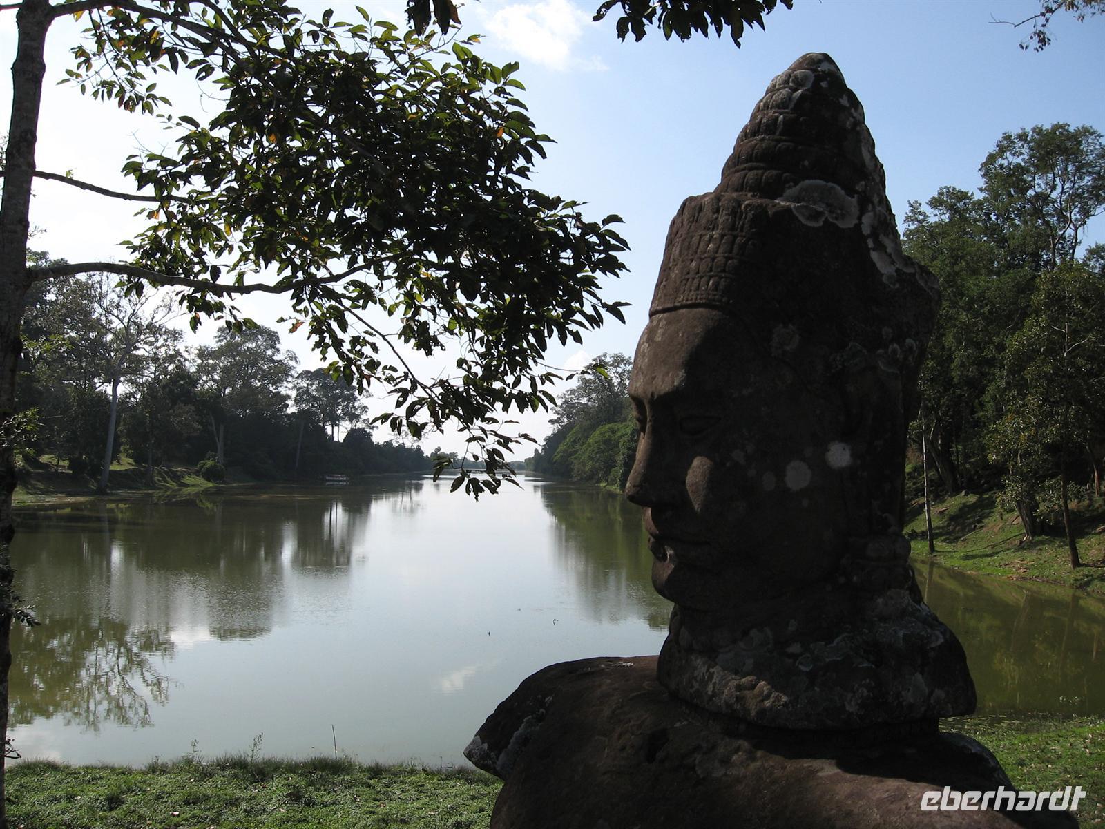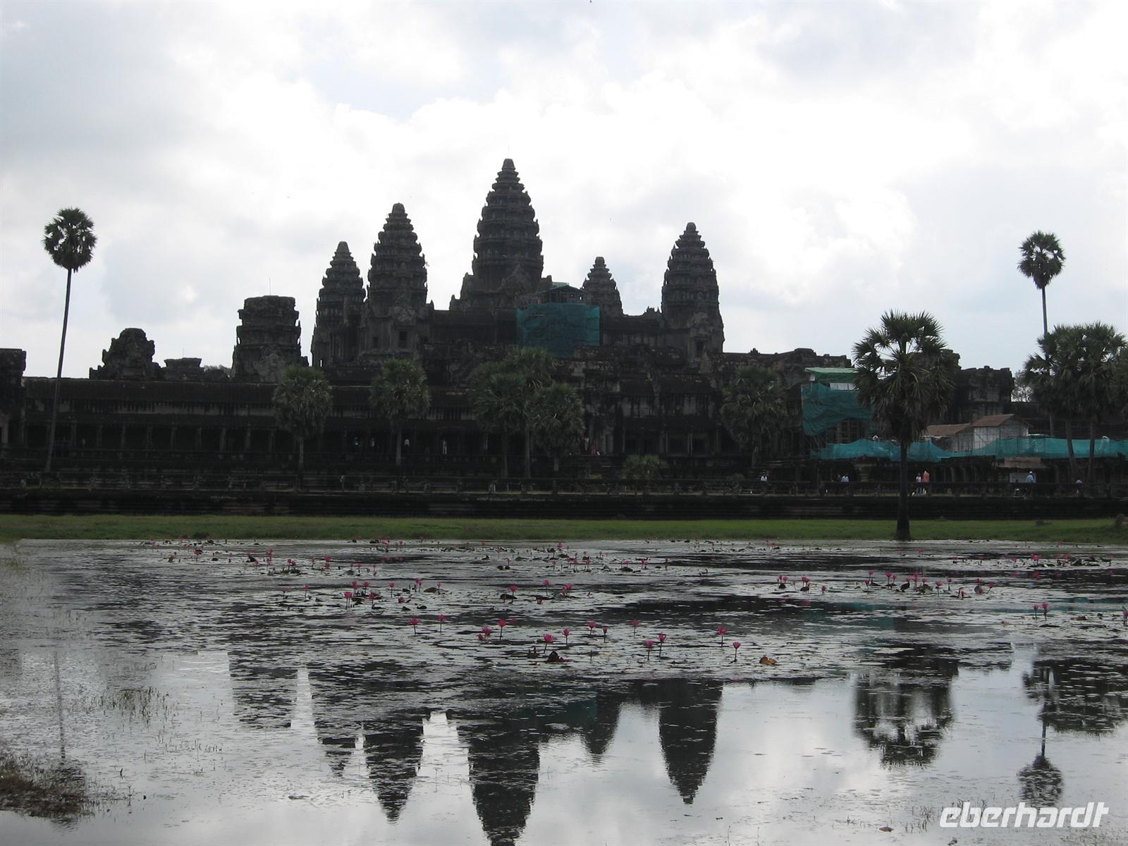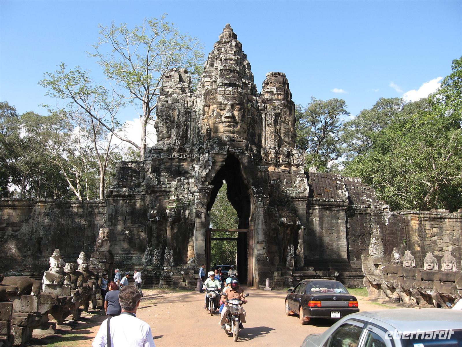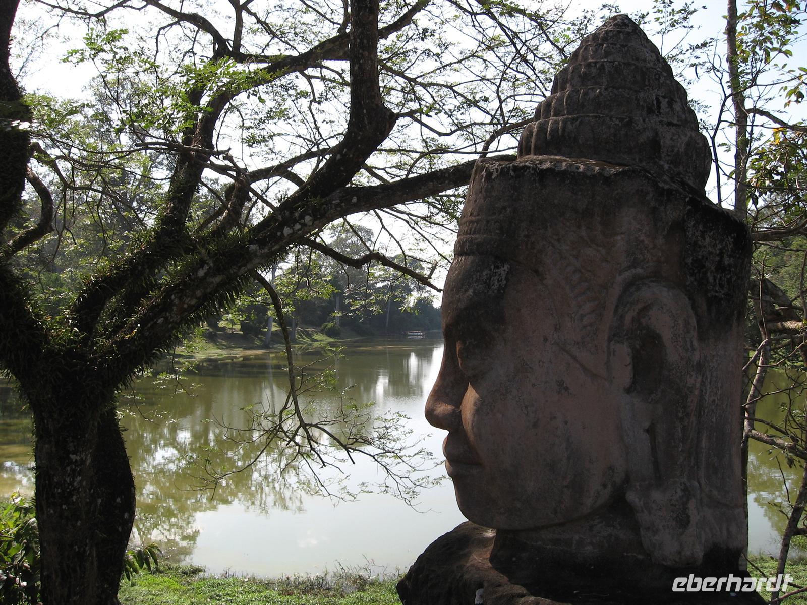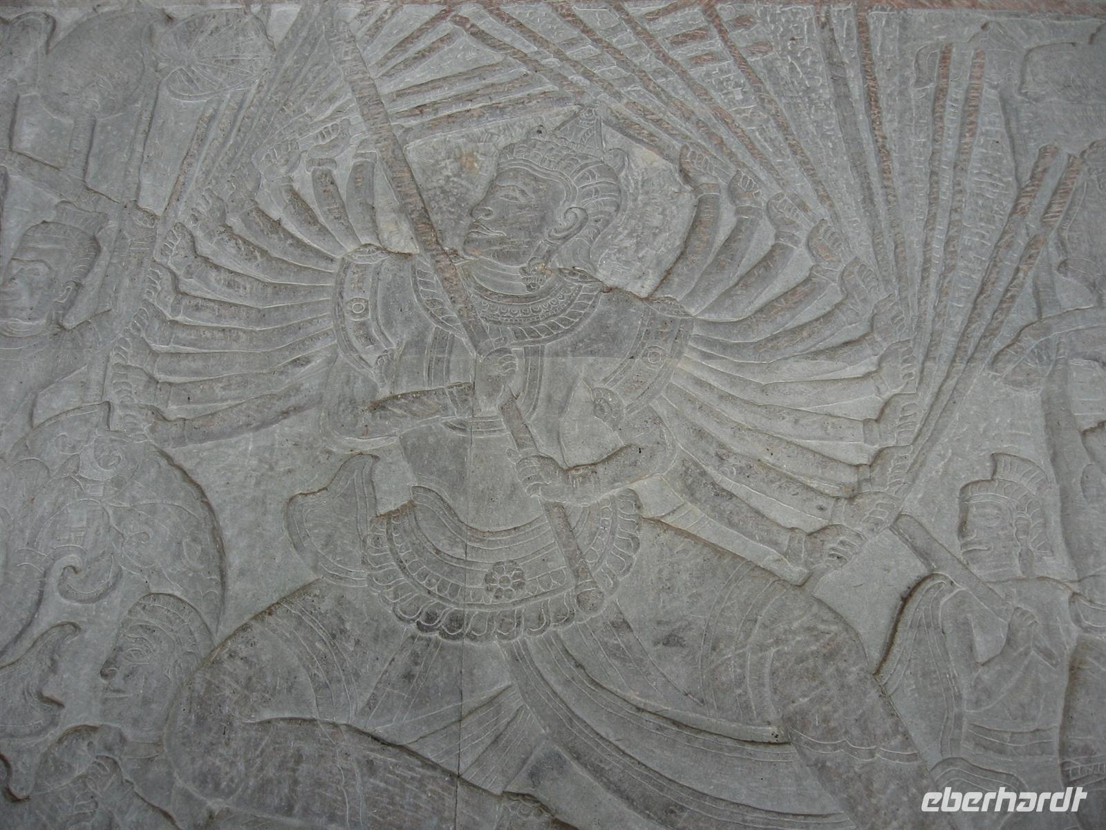 Ab heute steht mit Sicherheit einer der Höhepunkte auf dem Programm, die Besichtigung der Tempelanlagen von Angkor. Angkor bedeutet soviel wie Königsstadt oder Hauptstadt. Die meisten Besucher denken dabei vor allem an die beiden berühmten Tempel von Angkor Wat und Angkor Thom. Aber es gibt noch viele Tempel mehr, die in einem Zeitraum von mehr als 600 Jahren entstanden sind. Höhepunkt der Bauepoche waren dabei sicher die beiden schon genannten Anlagen. Wir besichtigen zuerst das unter König Suryavarmann II. erbaute Angkor Wat. Es ist ein beeindruckender Anblick schon zu Beginn des Rundgangs. Unser Reiseleiter Thol macht uns auf verschiedenen Details aufmerksam, erklärt die verschiedenen Reliefarten. Mit Hilfe einer Lotusblume erklärt er zum besseren verstehen, das architektonische Prinzip der Turmbauten und auch die immer wiederkehrenden Motive in den Wandverzierungen. Es gibt fast keinen Stein der nicht mit Verzierungen versehen ist. Immer wiederkehrendes Motiv sind auch Apsara-Tänzerinnen. Vorbei an den Bibliotheken gehen wir zur Nordost-Seite des Tempels. Von hier hat man einen Blick auf alle fünf Türme. Der mittlere und zugleich höchste Turm im Zentralheiligtum stellt den Berg Meru, den Berg der Götter, dar. Wir befinden uns jetzt in der ersten Galerie und das kann man ganz wörtlich nehmen. Hier befinden sich verschiedene, bis zu 100 m lange Reliefs mit Darstellungen aus dem Hinduismus. Der Erbauer war Anhänger dieser Religion, später wandte er sich dann zum Buddhismus. Daher hat Angkor - Königsstadt - noch einen Beinahmen bekommen. Mit Wat bezeichnen die Khmer einen buddhistischen Tempel. Die Reliefs zeigen Geschichten wie den Zweikampf zwischen Vishnu und den Dämonen Kalanemi oder Himmel und Hölle mit dem Totenrichter Yama und zahlreiche andere. Es ist faszinierend mit welchem Detailreichtum alle Reliefs ausgestattet sind. Man sieht zahlreiche Krieger, Elefanten, Götter und Dämonen und alles ist so gestaltet,