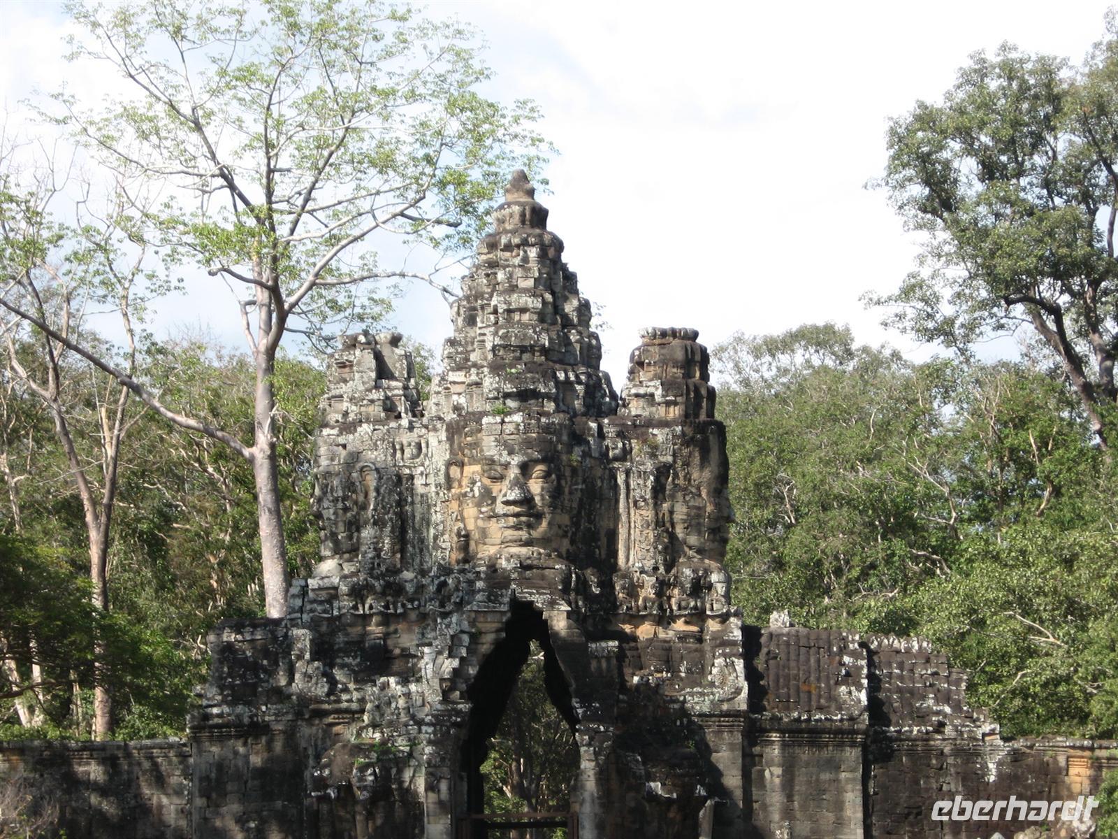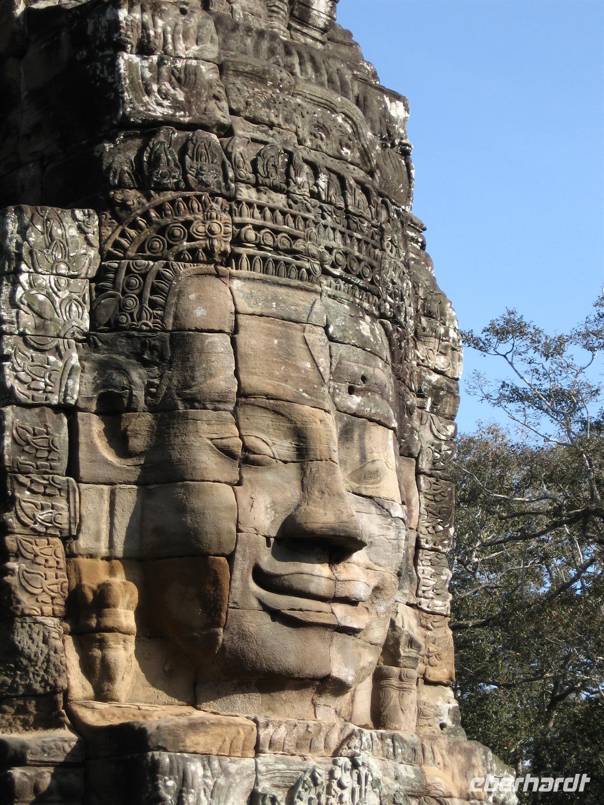 Am Nachmittag besuchen wir Angkor Thom, was Große Stadt bedeutet. Jayarvaman VII. begann Ende des 12. Jh. mit dem Bau dieser Stadt, nachdem er in Kriegen gegen die Cham seine Macht gefestigt hatte. Über einen Damm gehen wir auf das Südtor zu, welches mit seinen Gesichtern sehr imposant ist. Nach dem Tor steigen wir in einen kleineren Bus und fahren ein Stück bis zum Bayon Tempel, einem mysteriösen und zugleich faszinierenden Ort. Schon von weiten ist dieser Tempel faszinieren mit seinen Gesichtertürme etwas ganz besonderes. Ich persönlich habe eine große Ehrfurcht vor diesem Bauwerk und den Gedanken der Erbauer. Ursprünglich handelte es sich um ein Buddhistisches Heiligtum. Erst später wandte sich der König dem Hinduismus zu. Die vier Gesichter pro Turm stellten die beschützende Macht des Bodhisattva Lokeshvara Samantamukha (Herr der Welt) dar, der in alle vier Himmelsrichtungen des Reiches blickt. Auch hier finden sich wieder reichlich verzierte Galerien, nach dem Aufstieg zur oberen Terrasse laufen wir direkt an den Gesichtern vorbei. Vom Bayon gehen wir dann weiter zur Elefantenterrasse, die ihren Namen durch die Reliefdarstellung von Elefanten bekommen hat. Sie hat eine Länge von 300 Metern, hier nahm der Herrscher früher Paraden ab. Anschließend gelangen wir zur Terrasse des Leprakönigs. Das Wort Lepra hat hier allerdings nicht mit der Krankheit zu tun sondern bedeutet, dass der Herrscher dieses Bauwerk nicht vollenden könnte. Wenn der König vor Fertigstellung verstarb wurde nicht weiter gebaut, der neue Herrscher baute für sich einen neuen Tempel. Wir haben heute viel gesehen und die Eindrücke müssen erst noch einmal sortiert werden. Nach einer Pause im Hotel fahren wir zum Abendessen. Das Restaurant bietet zum Abendessen eine Tanzshow mit Apsara-Tänzerinnen. Ihre Gelenkigkeit in den Fingern und die dazu erforderliche Körperbeherrschung ist einmalig. Zum Ende der Vorführung stellten sich alle Tänzerinnen auf der Bühne auf und plötzlich strömten zahlreiche Menschen auf die Bühne um sich mit den Tänzerinnen fotografieren zu lassen. Uns taten sie Leid.