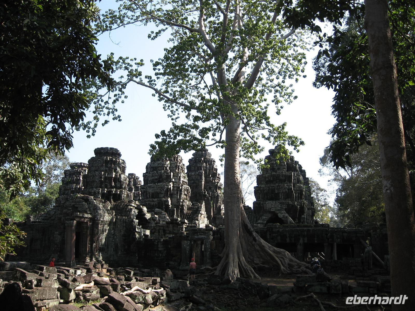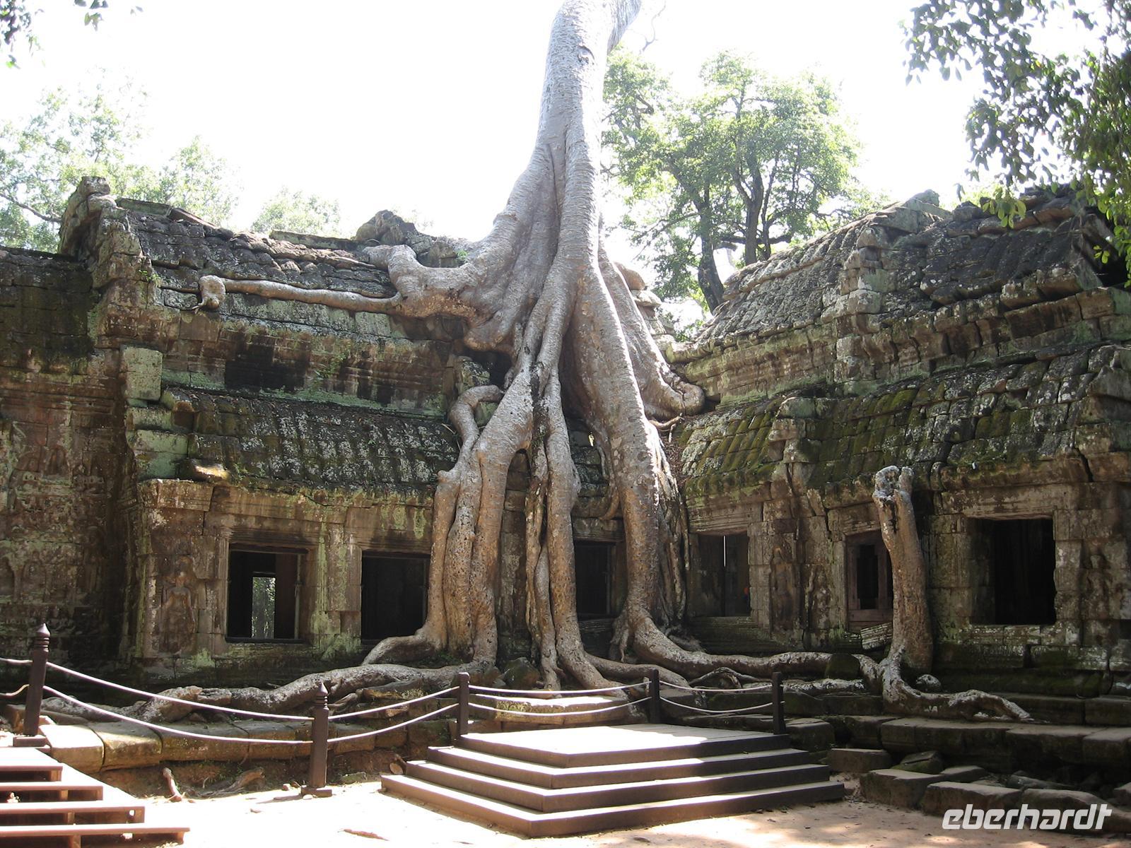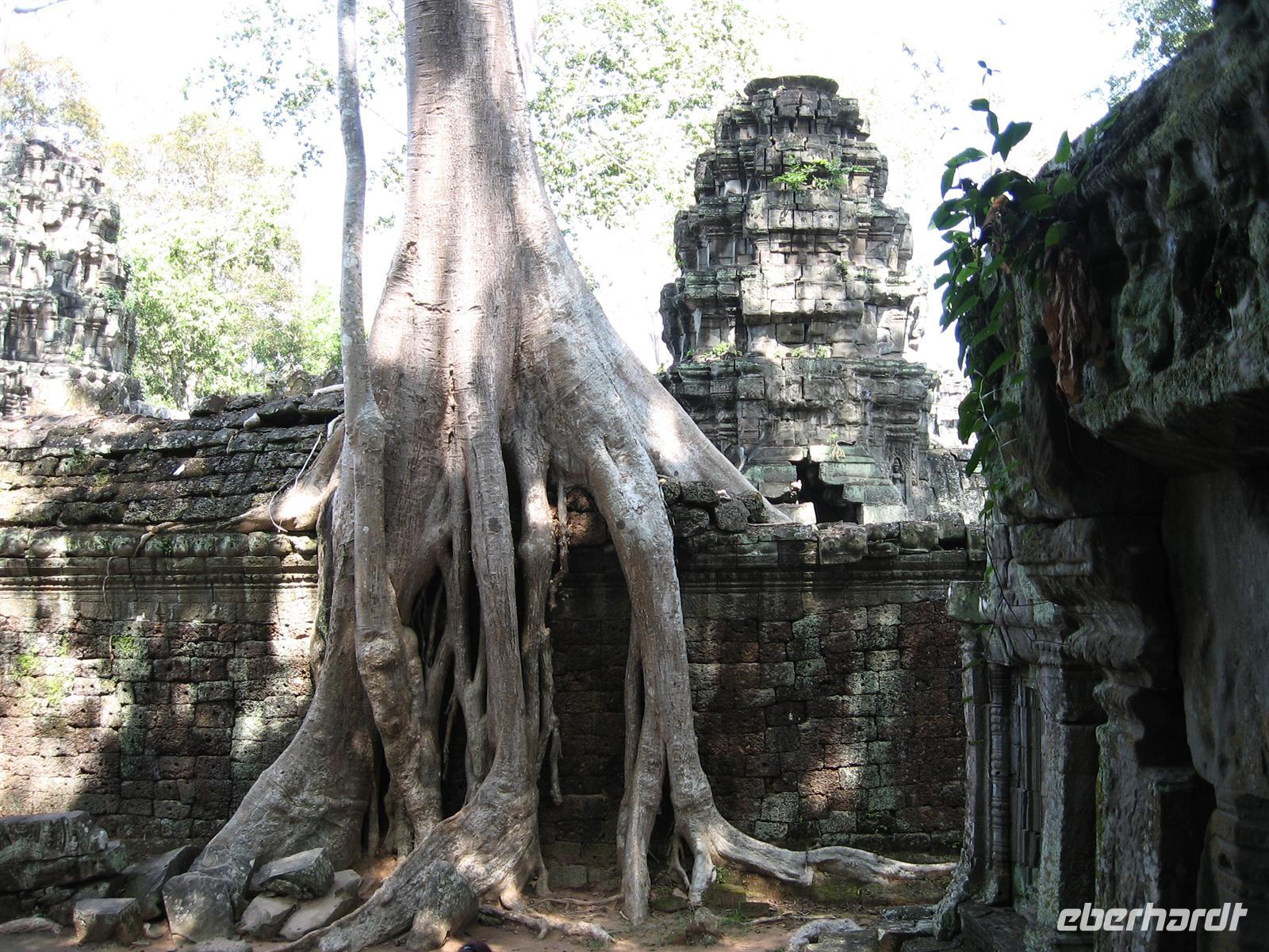 Vier weitere, in ihrer Art unterschiedliche, Tempelanlagen besuchen wir heute. Erster Stopp ist am Tempel „Prasat Kravan“. Die noch vorhandenen Türme sind nicht, wie sonst aus Sandstein, sondern aus Ziegelsteinen errichtet. Auf den ersten Blick erscheinen sie eher unspektakulär. Von Bedeutung sind die gut erhaltenen Backsteinreliefs mit Darstellungen von hinduistischen Göttern. Nicht weit entfernt findet sich der Tempel Banteay Kdei. Hierbei handelt es sich um ein Kloster, umgeben von einer Mauer aus Vulkangestein. Ursprünglich vom Dschungel völlig überwuchert wurde die Anlage bereits 1946 freigelegt, dabei allerdings nur wenig restauriert. Auch heute noch muss aller drei Monate das „Unkraut“ entfernt werden. Der Dschungel holt sich schnell zurück, was ihm gehört. An den Eingängen finden sich wieder Gesichtertürme und im inneren gibt es fast keinen Stein der nicht verziert ist. Gleich nebenan befindet sich einer der meistbesuchten Tempel, Ta Prohm, uns ist er besser bekannt als Dschungeltempel. Wie auch bei allen anderen Besichtigungen nutzt unser Reiseleiter Thol nicht die Wege und Besichtigungszeiten wie alle anderen Gruppen. So betreten wir Ta Prohm durch einen Nebeneingang und können eine ganze Weile die Anlage fast allein genießen. Majestätisch stehen die Bäume über den Ruinen, haben sie sich einverleibt. Mächtige Wurzeln haben sich wie Schlangen entlang der Mauern geschoben und man hat den Eindruck, sie halten die Mauern zusammen. Dabei ist es eher umgekehrt. Gewaltig und Beeindruckend. Anschließend haben wir uns eine Mittagspause