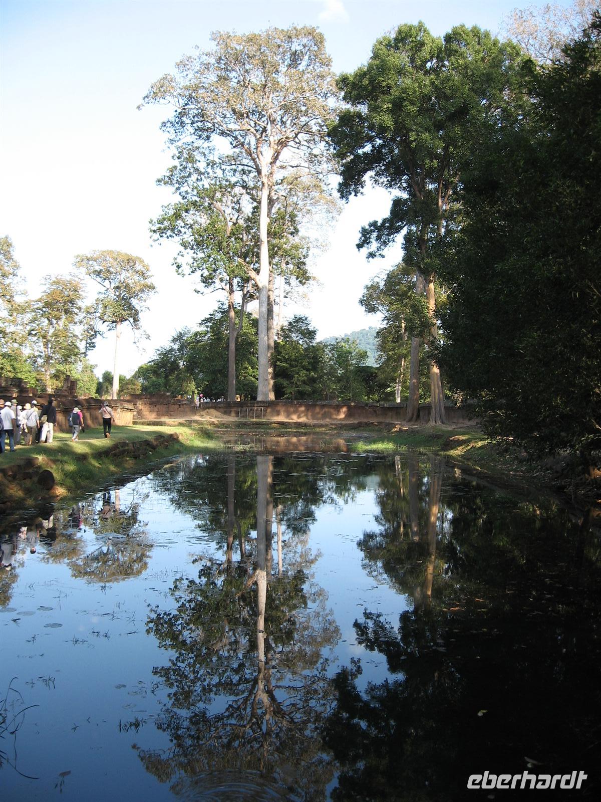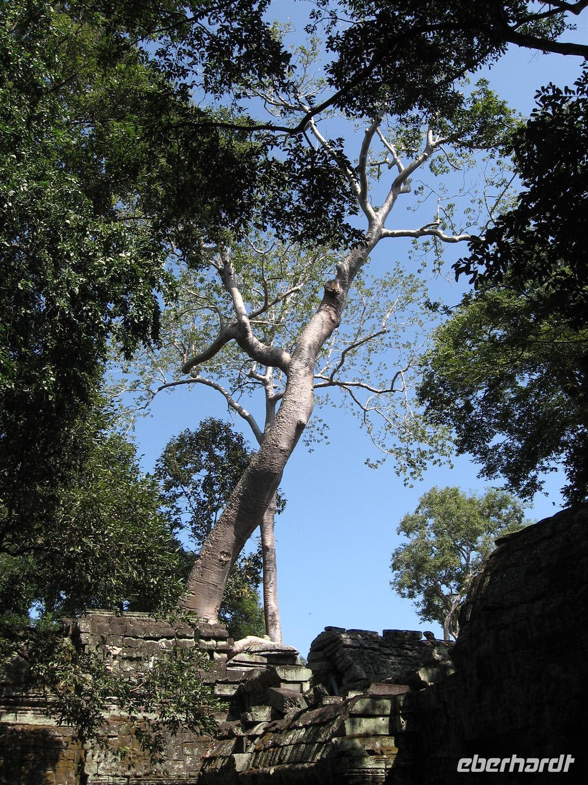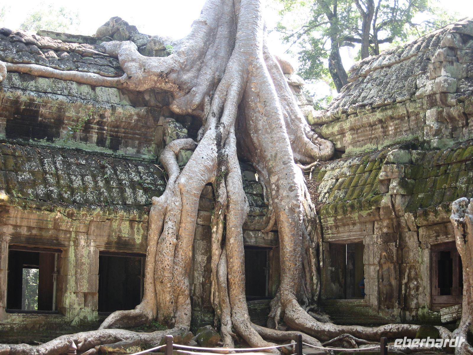 Vier weitere, in ihrer Art unterschiedliche, Tempelanlagen besuchen wir heute. Erster Stopp ist am Tempel „Prasat Kravan“. Die noch vorhandenen Türme sind nicht, wie sonst aus Sandstein, sondern aus Ziegelsteinen errichtet. Auf den ersten Blick erscheinen sie eher unspektakulär. Von Bedeutung sind die gut erhaltenen Backsteinreliefs mit Darstellungen von hinduistischen Göttern. Nicht weit entfernt findet sich der Tempel Banteay Kdei. Hierbei handelt es sich um ein Kloster, umgeben von einer Mauer aus Vulkangestein. Ursprünglich vom Dschungel völlig überwuchert wurde die Anlage bereits 1946 freigelegt, dabei allerdings nur wenig restauriert. Auch heute noch muss aller drei Monate das „Unkraut“ entfernt werden. Der Dschungel holt sich schnell zurück, was ihm gehört. An den Eingängen finden sich wieder Gesichtertürme und im inneren gibt es fast keinen Stein der nicht verziert ist. Gleich nebenan befindet sich einer der meistbesuchten Tempel, Ta Prohm, uns ist er besser bekannt als Dschungeltempel. Wie auch bei allen anderen Besichtigungen nutzt unser Reiseleiter Thol nicht die Wege und Besichtigungszeiten wie alle anderen Gruppen. So betreten wir Ta Prohm durch einen Nebeneingang und können eine ganze Weile die Anlage fast allein genießen. Majestätisch stehen die Bäume über den Ruinen, haben sie sich einverleibt. Mächtige Wurzeln haben sich wie Schlangen entlang der Mauern geschoben und man hat den Eindruck, sie halten die Mauern zusammen. Dabei ist es eher umgekehrt. Gewaltig und Beeindruckend. Anschließend haben wir uns eine Mittagspause
