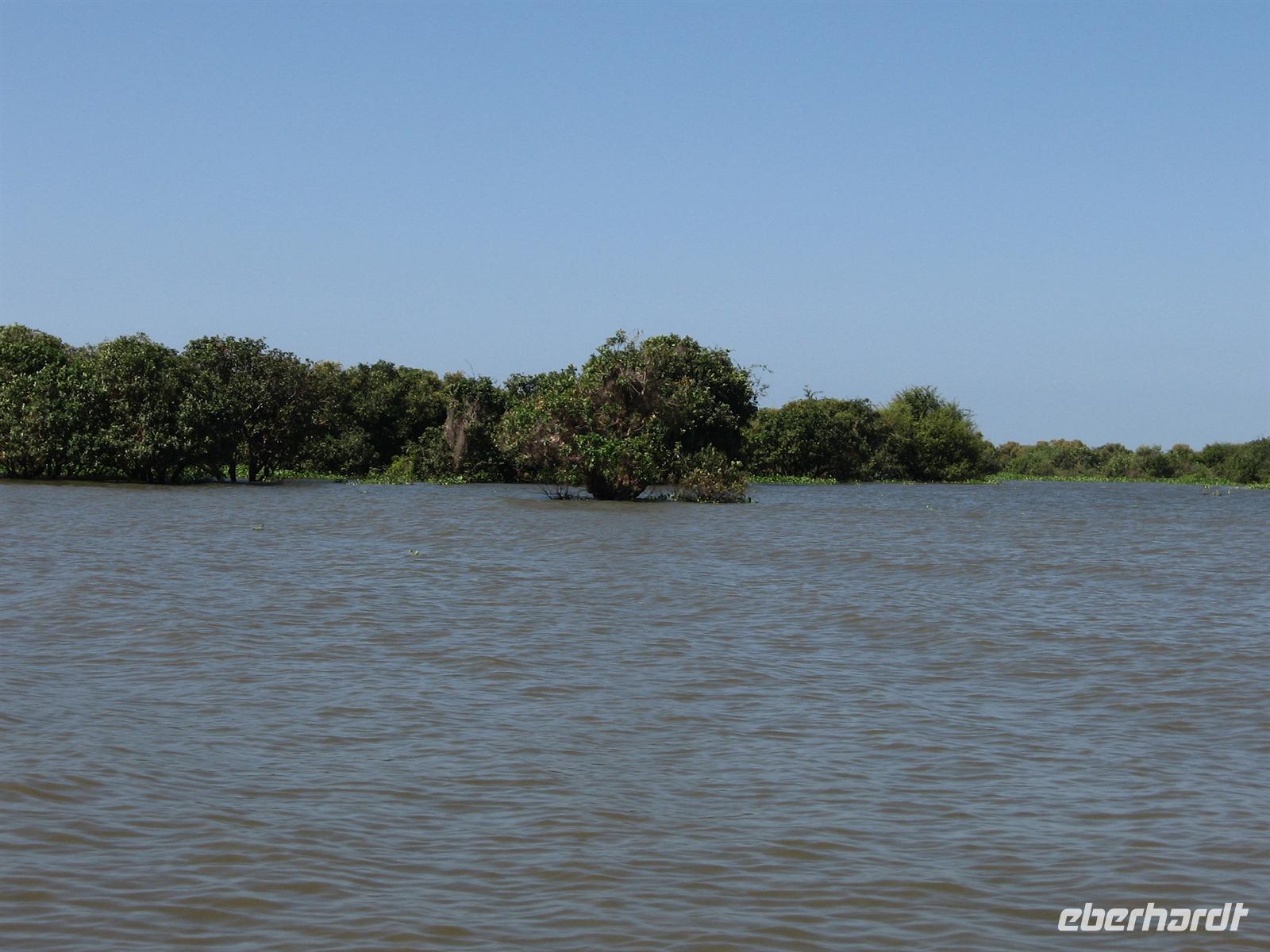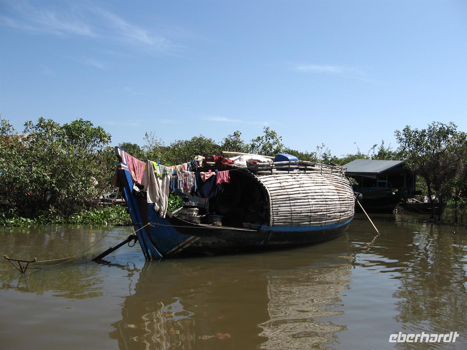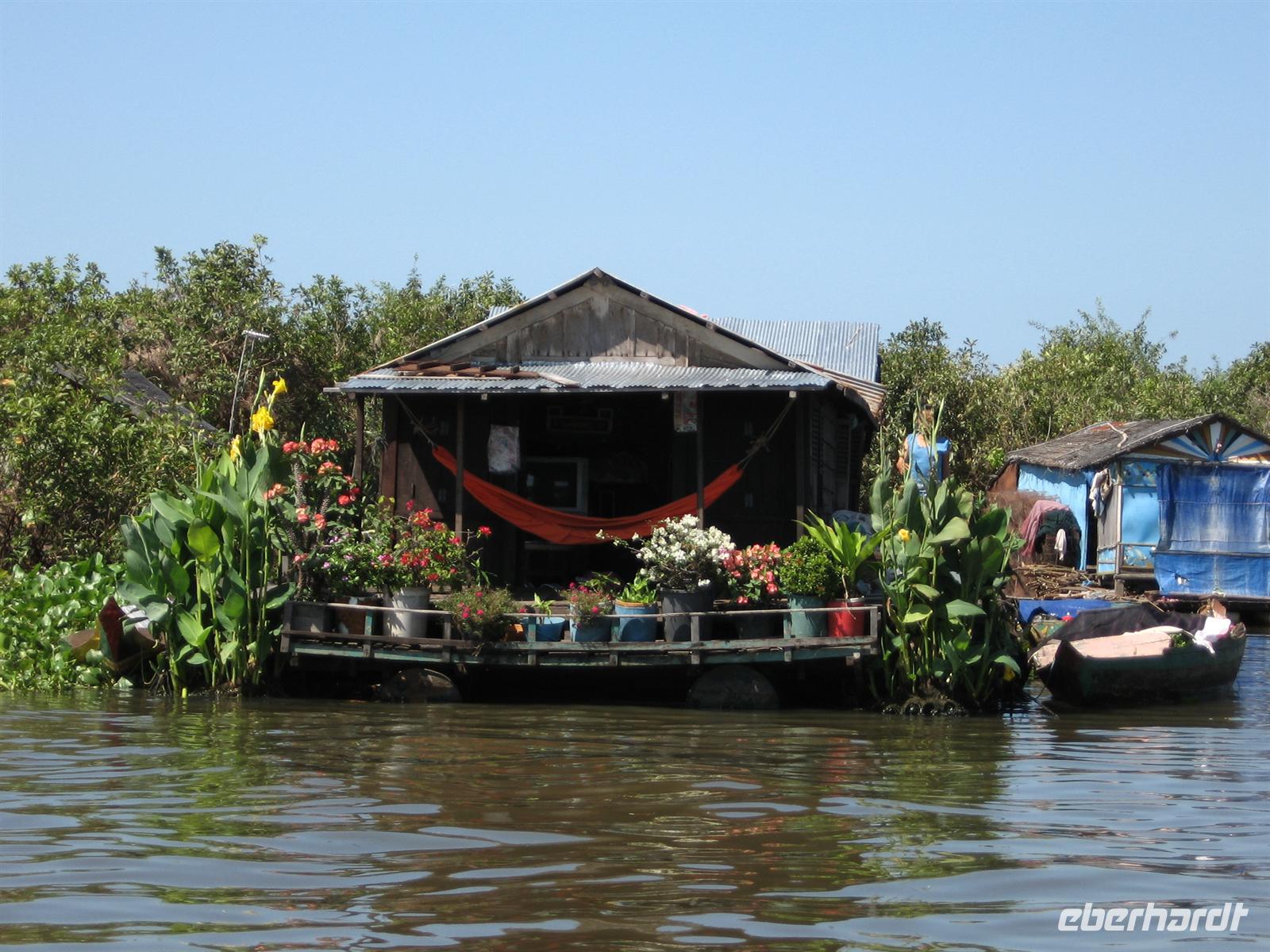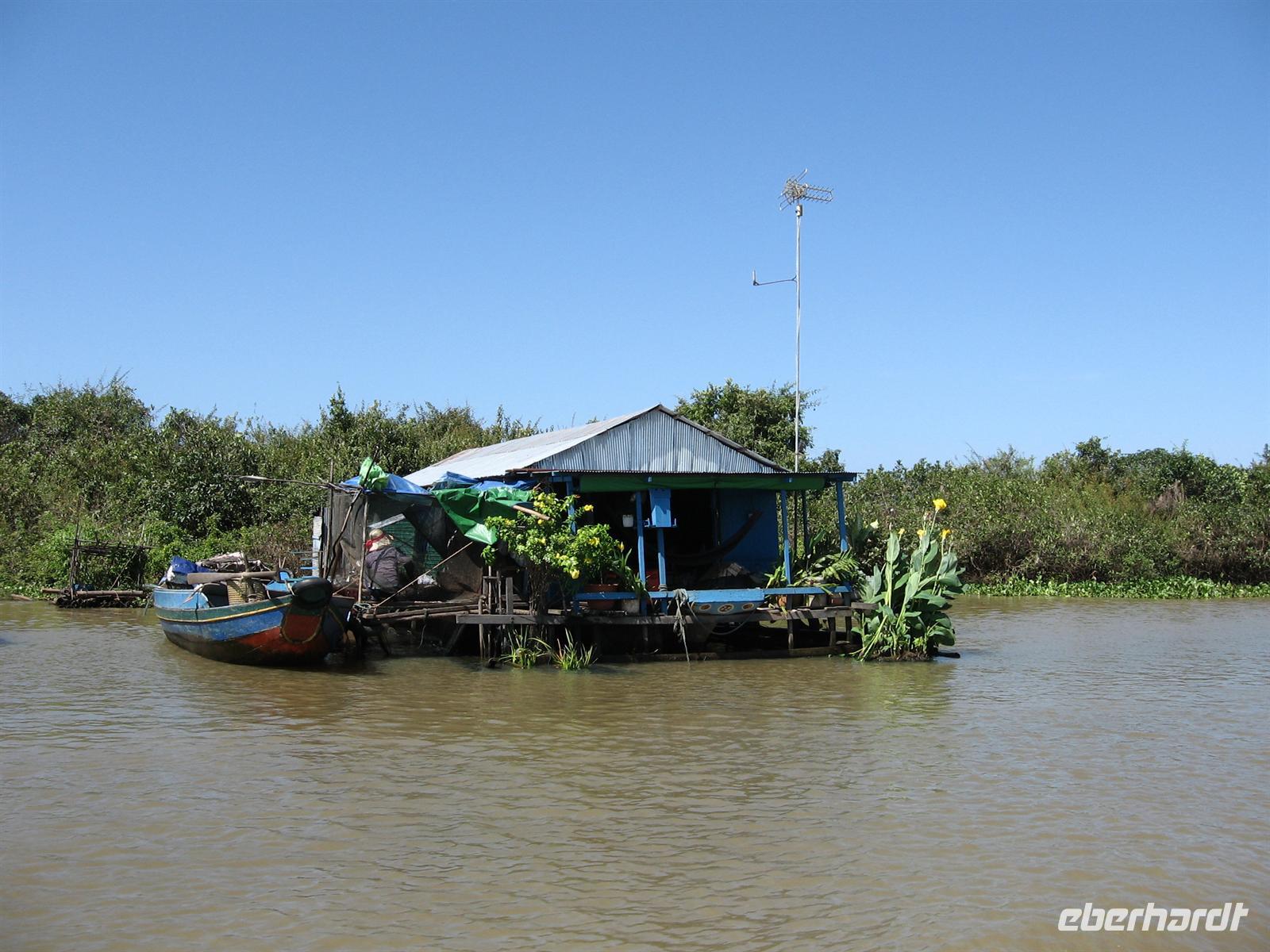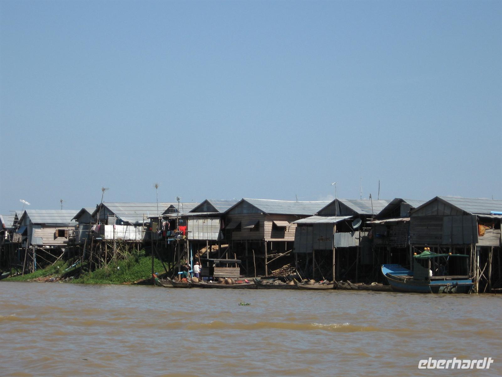 verändert sich auch die Wasserhöhe und schwankt von einem bis 10 Meter. Ohne den See wäre das Leben in Kambodscha so nicht möglich. Auch der Fischreichtum ist beeindruckend, 500 Arten leben im See, davon sind 100 kommerziell verwertbar. Fisch ist eines der wichtigsten Nahrungsmittel in Kambodscha. Ein Stopp an einem schwimmenden Souvenirgeschäft ist nicht sehr beeindruckend. Immer gibt es hier auch kleine Kinder, welche betteln oder sich für einen Dollar mit einer Schlange fotografieren lassen wollen. Ob sie wirklich sehr arm sind oder nur vor geschickt werden ist nicht nachzuvollziehen. Auf der Rückfahrt zum Hotel gehen wir noch zum Mittagessen, das Buffet-Restaurant ist das gleiche wie am ersten Abend. Die Getränke bekommen wir frei, eine kleine Entschuldigung an die Gäste für den Abend zuvor.