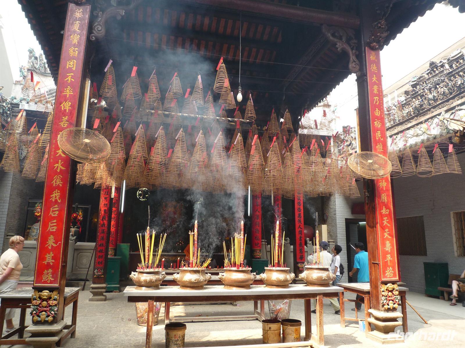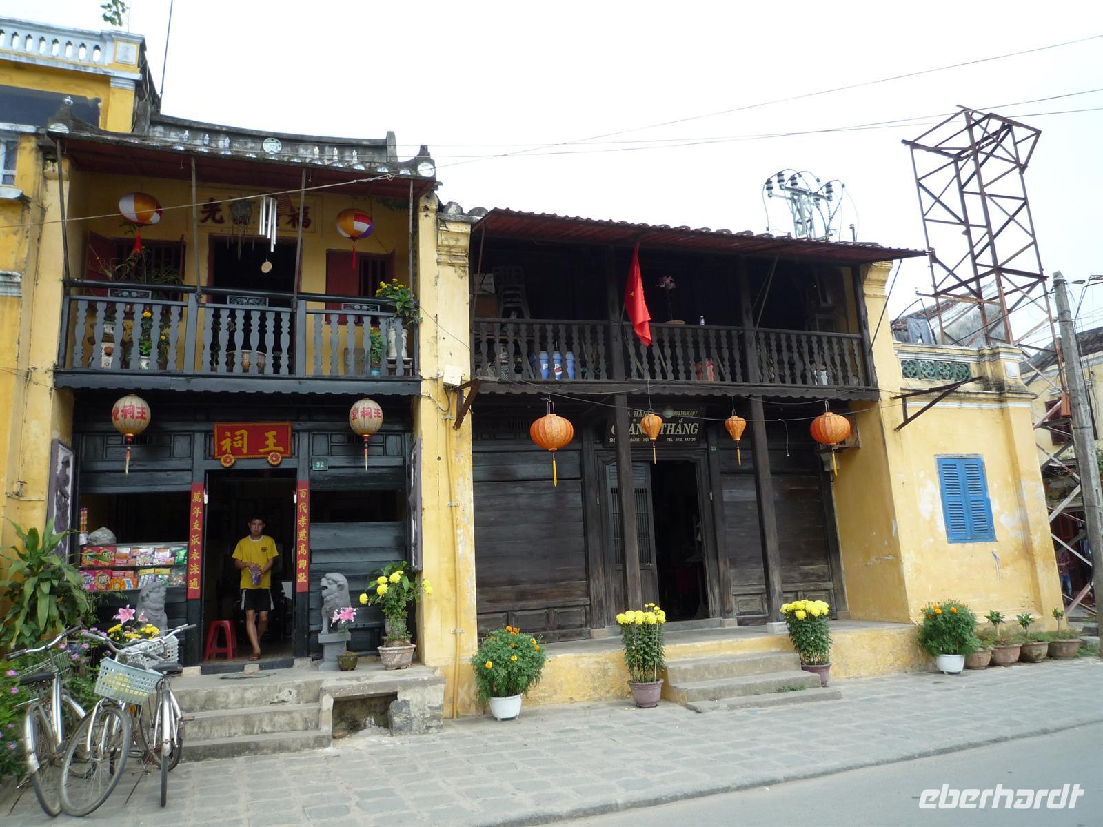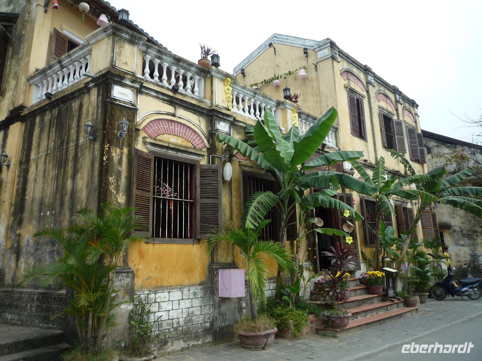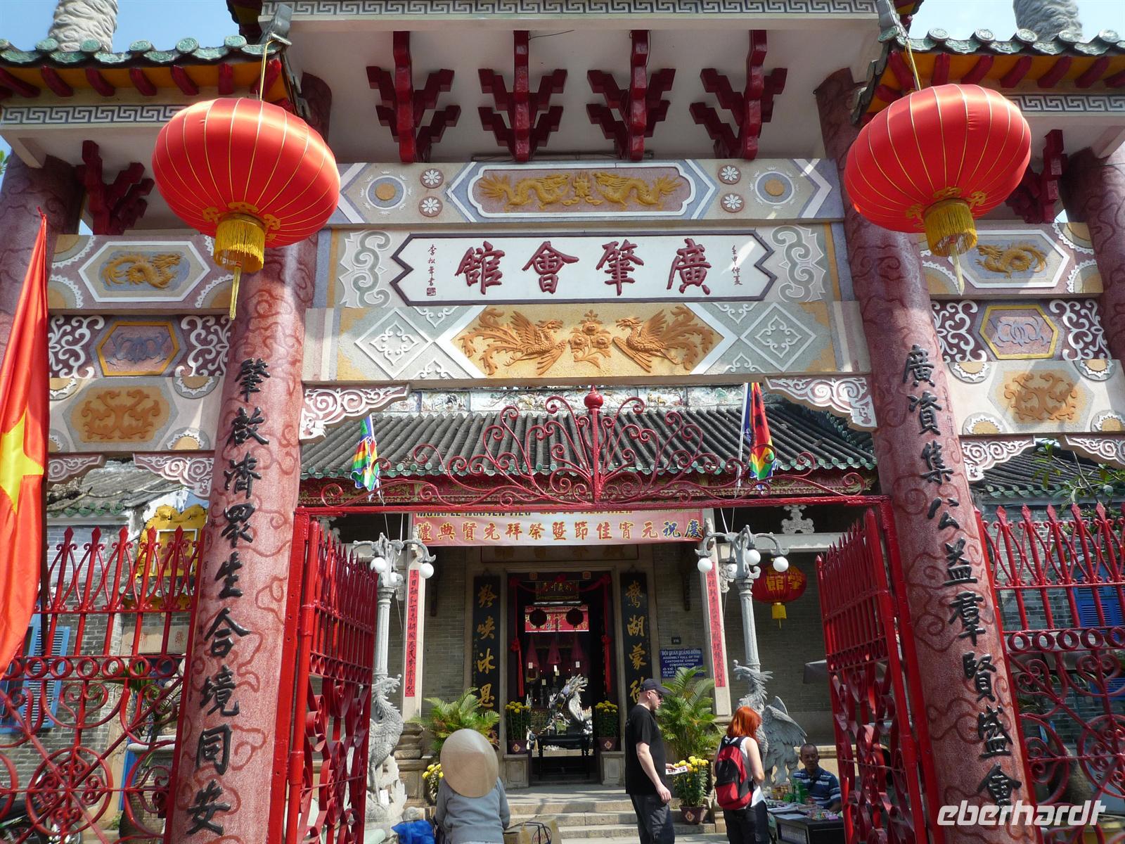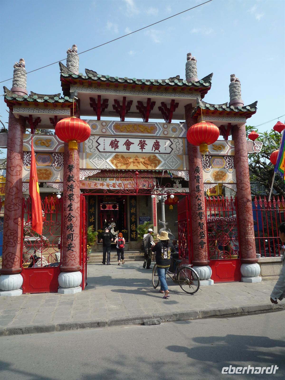 Die kleine Altstadt der alten Hafenstadt hat ein typisches südostasiatisches Flair und das ist ein Grund, weshalb sie zum UNESCO Weltkulturerbe gehört. Zuerst laufen wir über den Fischmarkt, wo am Morgen die Fänge der letzten Nacht verkauft werden. Wie immer auf den Märkten hier herrscht eine betriebsame Stimmung. Viele Frauen die verkaufen und einkaufen. Und immer wieder schiebt sich hupend ein Moped durch die engen Reihen des Marktes. Warum das sein muss verstehen wir nicht. So gehen wir weiter zur Versammlungshalle der Chinesen aus Fujian. Im 16./17. Jh. ließen sich hier zahlreiche Chinesen nieder, später auch Japaner und Holländer. 1300 Chinesen leben heute immer noch in der Stadt. Ihre Versammlungshallen wurden zum Ort der Religionsausübung und sind es heute immer noch. An der Decke hängen große Räucher-Spiralen, welche einige Tage glimmen. In der Mitte hängen dann Zettel mit wünschen für Gesundheit etc.