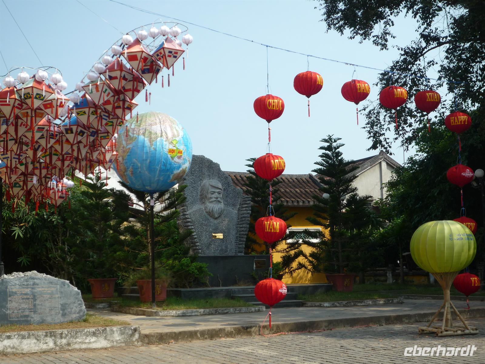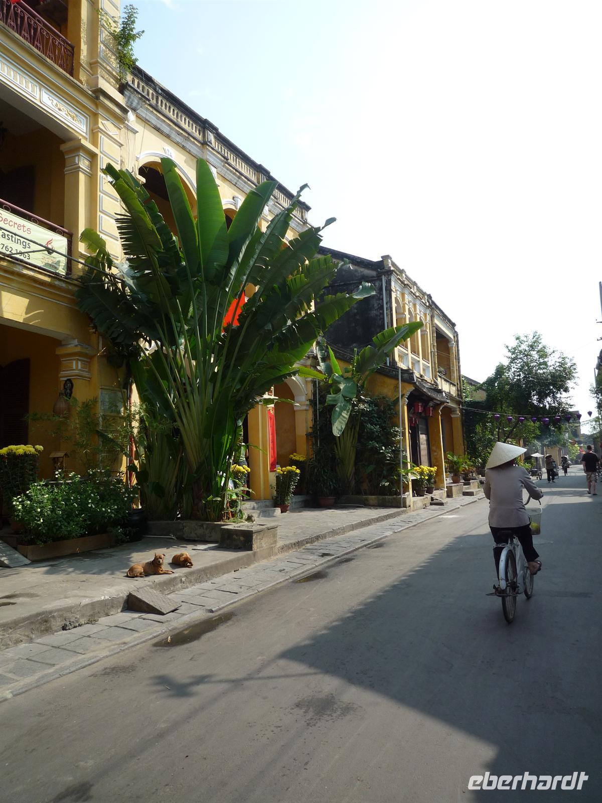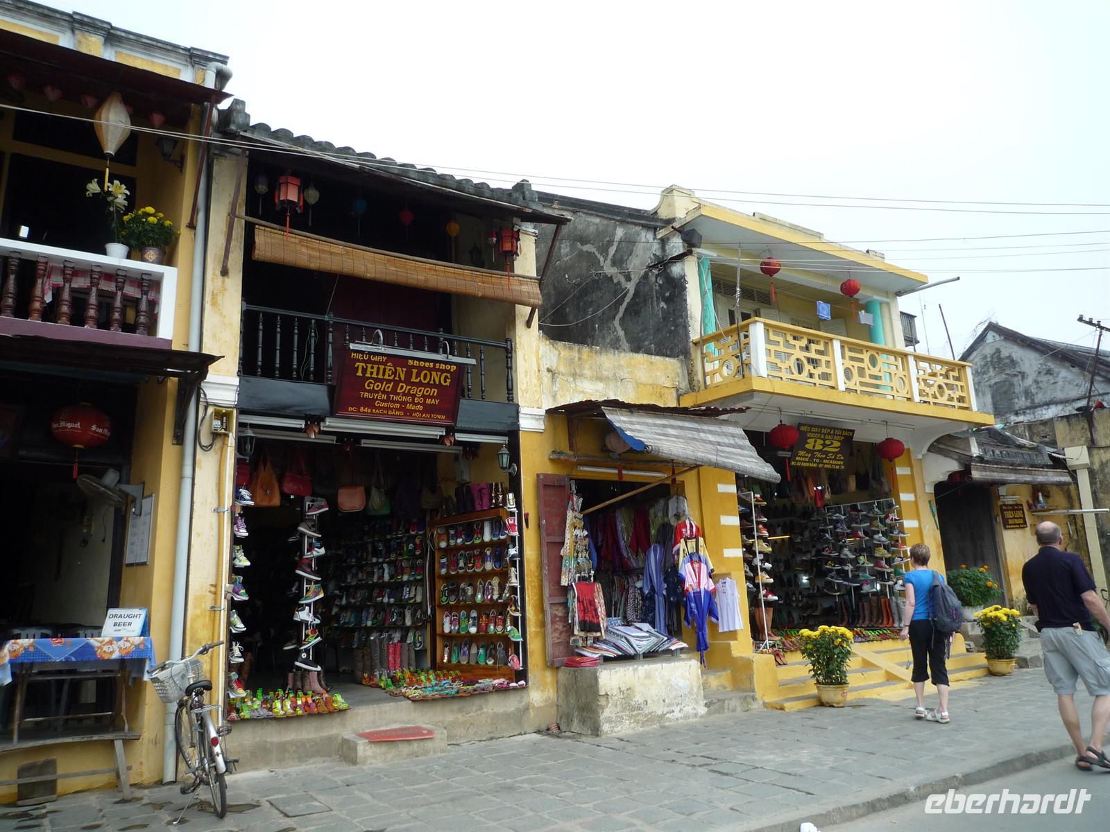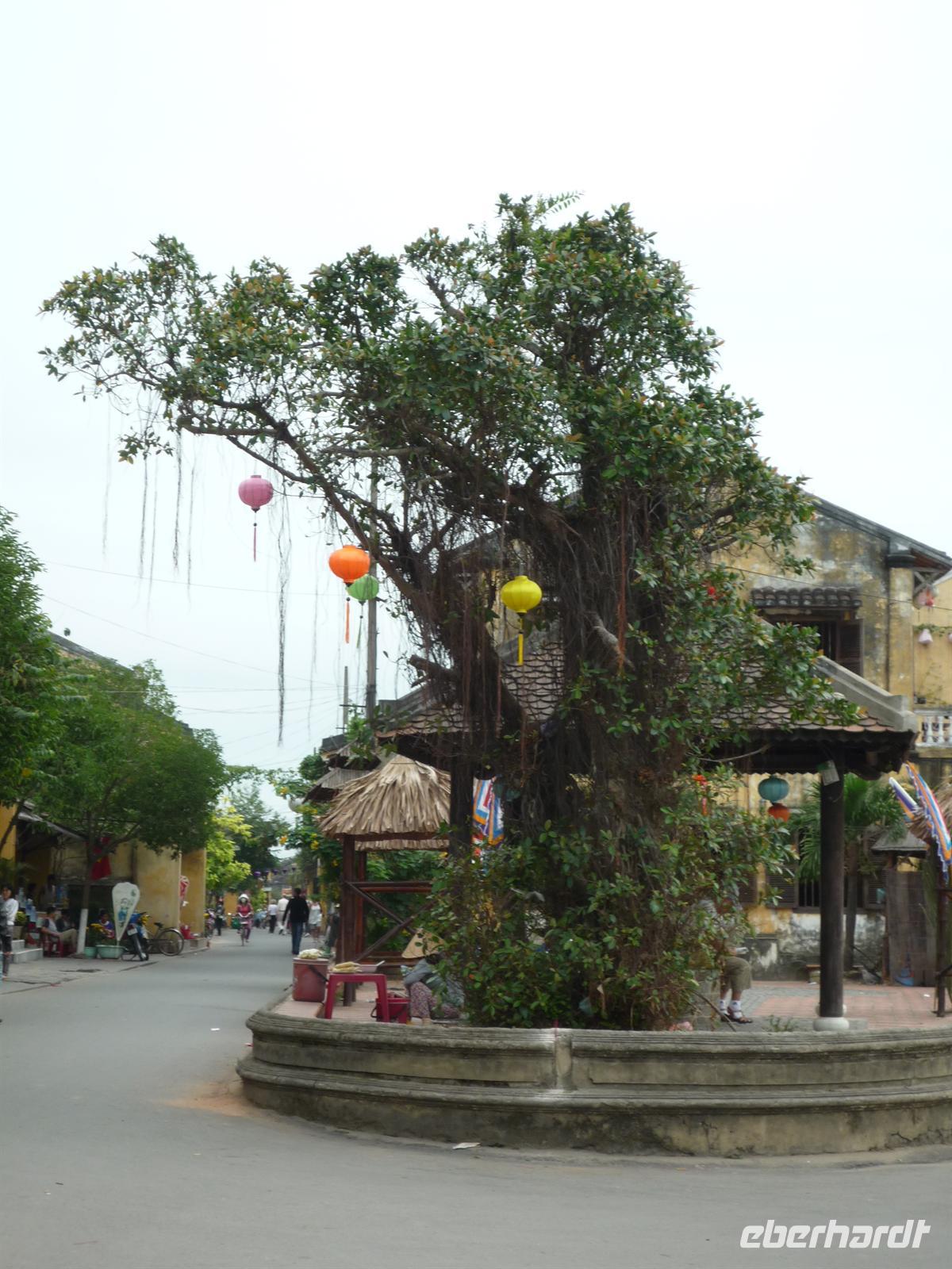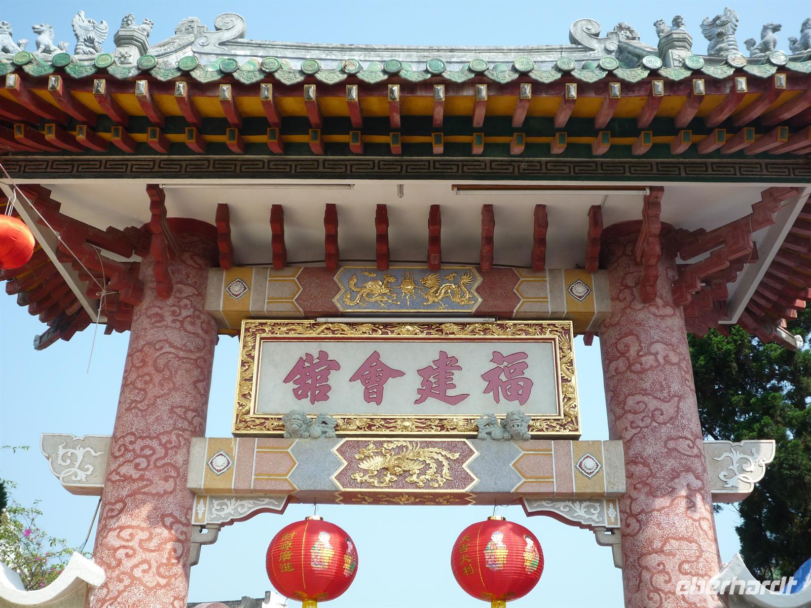 Die kleine Altstadt der alten Hafenstadt hat ein typisches südostasiatisches Flair und das ist ein Grund, weshalb sie zum UNESCO Weltkulturerbe gehört. Zuerst laufen wir über den Fischmarkt, wo am Morgen die Fänge der letzten Nacht verkauft werden. Wie immer auf den Märkten hier herrscht eine betriebsame Stimmung. Viele Frauen die verkaufen und einkaufen. Und immer wieder schiebt sich hupend ein Moped durch die engen Reihen des Marktes. Warum das sein muss verstehen wir nicht. So gehen wir weiter zur Versammlungshalle der Chinesen aus Fujian. Im 16./17. Jh. ließen sich hier zahlreiche Chinesen nieder, später auch Japaner und Holländer. 1300 Chinesen leben heute immer noch in der Stadt. Ihre Versammlungshallen wurden zum Ort der Religionsausübung und sind es heute immer noch. An der Decke hängen große Räucher-Spiralen, welche einige Tage glimmen. In der Mitte hängen dann Zettel mit wünschen für Gesundheit etc.