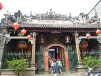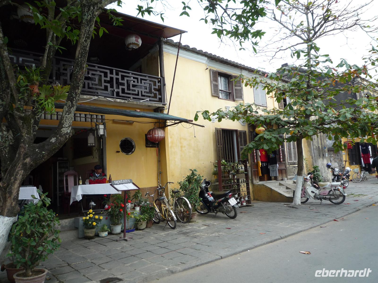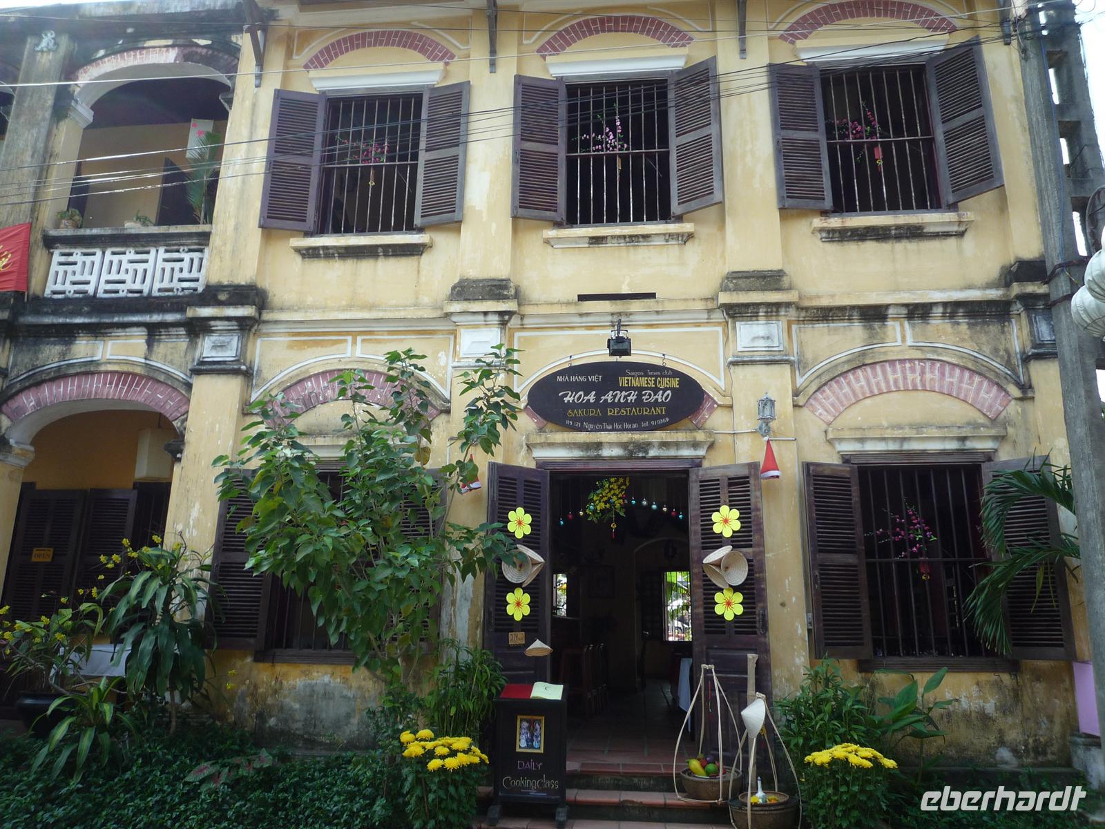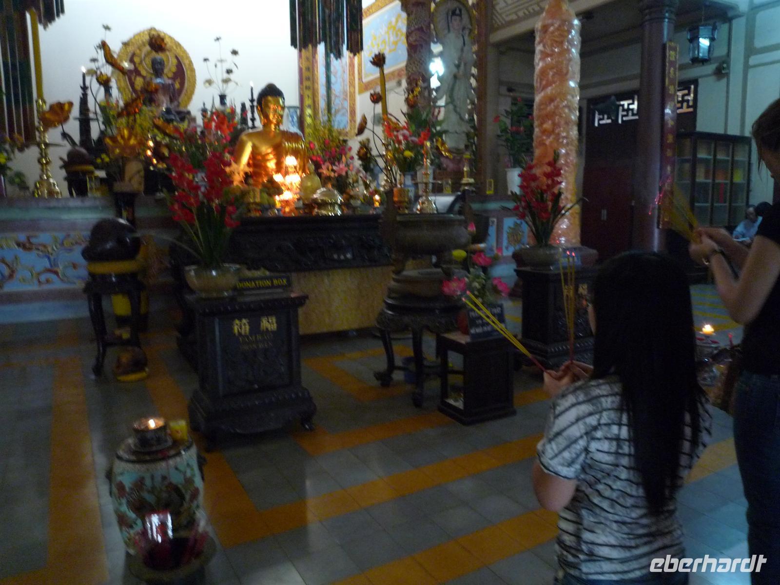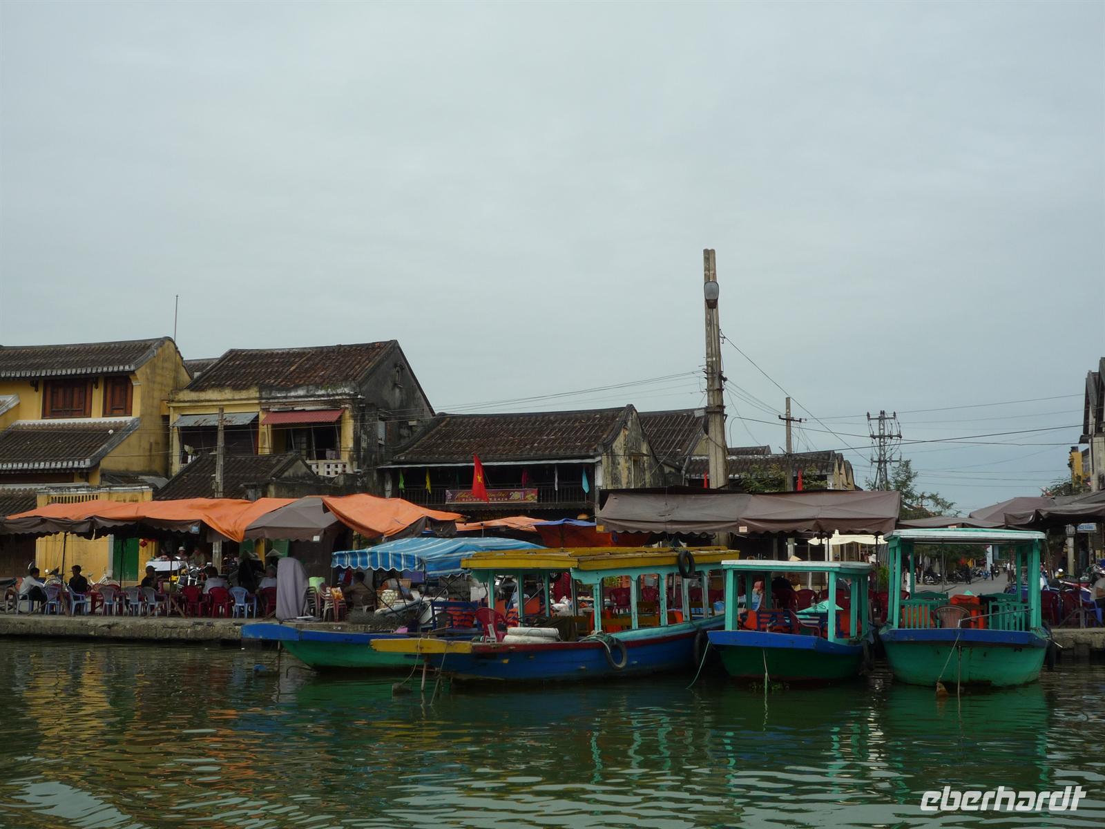 Die kleine Altstadt der alten Hafenstadt hat ein typisches südostasiatisches Flair und das ist ein Grund, weshalb sie zum UNESCO Weltkulturerbe gehört. Zuerst laufen wir über den Fischmarkt, wo am Morgen die Fänge der letzten Nacht verkauft werden. Wie immer auf den Märkten hier herrscht eine betriebsame Stimmung. Viele Frauen die verkaufen und einkaufen. Und immer wieder schiebt sich hupend ein Moped durch die engen Reihen des Marktes. Warum das sein muss verstehen wir nicht. So gehen wir weiter zur Versammlungshalle der Chinesen aus Fujian. Im 16./17. Jh. ließen sich hier zahlreiche Chinesen nieder, später auch Japaner und Holländer. 1300 Chinesen leben heute immer noch in der Stadt. Ihre Versammlungshallen wurden zum Ort der Religionsausübung und sind es heute immer noch. An der Decke hängen große Räucher-Spiralen, welche einige Tage glimmen. In der Mitte hängen dann Zettel mit wünschen für Gesundheit etc.