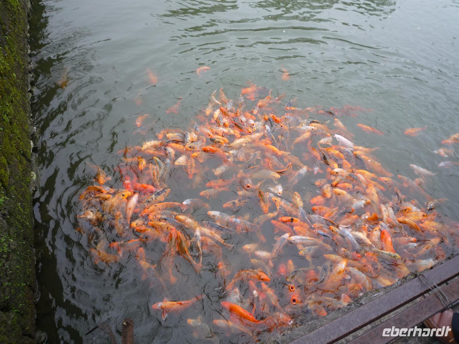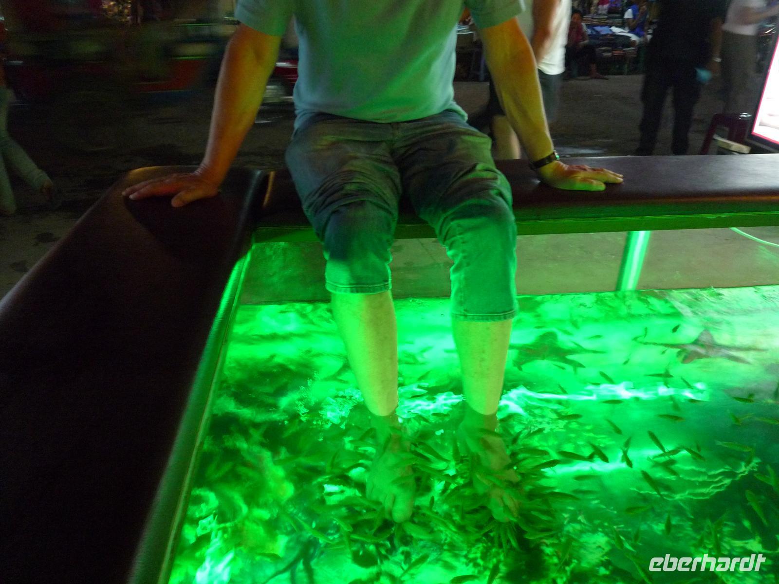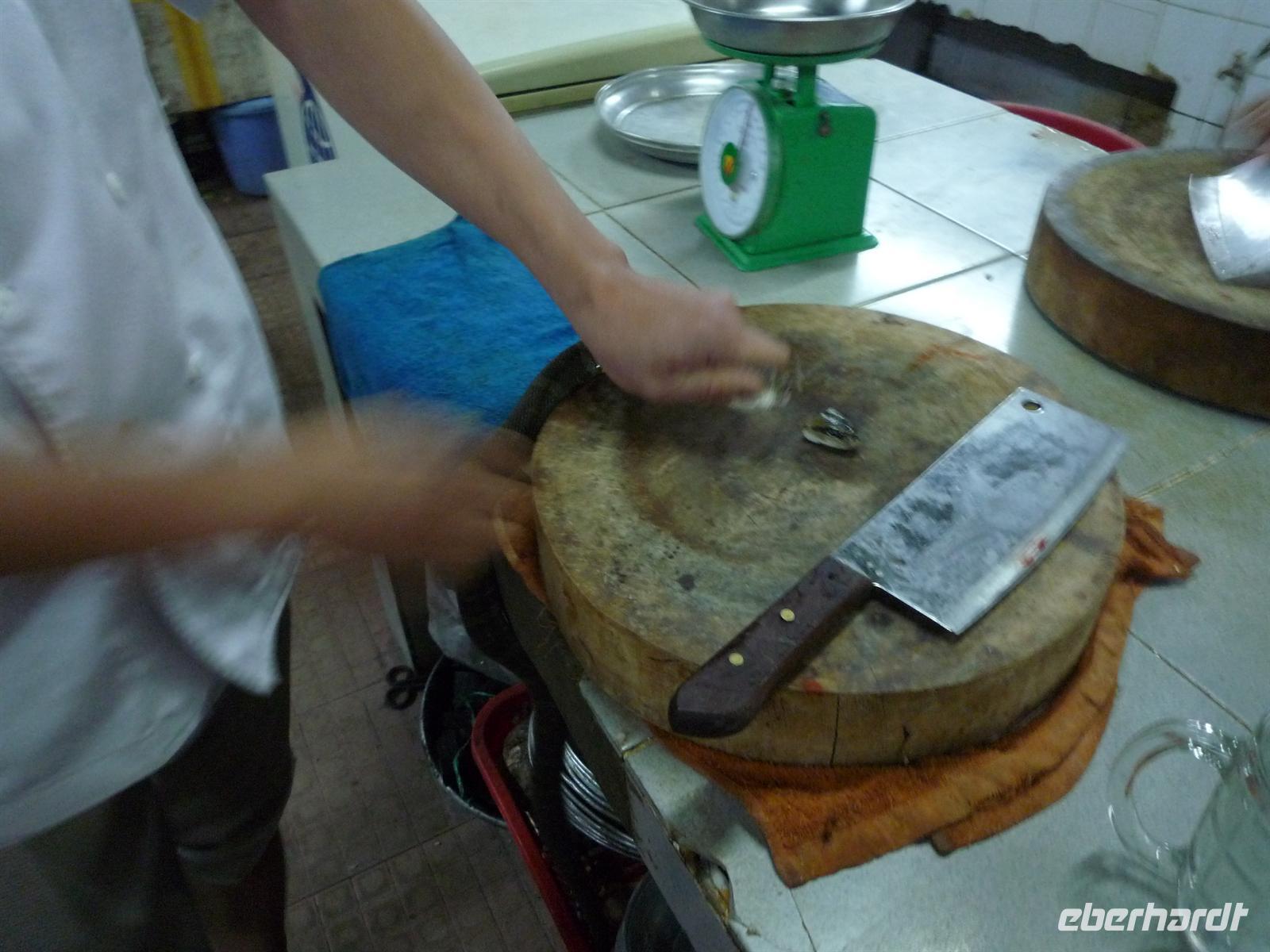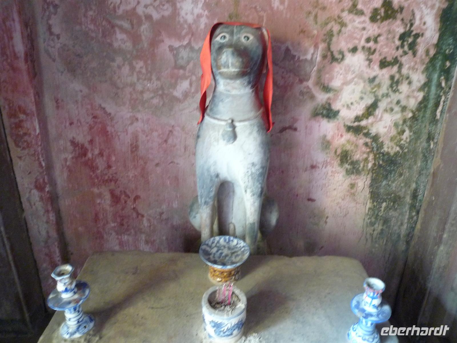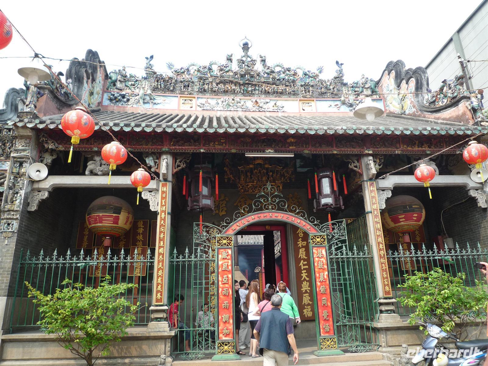 Die kleine Altstadt der alten Hafenstadt hat ein typisches südostasiatisches Flair und das ist ein Grund, weshalb sie zum UNESCO Weltkulturerbe gehört. Zuerst laufen wir über den Fischmarkt, wo am Morgen die Fänge der letzten Nacht verkauft werden. Wie immer auf den Märkten hier herrscht eine betriebsame Stimmung. Viele Frauen die verkaufen und einkaufen. Und immer wieder schiebt sich hupend ein Moped durch die engen Reihen des Marktes. Warum das sein muss verstehen wir nicht. So gehen wir weiter zur Versammlungshalle der Chinesen aus Fujian. Im 16./17. Jh. ließen sich hier zahlreiche Chinesen nieder, später auch Japaner und Holländer. 1300 Chinesen leben heute immer noch in der Stadt. Ihre Versammlungshallen wurden zum Ort der Religionsausübung und sind es heute immer noch. An der Decke hängen große Räucher-Spiralen, welche einige Tage glimmen. In der Mitte hängen dann Zettel mit wünschen für Gesundheit etc.