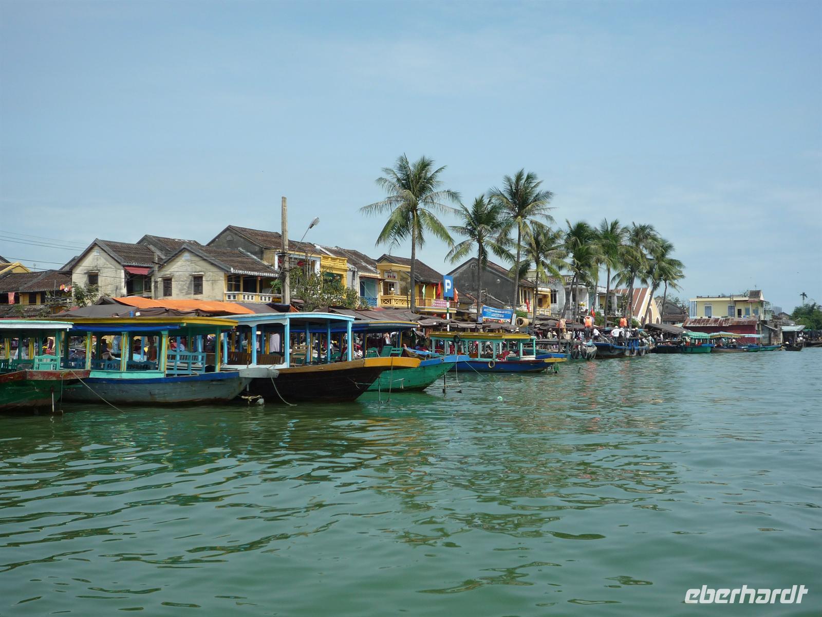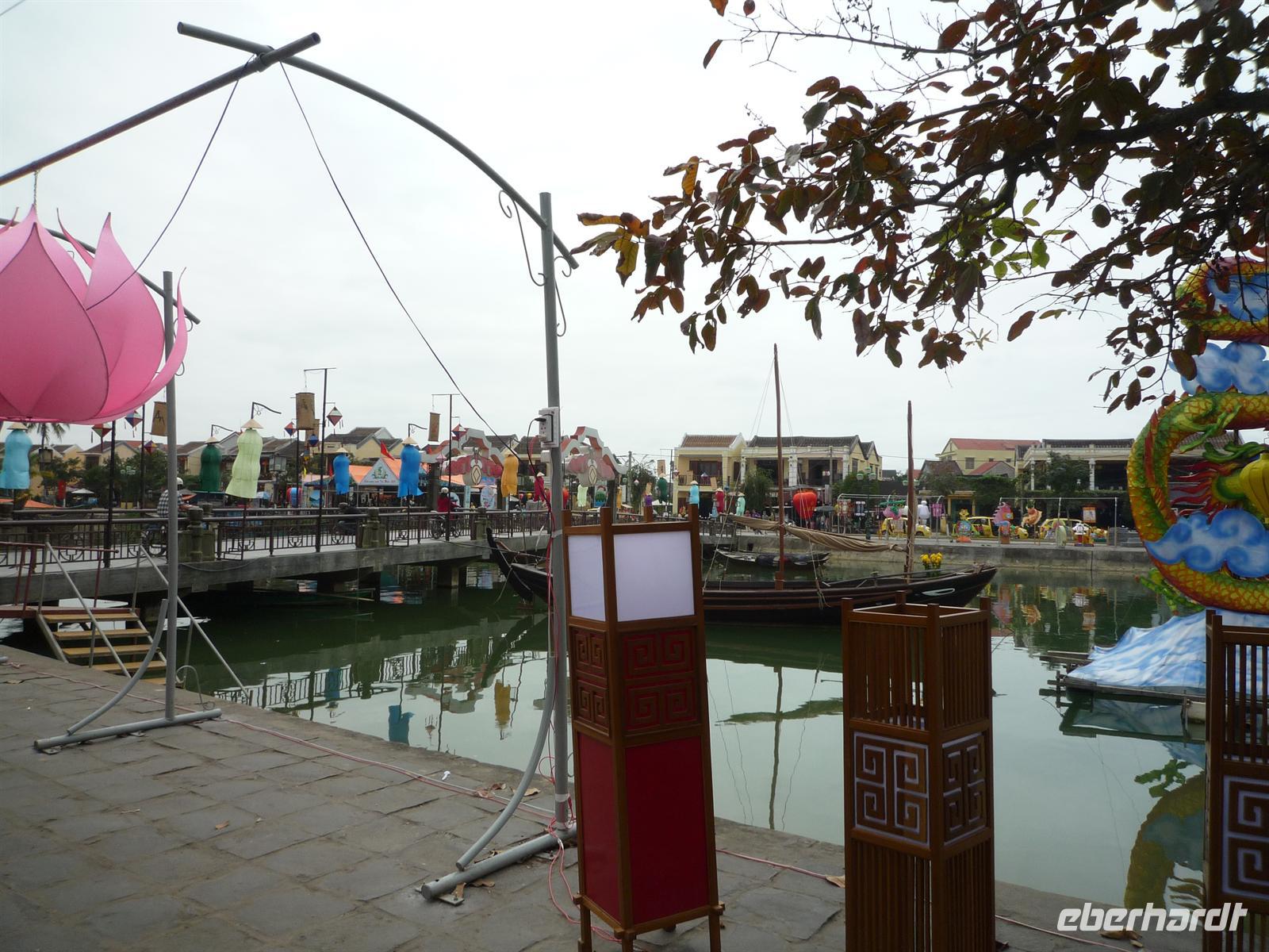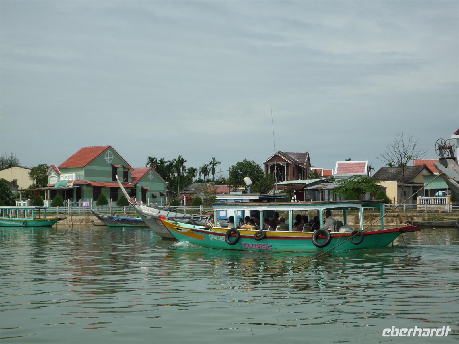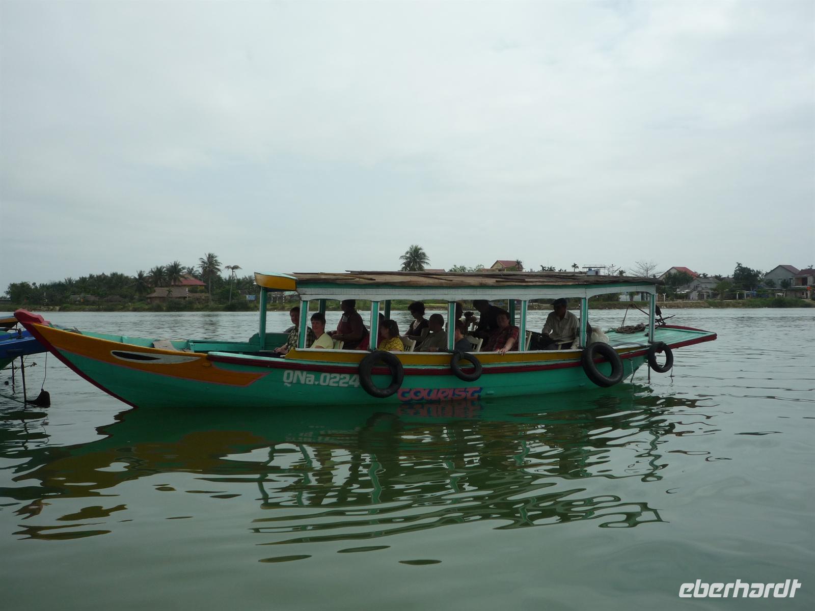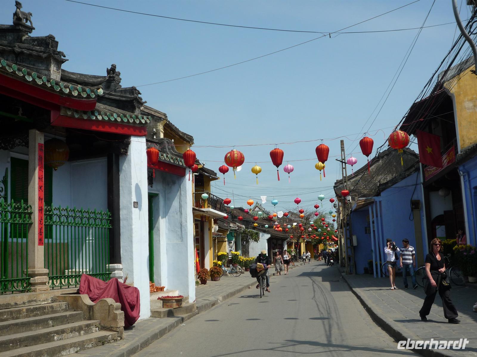 Am alten Hafen entlang, wo es heute hauptsächlich Ausflugsboote für Touristen liegen, laufen wir zur japanischen Brücke. Die schlichte, überdachte, Holzbrücke beherbergt auch noch eine Brückenpagode, die dem Herrscher des Nordens geweiht ist. Diesem werden die Macht über Wind, Regen und andere schlechte Einflüsse zugeschrieben. Gleich nebenan können wir einen Blick in eines der traditionellen Häuser nehmen. Das Phung-Hung-Haus ist seit acht Generationen im Besitz derselben Familie. Hoi An ist auch berühmt für seine zahlreichen Schneidereien. Hier kann man sich günstig etwas nähen lassen. Die Stadt hat sich ihr charmantes Flair erhalten und lädt immer wieder zu einem Bummel ein. Nach einer Mittagspause machen wir noch eine Bootsfahrt auf den Thu Bon River, wo wir die Mangroven-Landschaft beobachten. Nach dem Mittagessen genießen alle ihre Freizeit. Einige schauen sich die Stadt bei einem Spaziergang an und einen großen Teil der Gruppe zieht es zum Meer, um zu baden. Besonders am Abend lädt Hoi An zu einem Spaziergang ein, denn alles ist herrlich beleuchtet, überall sind Lampions aufgehängt.