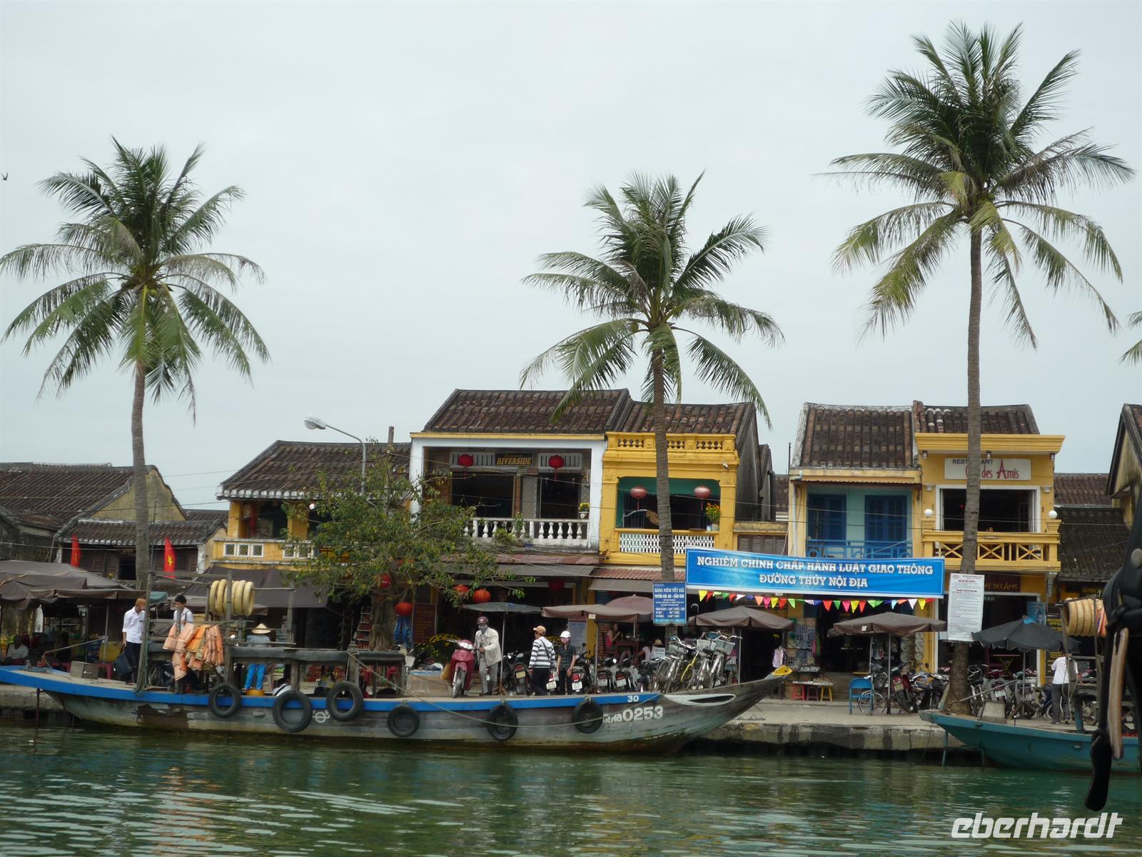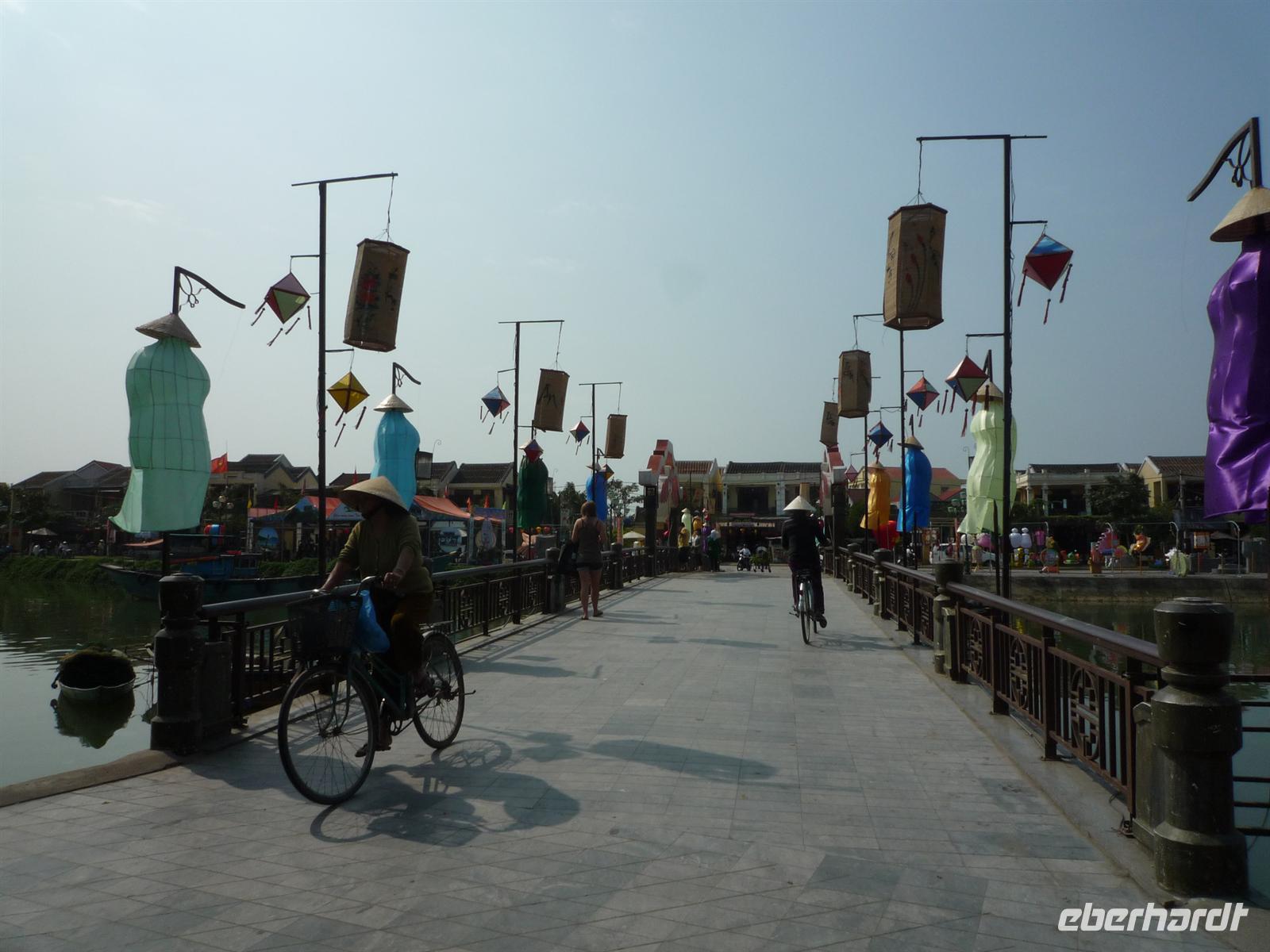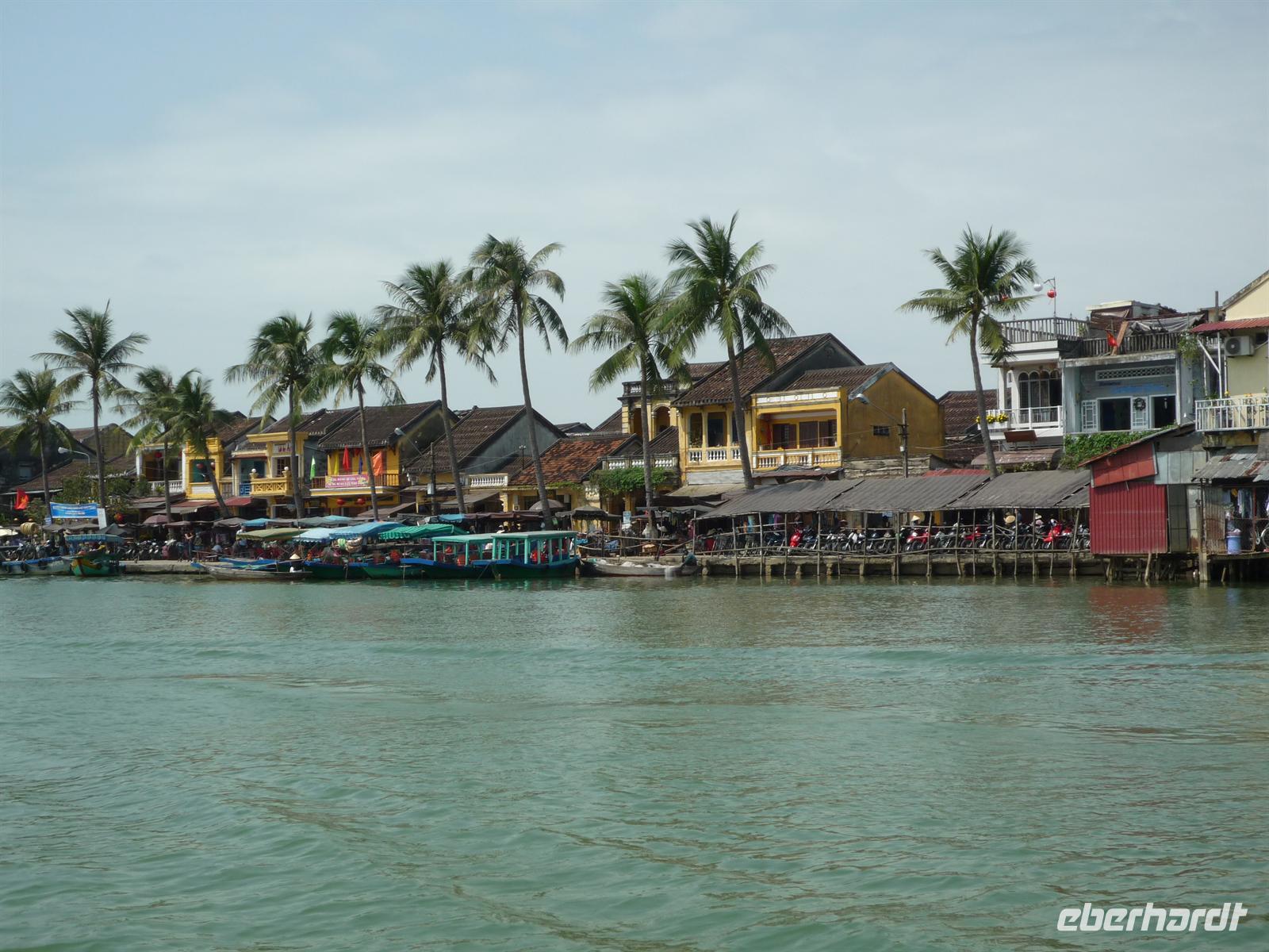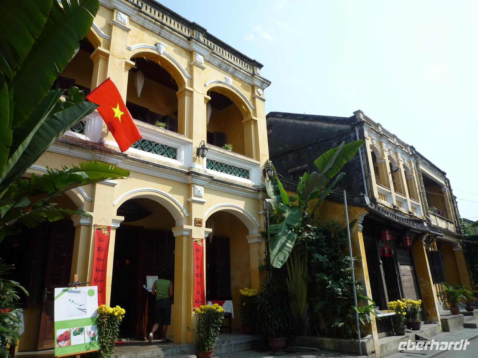 Am alten Hafen entlang, wo es heute hauptsächlich Ausflugsboote für Touristen liegen, laufen wir zur japanischen Brücke. Die schlichte, überdachte, Holzbrücke beherbergt auch noch eine Brückenpagode, die dem Herrscher des Nordens geweiht ist. Diesem werden die Macht über Wind, Regen und andere schlechte Einflüsse zugeschrieben. Gleich nebenan können wir einen Blick in eines der traditionellen Häuser nehmen. Das Phung-Hung-Haus ist seit acht Generationen im Besitz derselben Familie. Hoi An ist auch berühmt für seine zahlreichen Schneidereien. Hier kann man sich günstig etwas nähen lassen. Die Stadt hat sich ihr charmantes Flair erhalten und lädt immer wieder zu einem Bummel ein. Nach einer Mittagspause machen wir noch eine Bootsfahrt auf den Thu Bon River, wo wir die Mangroven-Landschaft beobachten. Nach dem Mittagessen genießen alle ihre Freizeit. Einige schauen sich die Stadt bei einem Spaziergang an und einen großen Teil der Gruppe zieht es zum Meer, um zu baden. Besonders am Abend lädt Hoi An zu einem Spaziergang ein, denn alles ist herrlich beleuchtet, überall sind Lampions aufgehängt.