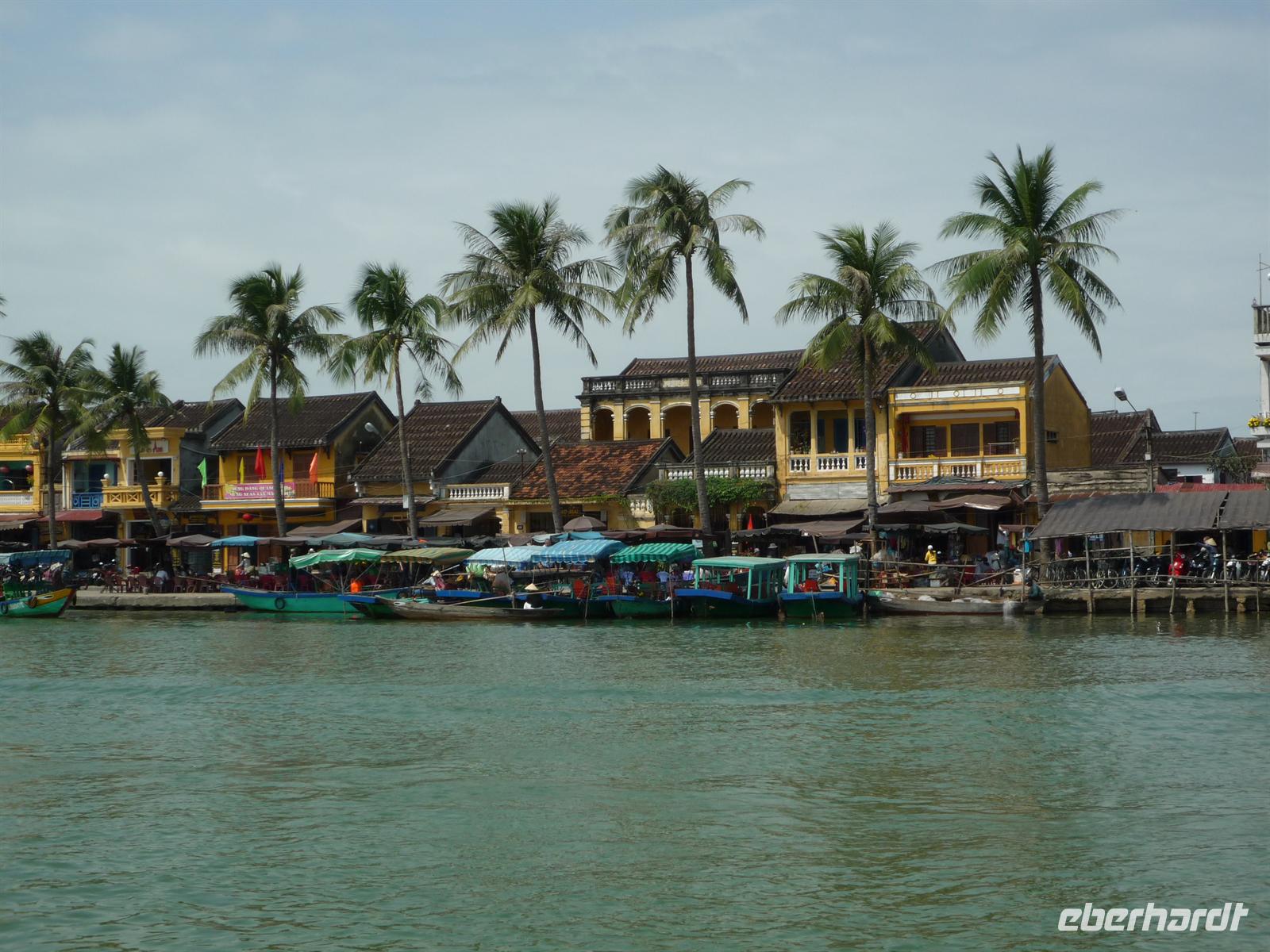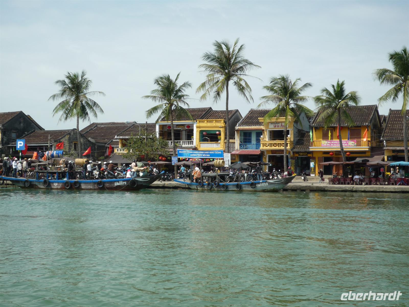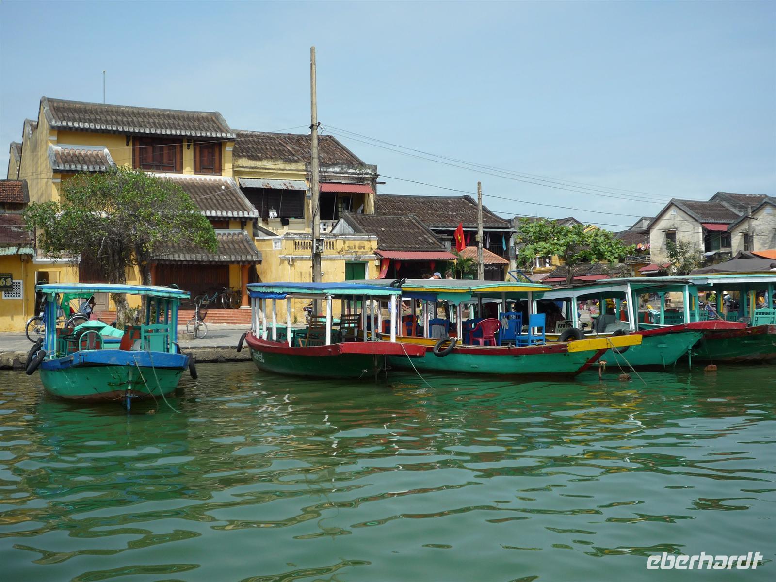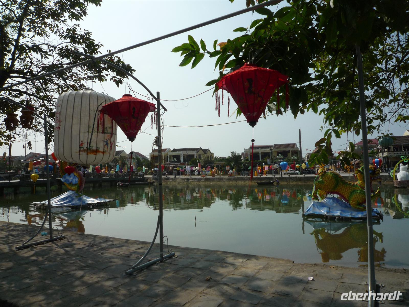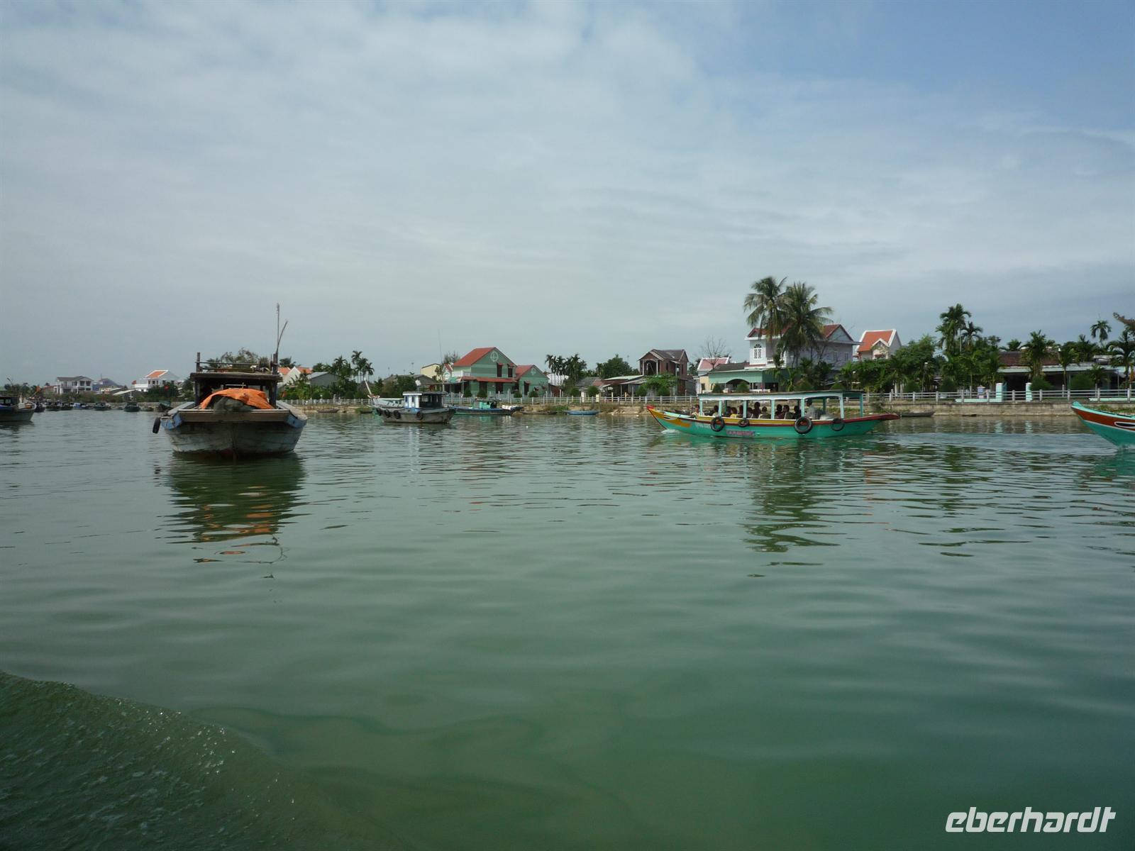 Am alten Hafen entlang, wo es heute hauptsächlich Ausflugsboote für Touristen liegen, laufen wir zur japanischen Brücke. Die schlichte, überdachte, Holzbrücke beherbergt auch noch eine Brückenpagode, die dem Herrscher des Nordens geweiht ist. Diesem werden die Macht über Wind, Regen und andere schlechte Einflüsse zugeschrieben. Gleich nebenan können wir einen Blick in eines der traditionellen Häuser nehmen. Das Phung-Hung-Haus ist seit acht Generationen im Besitz derselben Familie. Hoi An ist auch berühmt für seine zahlreichen Schneidereien. Hier kann man sich günstig etwas nähen lassen. Die Stadt hat sich ihr charmantes Flair erhalten und lädt immer wieder zu einem Bummel ein. Nach einer Mittagspause machen wir noch eine Bootsfahrt auf den Thu Bon River, wo wir die Mangroven-Landschaft beobachten. Nach dem Mittagessen genießen alle ihre Freizeit. Einige schauen sich die Stadt bei einem Spaziergang an und einen großen Teil der Gruppe zieht es zum Meer, um zu baden. Besonders am Abend lädt Hoi An zu einem Spaziergang ein, denn alles ist herrlich beleuchtet, überall sind Lampions aufgehängt.