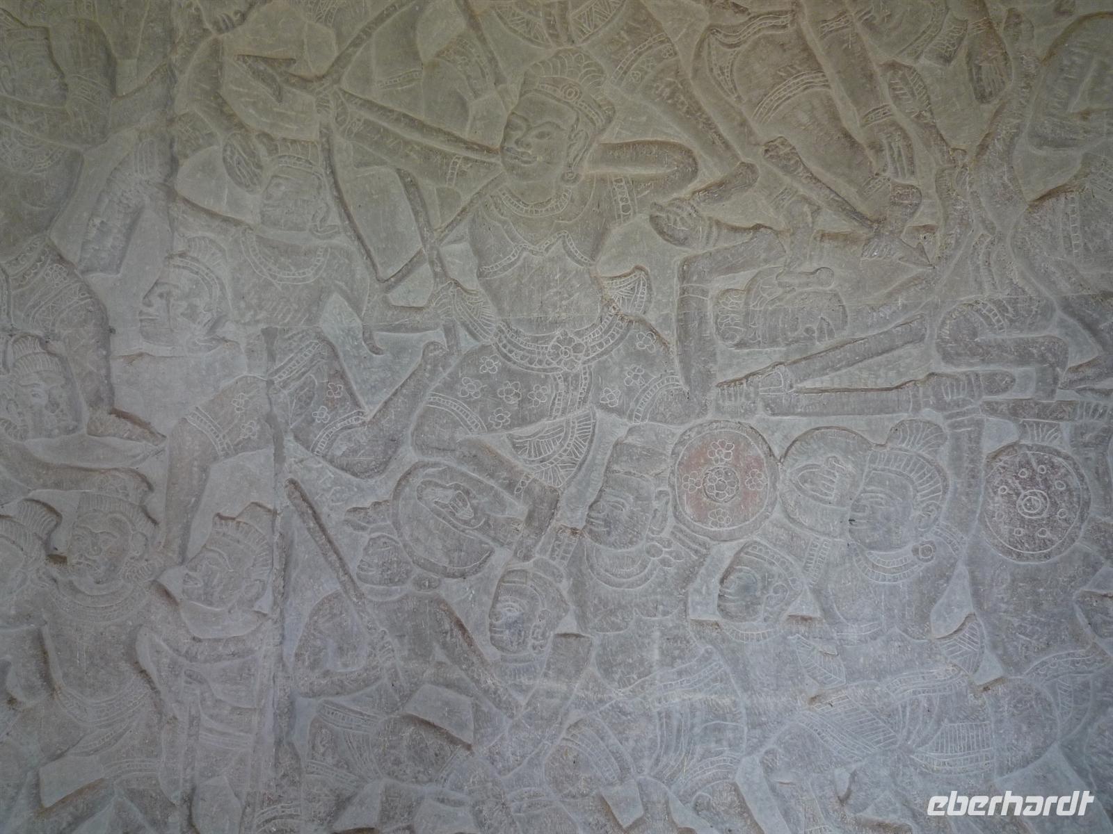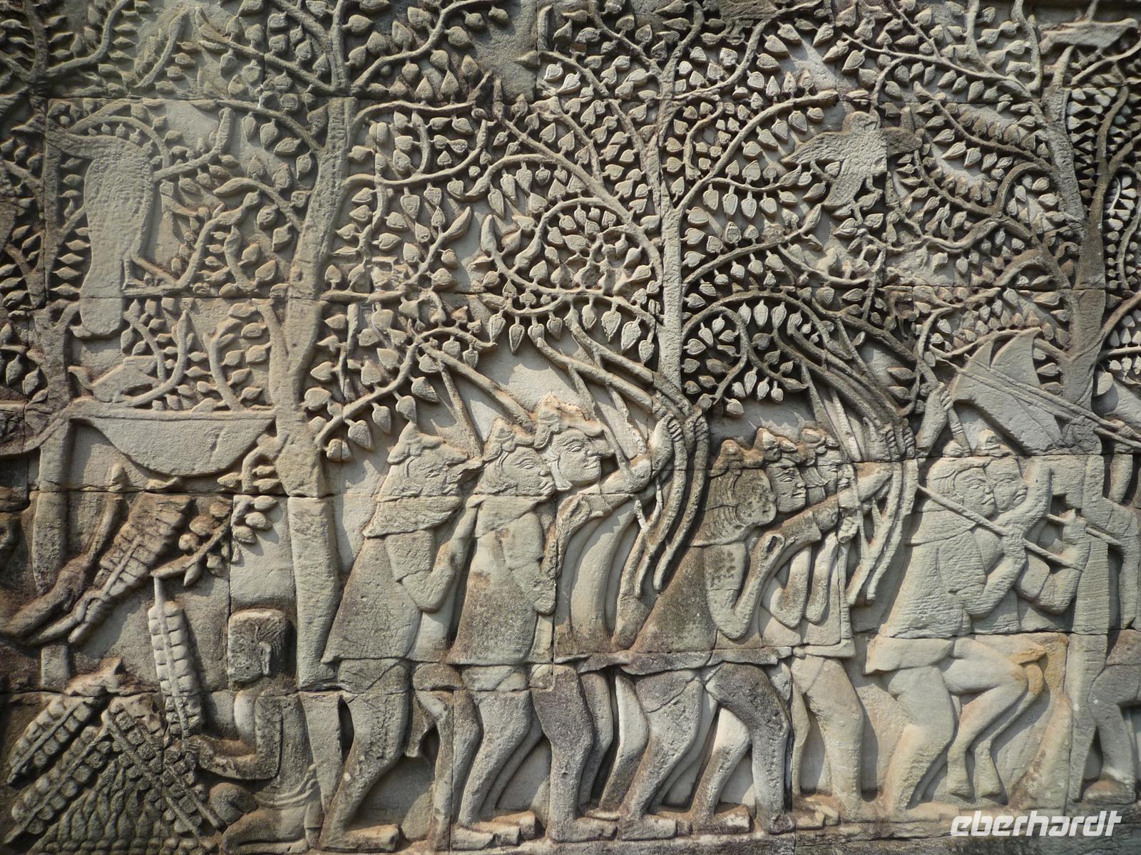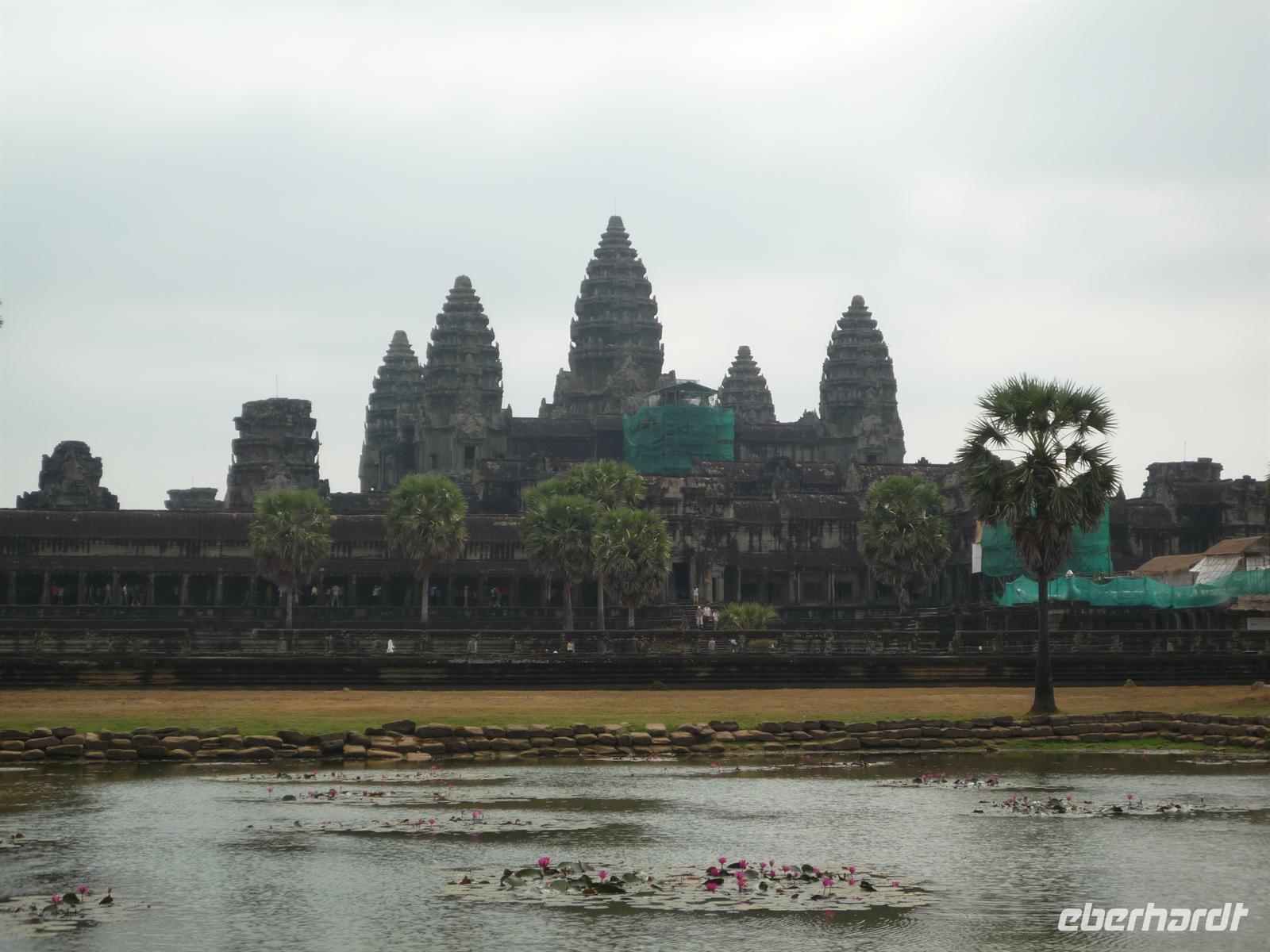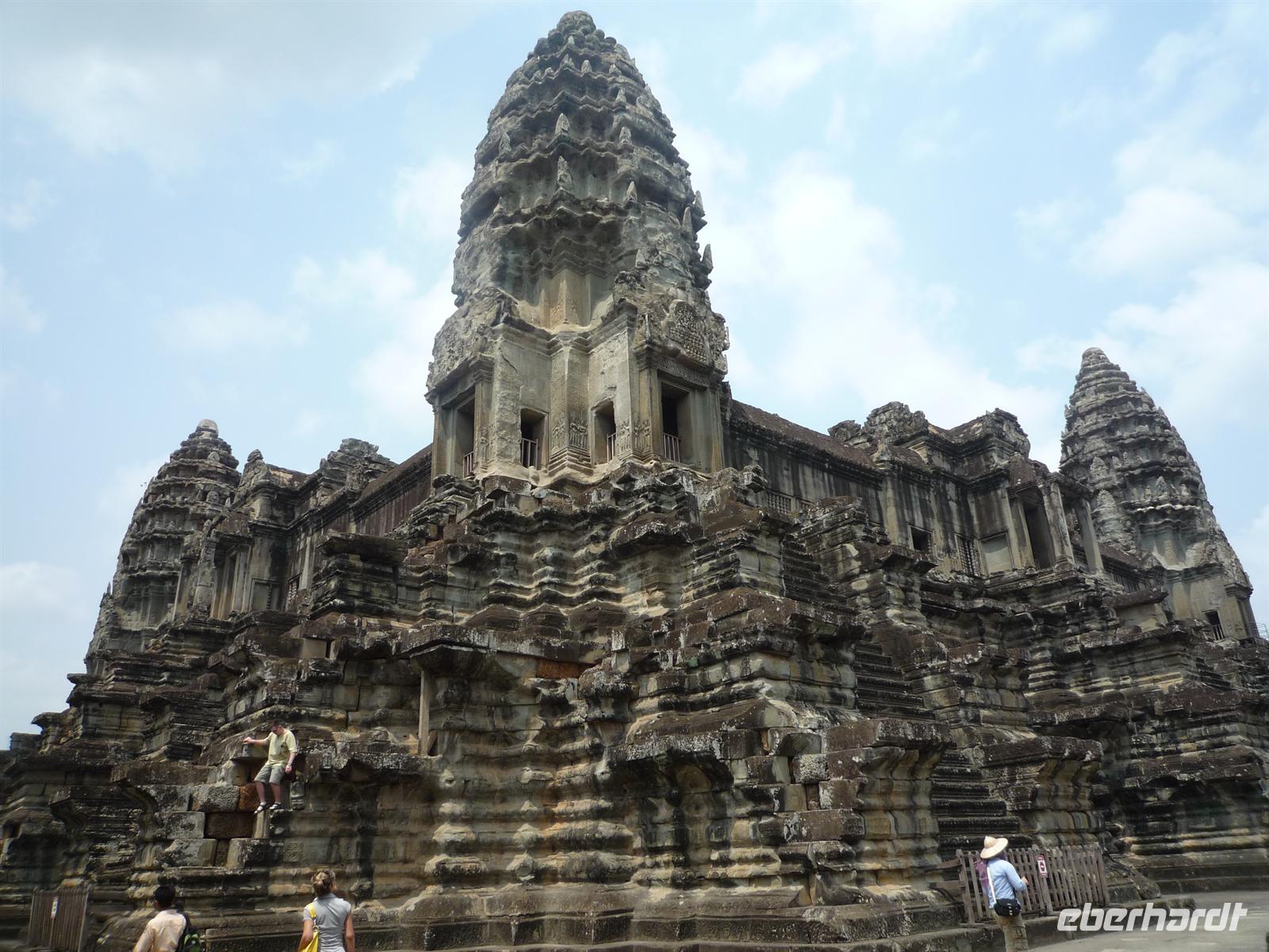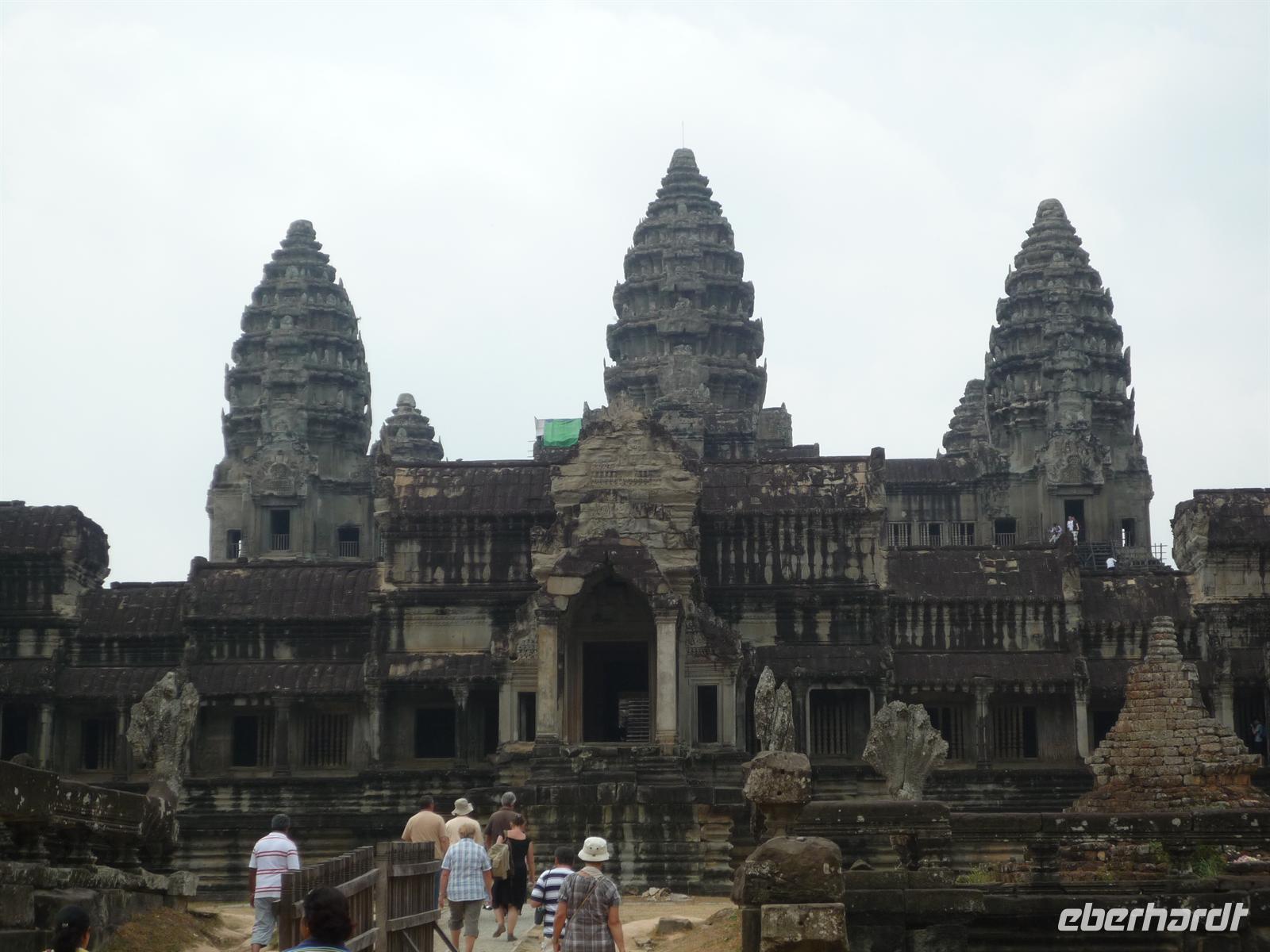 Ab heute steht mit Sicherheit einer der Höhepunkte auf dem Programm, die Besichtigung der Tempelanlagen von Angkor. Angkor bedeutet soviel wie Königsstadt oder Hauptstadt. Die meisten Besucher denken dabei vor allem an die beiden berühmten Tempel von Angkor Wat und Angkor Thom. Aber es gibt noch viele Tempel mehr, die in einem Zeitraum von mehr als 600 Jahren entstanden sind. Höhepunkt der Bauepoche waren dabei sicher die beiden schon genannten Anlagen. Wir besichtigen zuerst das unter König Suryavarmann II. erbaute Angkor Wat. Es ist ein beeindruckender Anblick schon zu Beginn des Rundgangs. Unser Reiseleiter Thol macht uns auf verschiedenen Details aufmerksam, erklärt die verschiedenen Reliefarten. Mit Hilfe einer Lotusblume erklärt er zum besseren verstehen, das architektonische Prinzip der Turmbauten und auch die immer wiederkehrenden Motive in den Wandverzierungen. Es gibt fast keinen Stein der nicht mit Verzierungen versehen ist. Immer wiederkehrendes Motiv sind auch Apsara-Tänzerinnen. Vorbei an den Bibliotheken gehen wir zur Nordost-Seite des Tempels. Von hier hat man einen Blick auf alle fünf Türme. Der mittlere und zugleich höchste Turm im Zentralheiligtum stellt den Berg Meru, den Berg der Götter, dar. Wir befinden uns jetzt in der ersten Galerie und das kann man ganz wörtlich nehmen. Hier befinden sich verschiedene, bis zu 100 m lange Reliefs mit Darstellungen aus dem Hinduismus. Der Erbauer war Anhänger dieser Religion, später wandte er sich dann zum Buddhismus. Daher hat Angkor - Königsstadt - noch einen Beinahmen bekommen. Mit Wat bezeichnen die Khmer einen buddhistischen Tempel. Die Reliefs zeigen Geschichten wie den Zweikampf zwischen Vishnu und den Dämonen Kalanemi oder Himmel und Hölle mit dem Totenrichter Yama und zahlreiche andere. Es ist faszinierend mit welchem Detailreichtum alle Reliefs ausgestattet sind. Man sieht zahlreiche Krieger, Elefanten, Götter und Dämonen und alles ist so gestaltet, das sich eine Geschichte erzählen lässt. Diese für uns fremde Götterwelt lässt sich dadurch etwas besser erfassen. Anschließend gehen wir auf die nächste Galerie und stehen in einem Hofraum. Vor uns ist jetzt das Zentralheiligtum mit seinen markanten Türmen, die 3. Ebende. Da heute Buddhatag ist, ist sie aber geschlossen. Wir werden aber morgen wieder kommen. Langsam begeben wir uns wieder nach unten und gehen dann langsam wieder zurück zum Haupteingang. Immer mal wieder einen Blick zurück nehmend verlassen wir dieses gewaltige Zeugnis aus dem 12. Jh.Inzwischen sind über drei Stunden vergangen und wir machen zuerst eine Mittagspause.