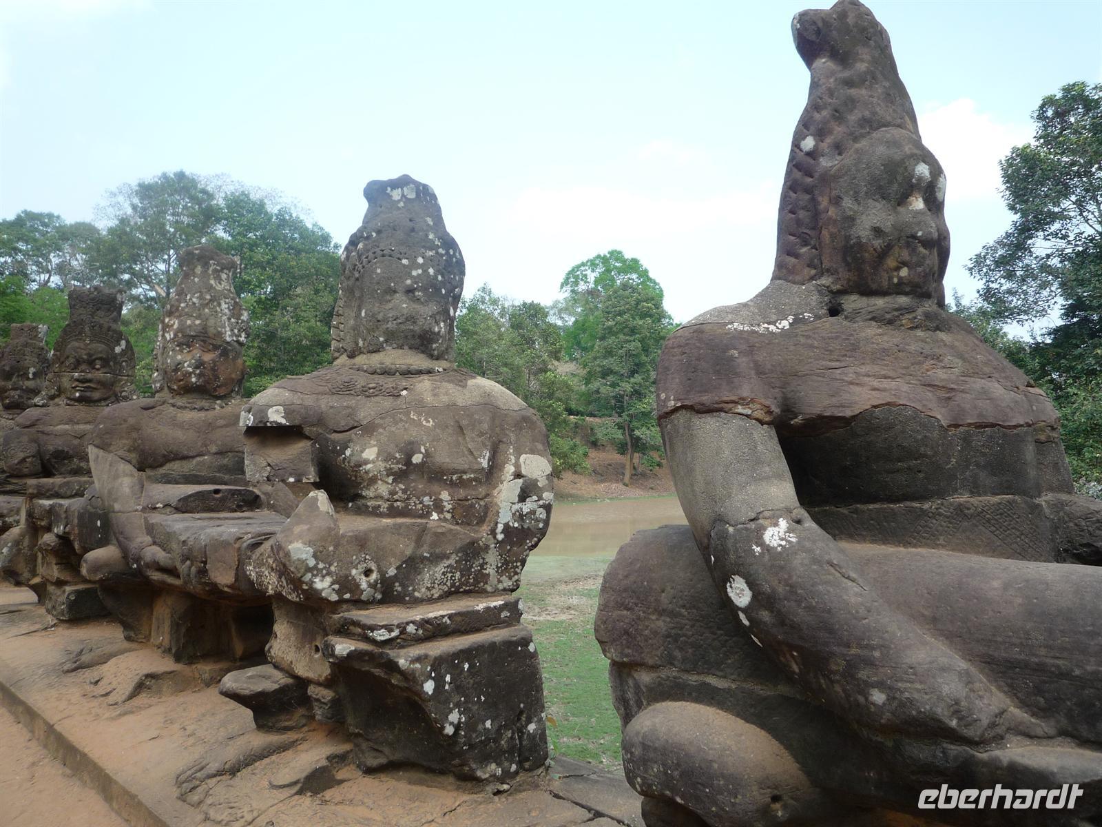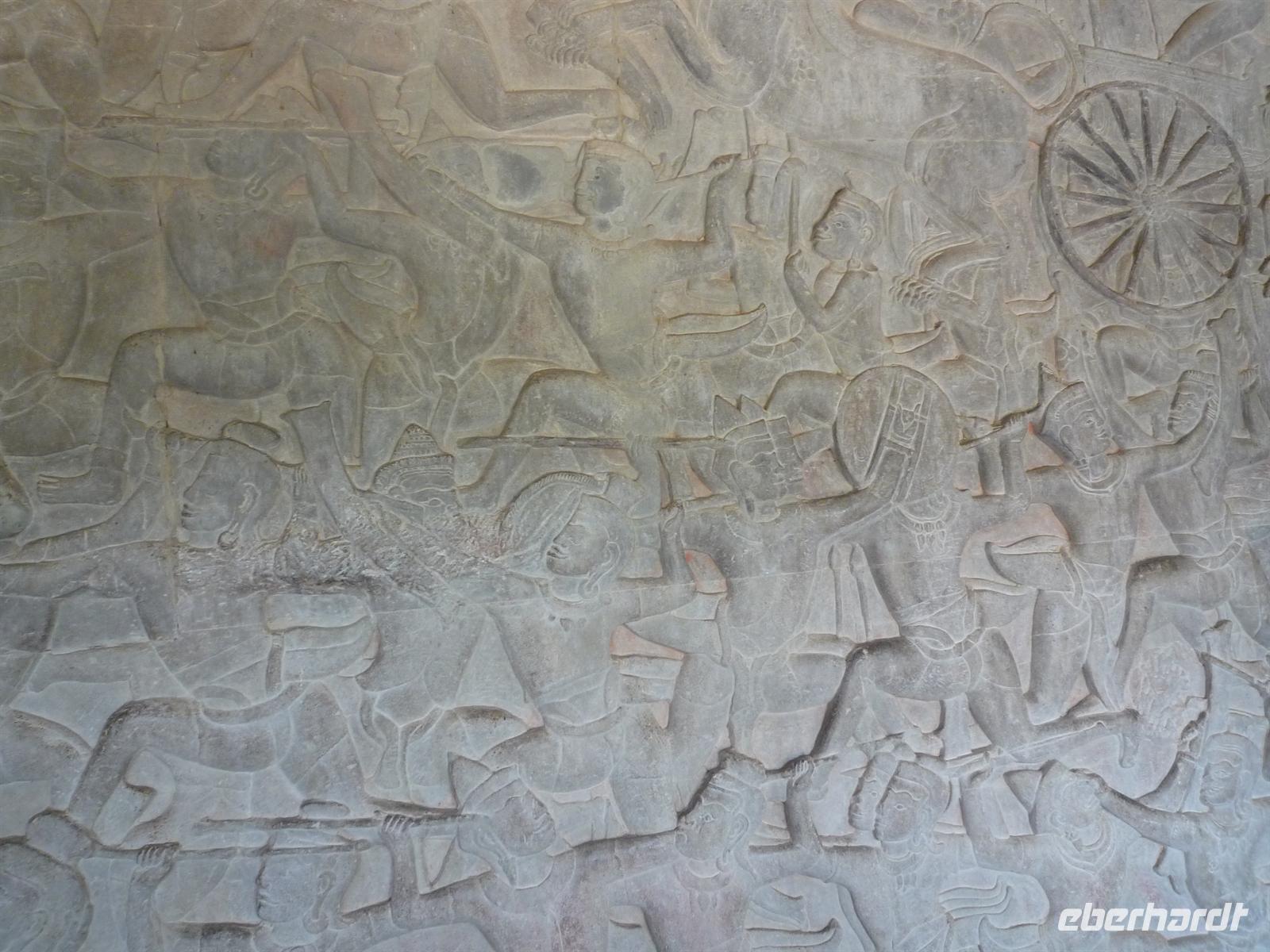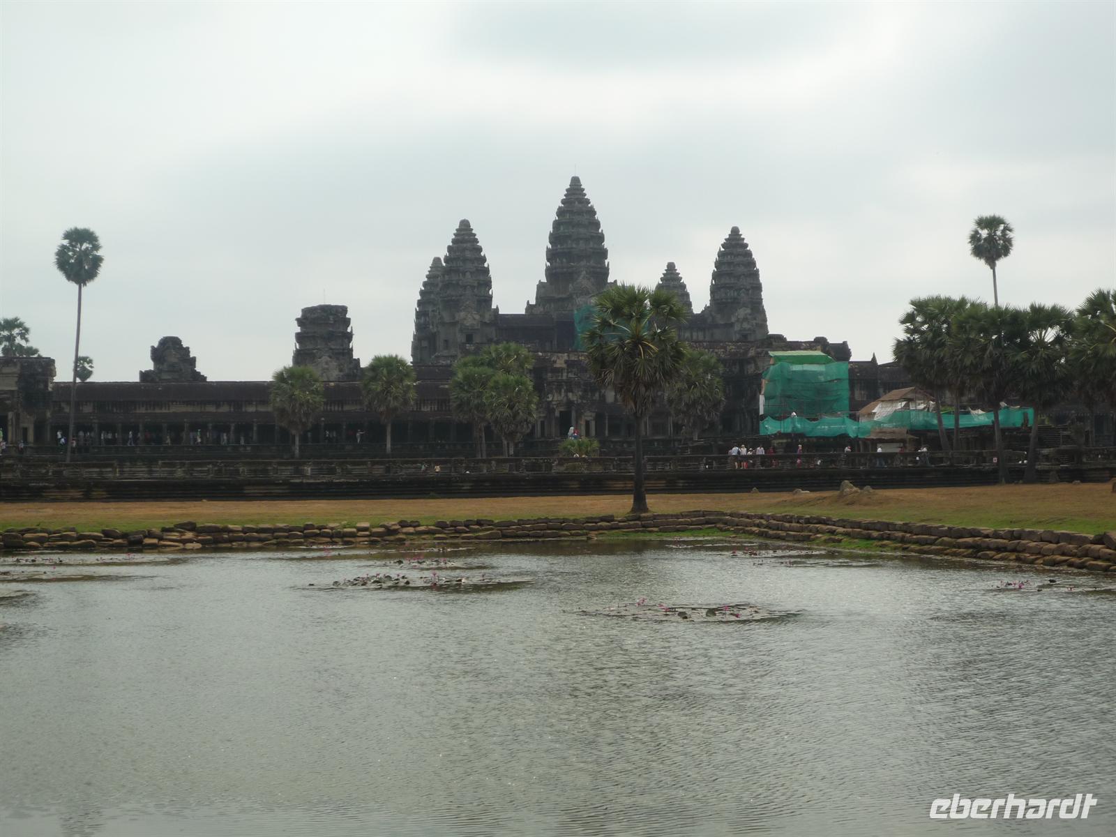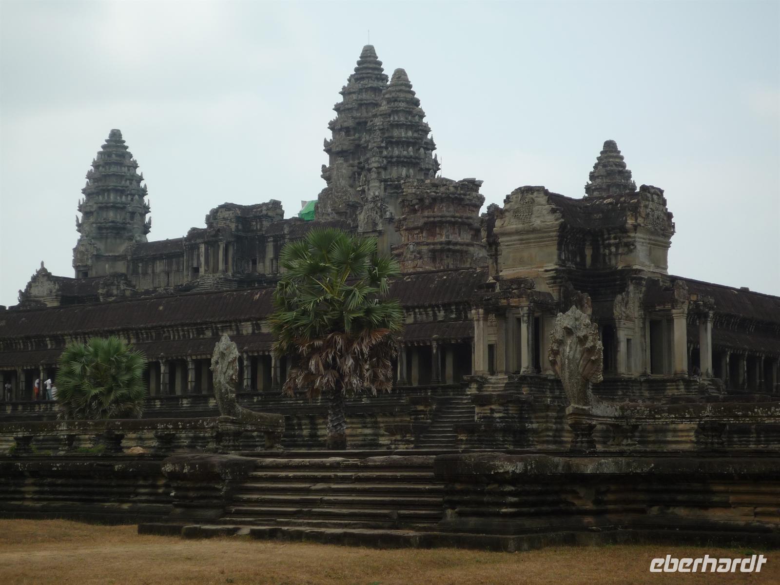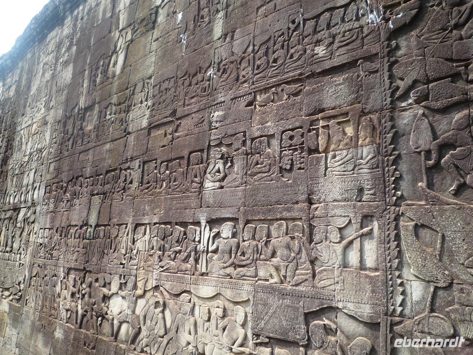 Ab heute steht mit Sicherheit einer der Höhepunkte auf dem Programm, die Besichtigung der Tempelanlagen von Angkor. Angkor bedeutet soviel wie Königsstadt oder Hauptstadt. Die meisten Besucher denken dabei vor allem an die beiden berühmten Tempel von Angkor Wat und Angkor Thom. Aber es gibt noch viele Tempel mehr, die in einem Zeitraum von mehr als 600 Jahren entstanden sind. Höhepunkt der Bauepoche waren dabei sicher die beiden schon genannten Anlagen. Wir besichtigen zuerst das unter König Suryavarmann II. erbaute Angkor Wat. Es ist ein beeindruckender Anblick schon zu Beginn des Rundgangs. Unser Reiseleiter Thol macht uns auf verschiedenen Details aufmerksam, erklärt die verschiedenen Reliefarten. Mit Hilfe einer Lotusblume erklärt er zum besseren verstehen, das architektonische Prinzip der Turmbauten und auch die immer wiederkehrenden Motive in den Wandverzierungen. Es gibt fast keinen Stein der nicht mit Verzierungen versehen ist. Immer wiederkehrendes Motiv sind auch Apsara-Tänzerinnen. Vorbei an den Bibliotheken gehen wir zur Nordost-Seite des Tempels. Von hier hat man einen Blick auf alle fünf Türme. Der mittlere und zugleich höchste Turm im Zentralheiligtum stellt den Berg Meru, den Berg der Götter, dar. Wir befinden uns jetzt in der ersten Galerie und das kann man ganz wörtlich nehmen. Hier befinden sich verschiedene, bis zu 100 m lange Reliefs mit Darstellungen aus dem Hinduismus. Der Erbauer war Anhänger dieser Religion, später wandte er sich dann zum Buddhismus. Daher hat Angkor - Königsstadt - noch einen Beinahmen bekommen. Mit Wat bezeichnen die Khmer einen buddhistischen Tempel. Die Reliefs zeigen Geschichten wie den Zweikampf zwischen Vishnu und den Dämonen Kalanemi oder Himmel und Hölle mit dem Totenrichter Yama und zahlreiche andere. Es ist faszinierend mit welchem Detailreichtum alle Reliefs ausgestattet sind. Man sieht zahlreiche Krieger, Elefanten, Götter und Dämonen und alles ist so gestaltet, das sich eine Geschichte erzählen lässt. Diese für uns fremde Götterwelt lässt sich dadurch etwas besser erfassen. Anschließend gehen wir auf die nächste Galerie und stehen in einem Hofraum. Vor uns ist jetzt das Zentralheiligtum mit seinen markanten Türmen, die 3. Ebende. Da heute Buddhatag ist, ist sie aber geschlossen. Wir werden aber morgen wieder kommen. Langsam begeben wir uns wieder nach unten und gehen dann langsam wieder zurück zum Haupteingang. Immer mal wieder einen Blick zurück nehmend verlassen wir dieses gewaltige Zeugnis aus dem 12. Jh.Inzwischen sind über drei Stunden vergangen und wir machen zuerst eine Mittagspause.
